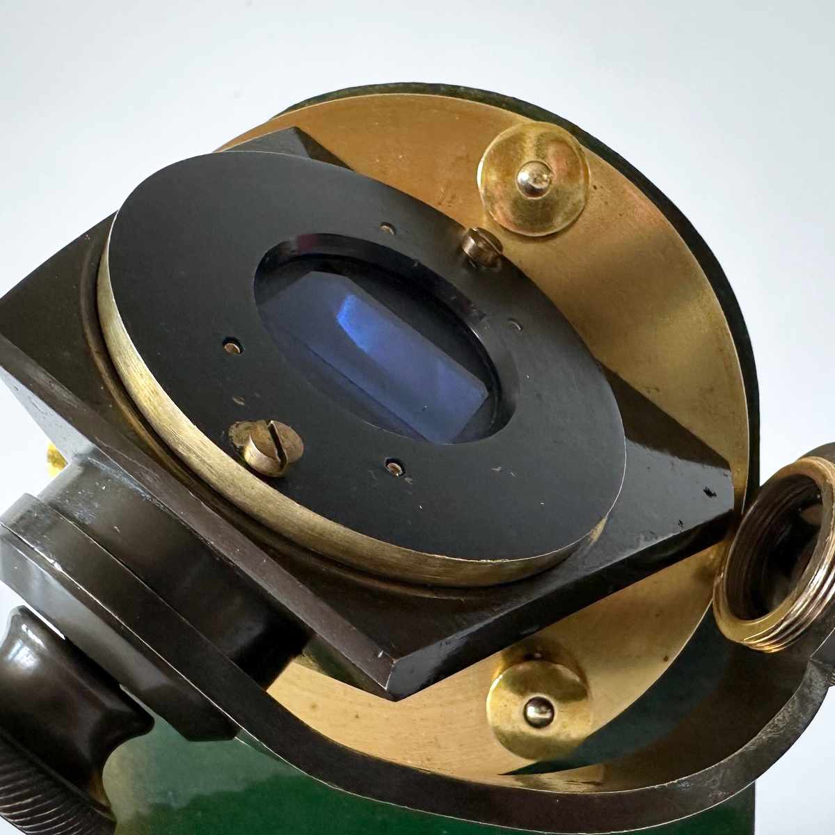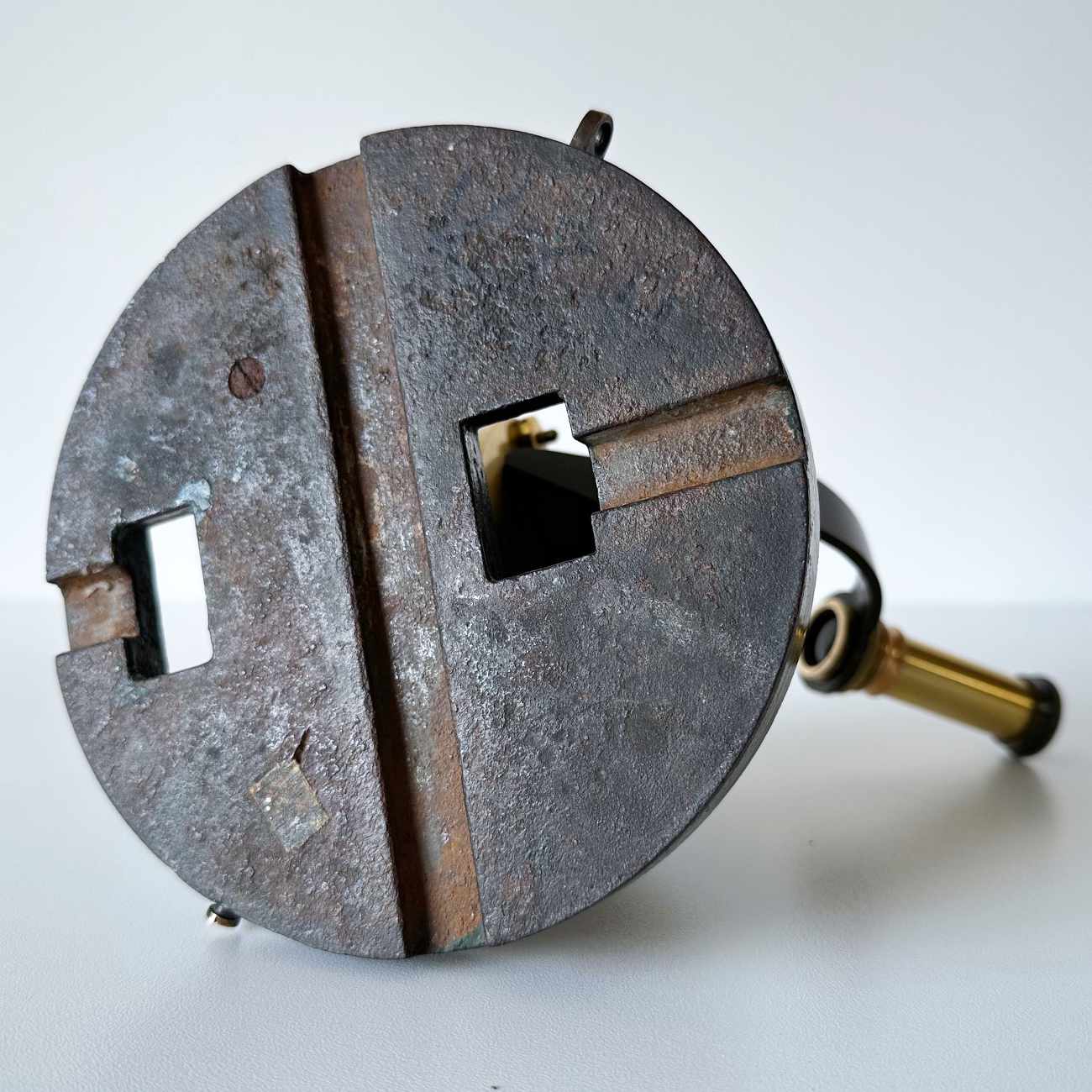 This ingenious device uses a contrivance of mirrors within its solid brass body to reflect two shadow images of the sun once it is correctly positioned in the meridian. As noon is reached, the shadows of the sun close upon one another and three measurements are recorded. The first observation is the initial contact of the two sun reflections in the dipeidoscope, the second when they exactly coincide and then the final observation is taken when the edges of the two images part from one another. The mean average of all of these events should allow the user to correct their timepieces to true noon.