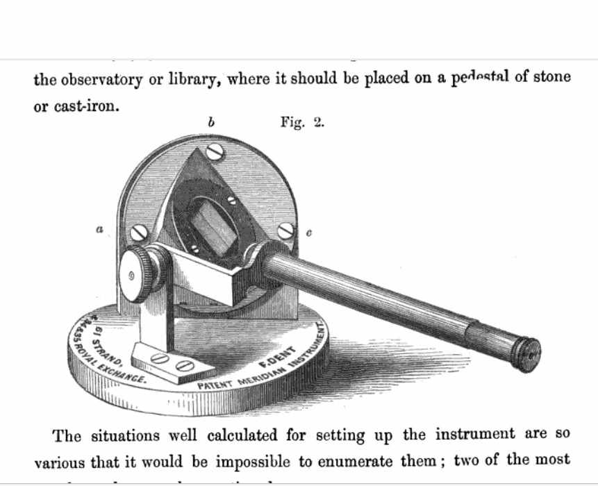 “Dipleidoscope fitted up with a telescope, and having all the usual meridian and vertical adjustments, to be effected by means of three mount screws. This form of mounting the instrument is suited to the observatory or library, where it should be placed on a pedestal of stone or cast iron.”