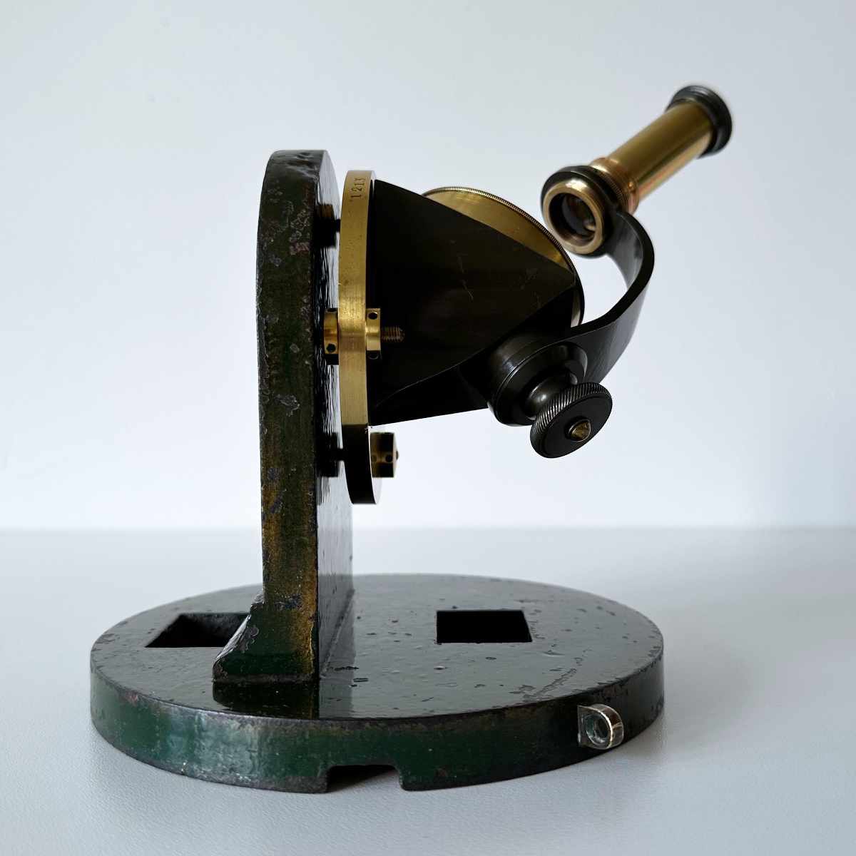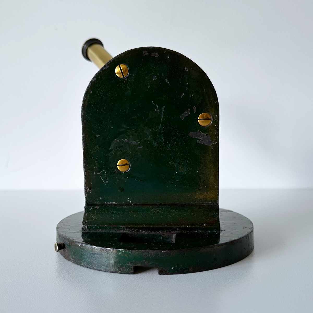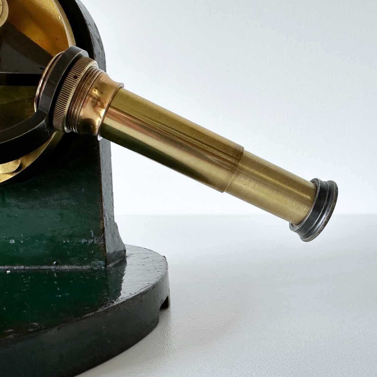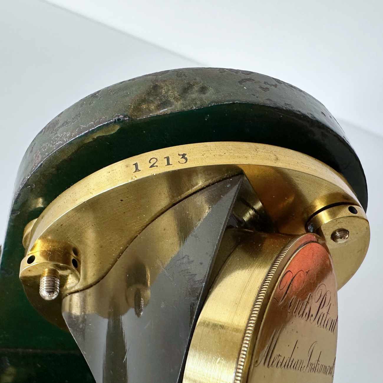 The mount is further attached to a heavy iron platform with screw for fine adjustment of the instruments position when in situ. The green painted iron base has two further receiving holes and large groove underneath which clearly would have been used to seat the instrument on a pre-defined base. This would allow the instrument to be removed for its protection and storage and would allow it to be reseated for use without the need for repeat calibration.