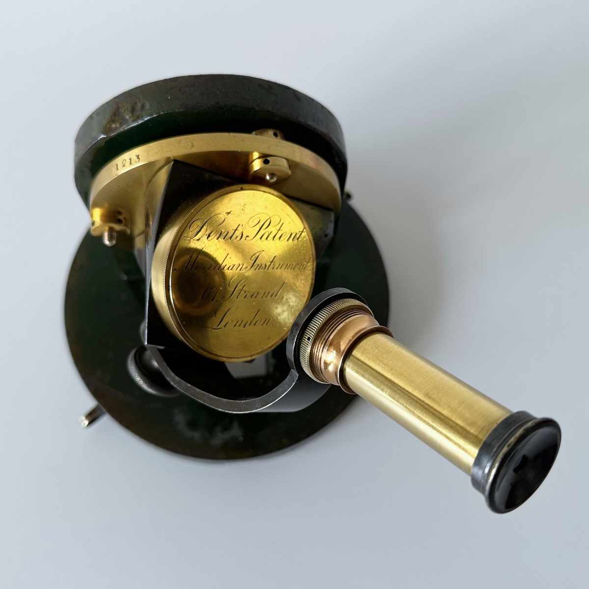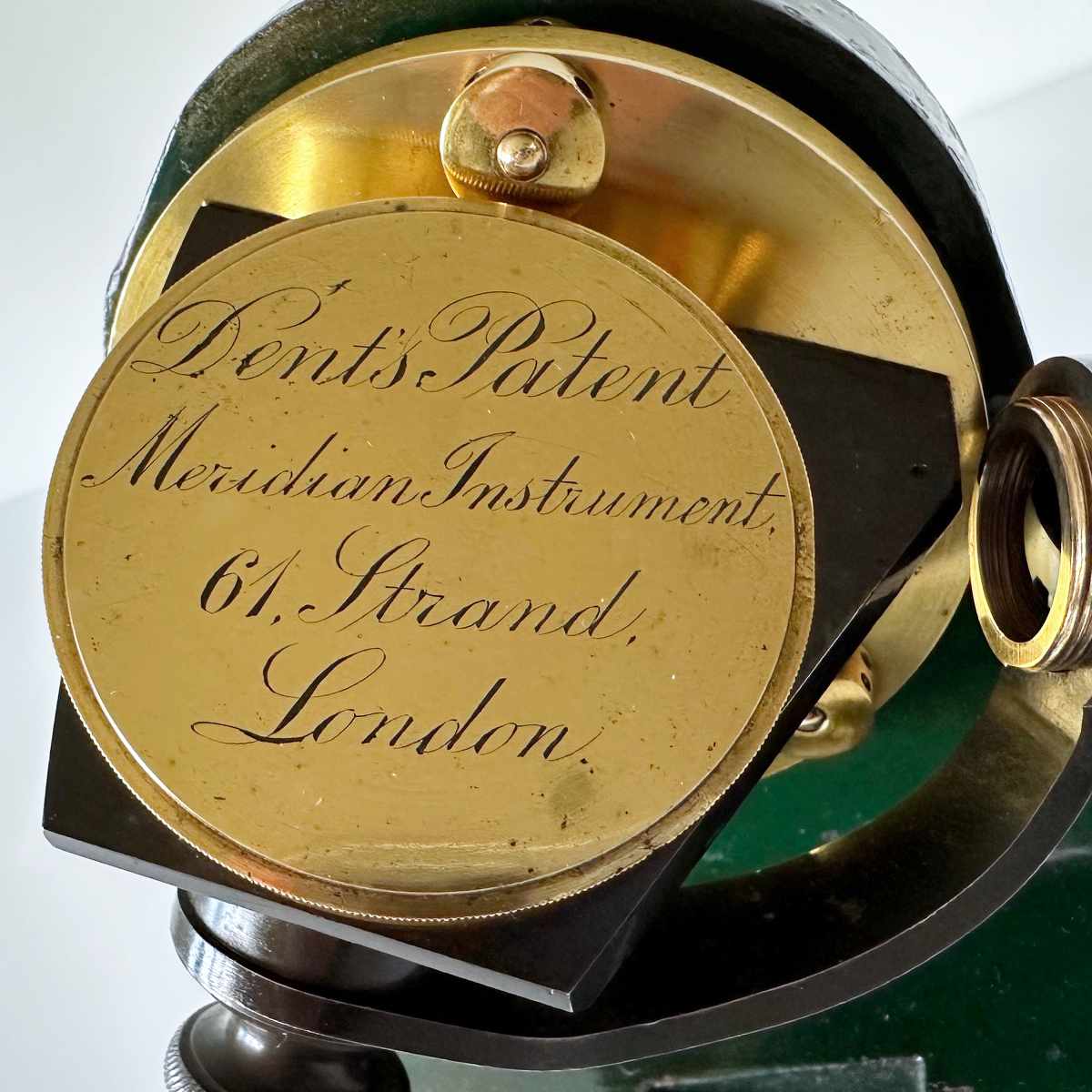 A very rare variant of this rare instrument, it comes complete with its dust cap stating, “Dent’s Patent Meridian Instrument, 61 Strand, London”, an adjustable, red filtered telescope lens attachment to allow the user a focused view of their observations and is attached to a brass circular mount with engraved reference number, “1213”.
