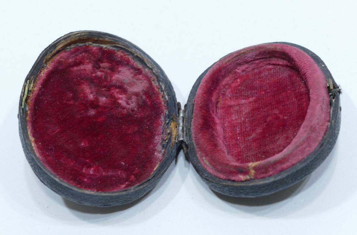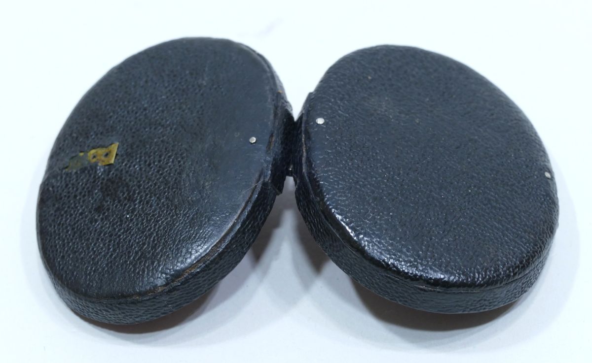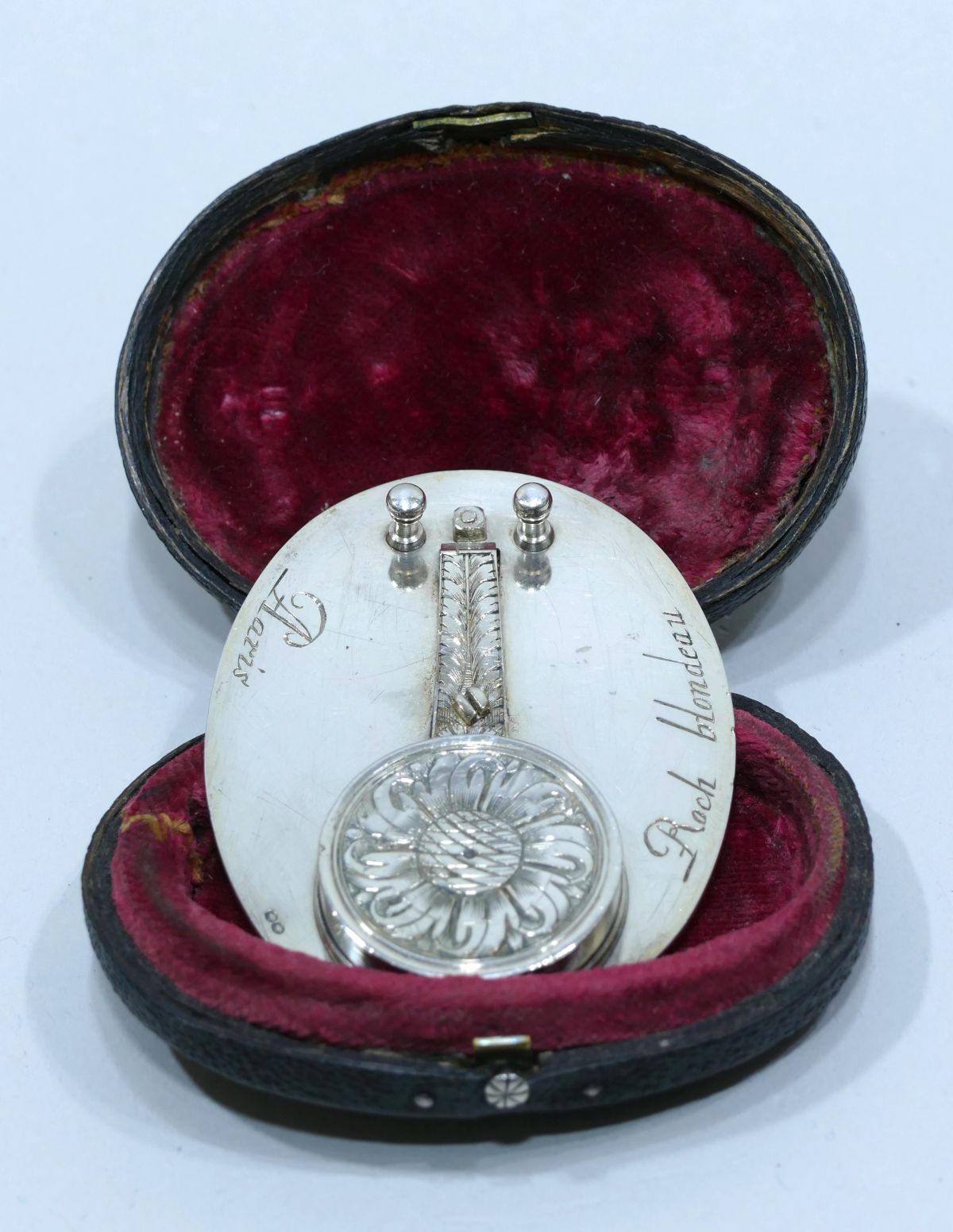 There is also a rosette decoration of acanthus leaves on the back of the compass and on the gnomon spring. In its original black leather case with burgundy velvet interior, note a small loss on the back.