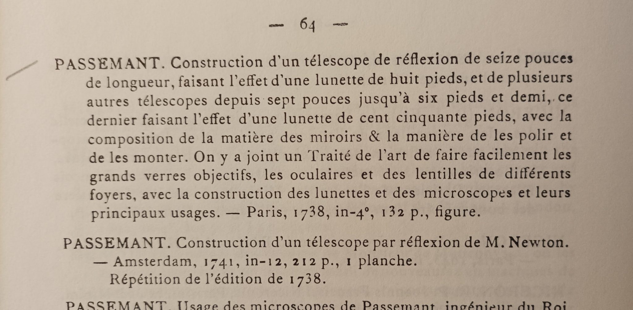 Construction d’un télescope de réflexion de seize pouces de longueur, faisant l’effet d’une lunette de huit pieds, et de plusieurs autres télescopes, depuis sept pouces jusqu’à six pied et demi [.] On y a joint un Traité de l’art de faire facilement les grands verres objectifs, les oculaires et les lentilles de differens foyers, avec la construction des lunettes et des microscopes, et leurs principaux usages.