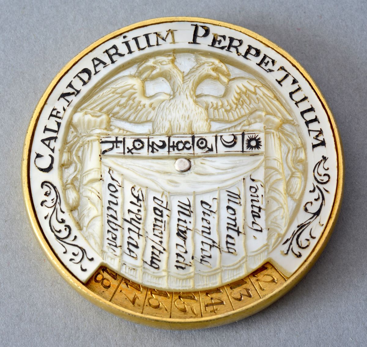 The upper disc in mother-of-pearl, called ‘CALENDARIUM PERPETUUM’ (perpetual calendar), features a scale of the days of the week with their corresponding astronomical symbols. This disc has a window along the edge for reading the days and is engraved in the centre with a double-headed eagle in relief.
