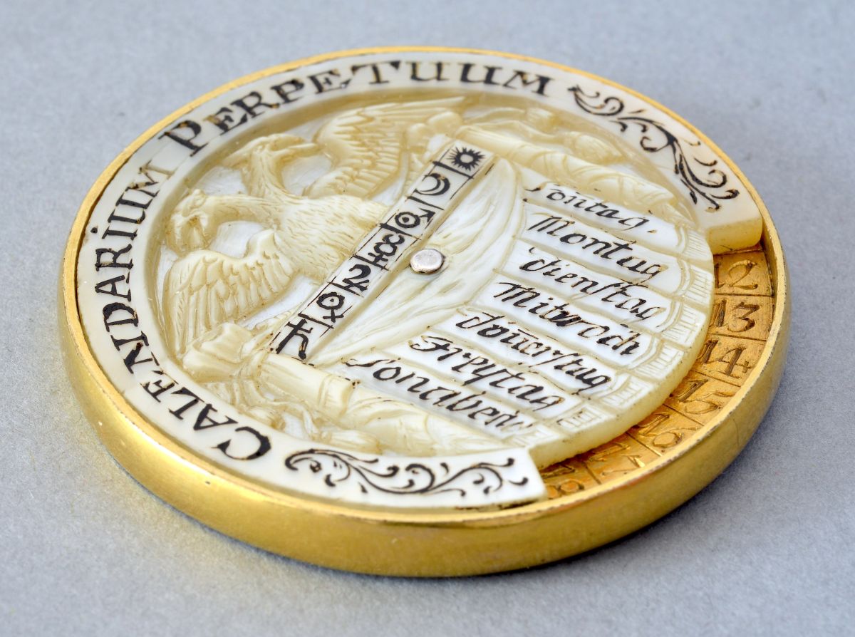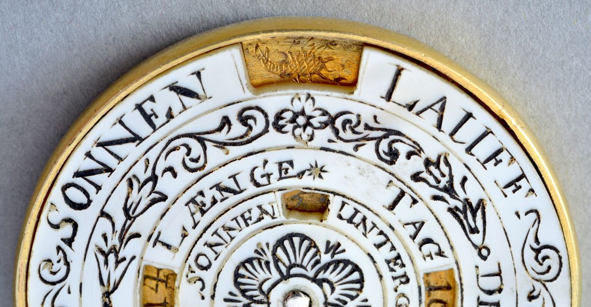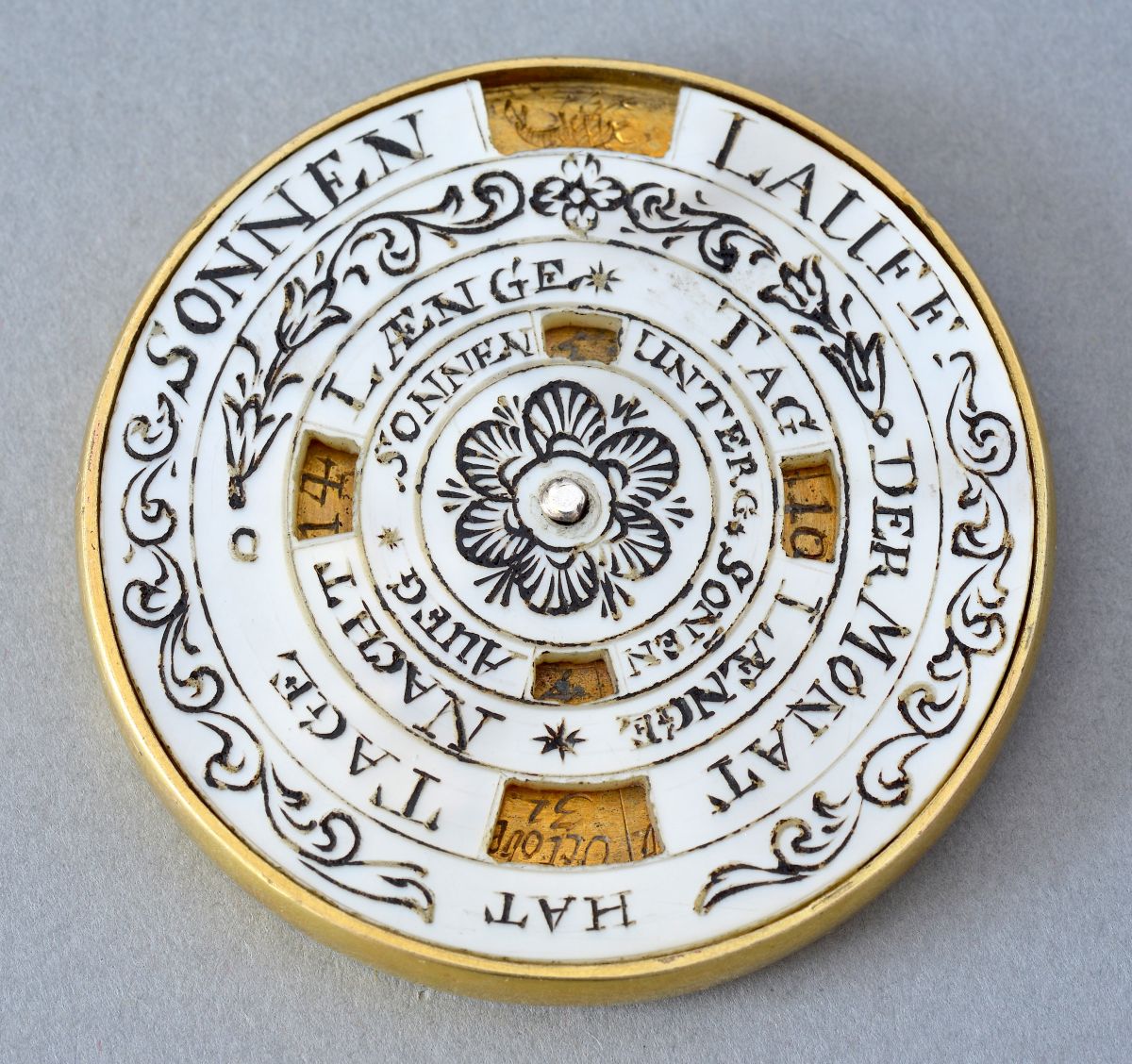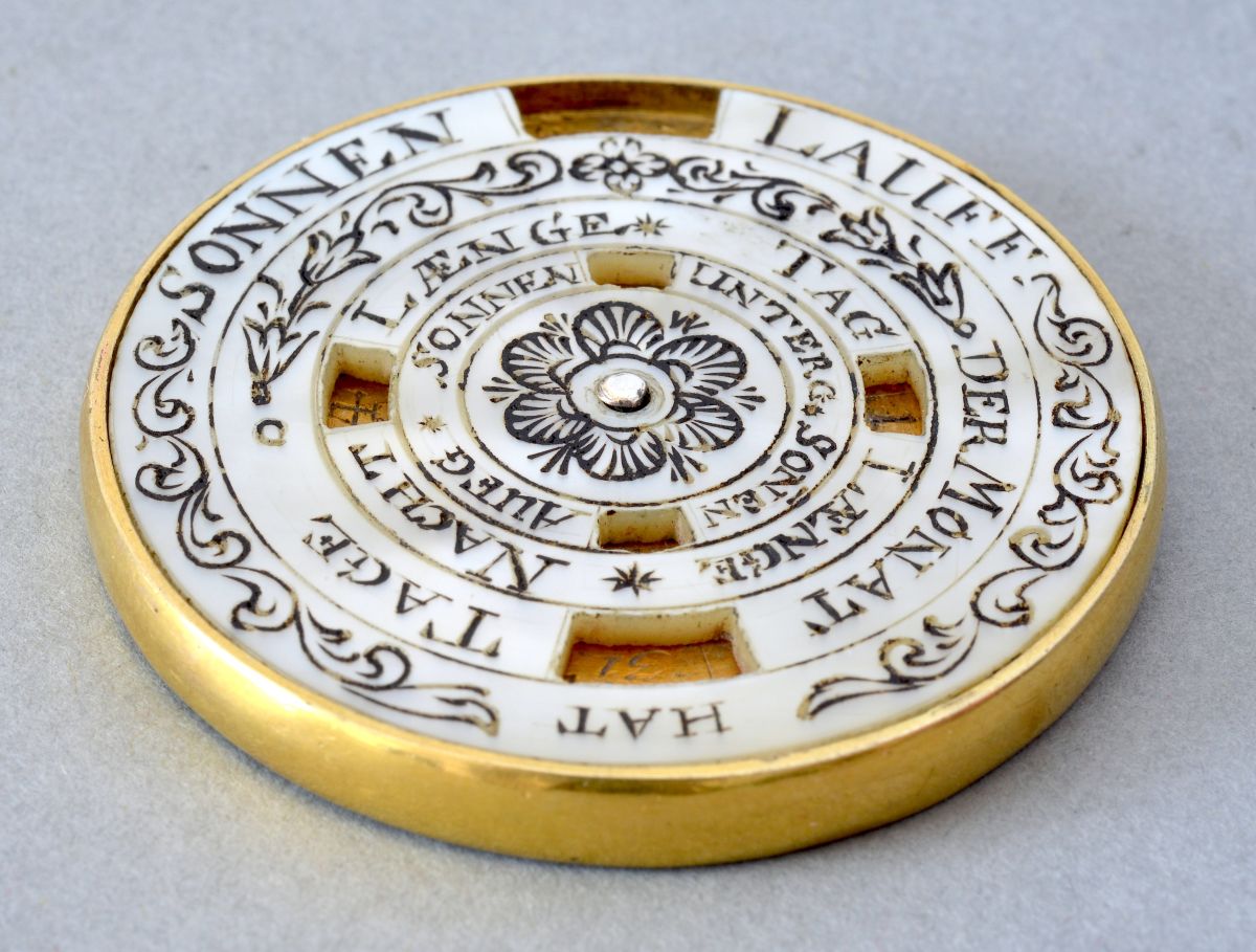 The lower disc, also made of mother-of-pearl, has six small windows allowing the reader to see, respectively: the sun’s path through the zodiac (‘SONNEN LAUFF’), the month (‘DER MONAT TAGE’), the length of the day (‘TAG LAENGE’), the length of the night (‘NACHT LAENGE’), the time of sunset (‘SONNEN UNTERG’) and the time of sunrise (‘SONEN AUFG’). A rosette in the centre.