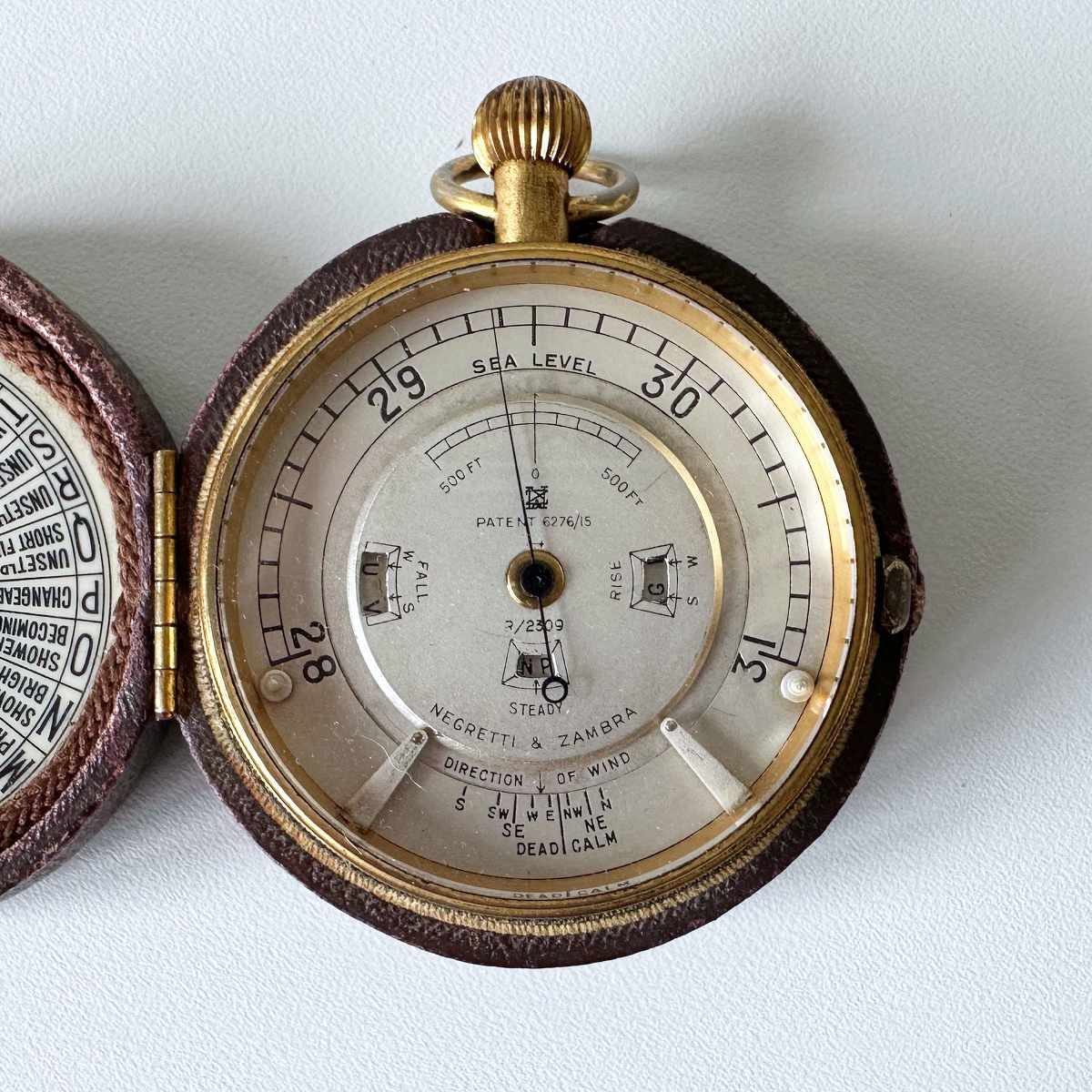 For sale a pocket weather forecasting aneroid barometer in original case by Negretti & Zambra.