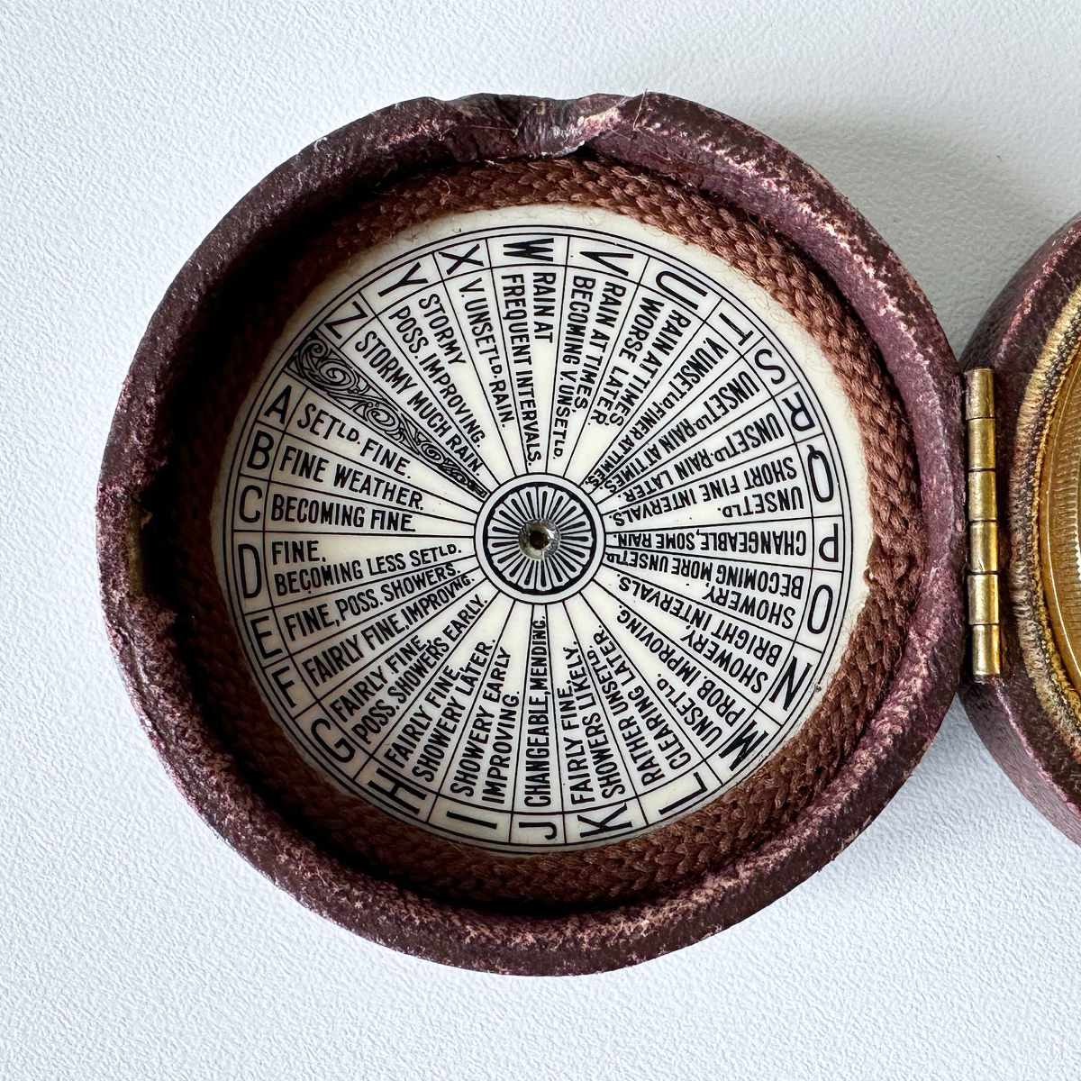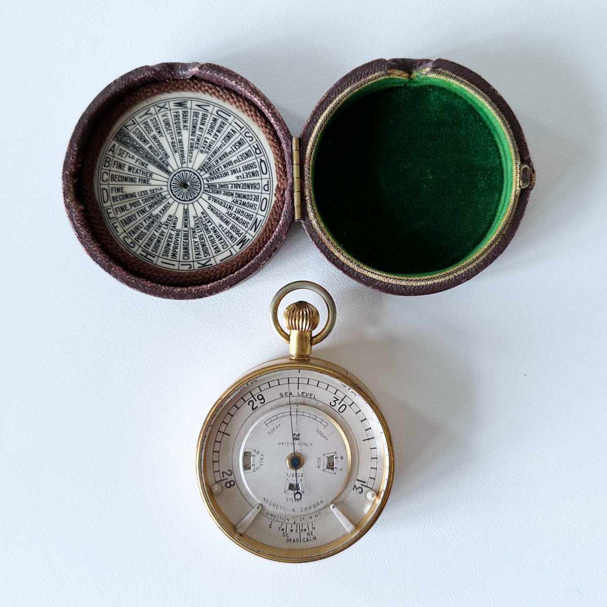 The hinged case is covered with Morocco leather with push clasp at the side, the interior is further provided with a green silk velvet lining to ensure that the barometer is protected. The lid is also fitted with another ivorine Negretti patent weather forecasting key which allows the observer to take readings without the need to remove the barometer from the case to observe the back, a feature that shows the amount of thought that went into the design of this fine instrument.