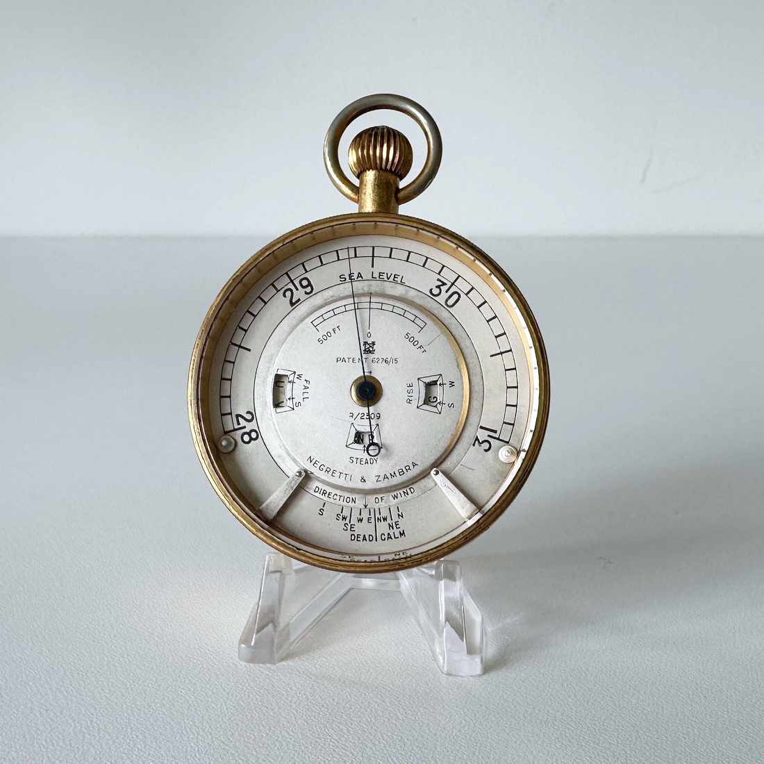 The silvered dial is engraved with the company’s “NZ” trademark and the patent No: 6276/15 below. It also has another serial no: R/2309 below with “Negretti & Zambra” engraved in full. The three cut out sections on the central dial engraved, Rise, Steady & Fall relating to the movement of the barometer pressure at the time of the reading, this ensures that the observer uses the correct letter to read the forecast.