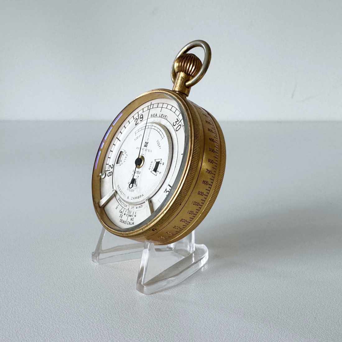 This pocket barometer represented one of the most luxurious offerings by the company during the period and effectively provided the same features as its larger cased counterpart but in a size that could be carried in the waistcoat pocket. They are rarely seen today and even more seldom seen in this condition.