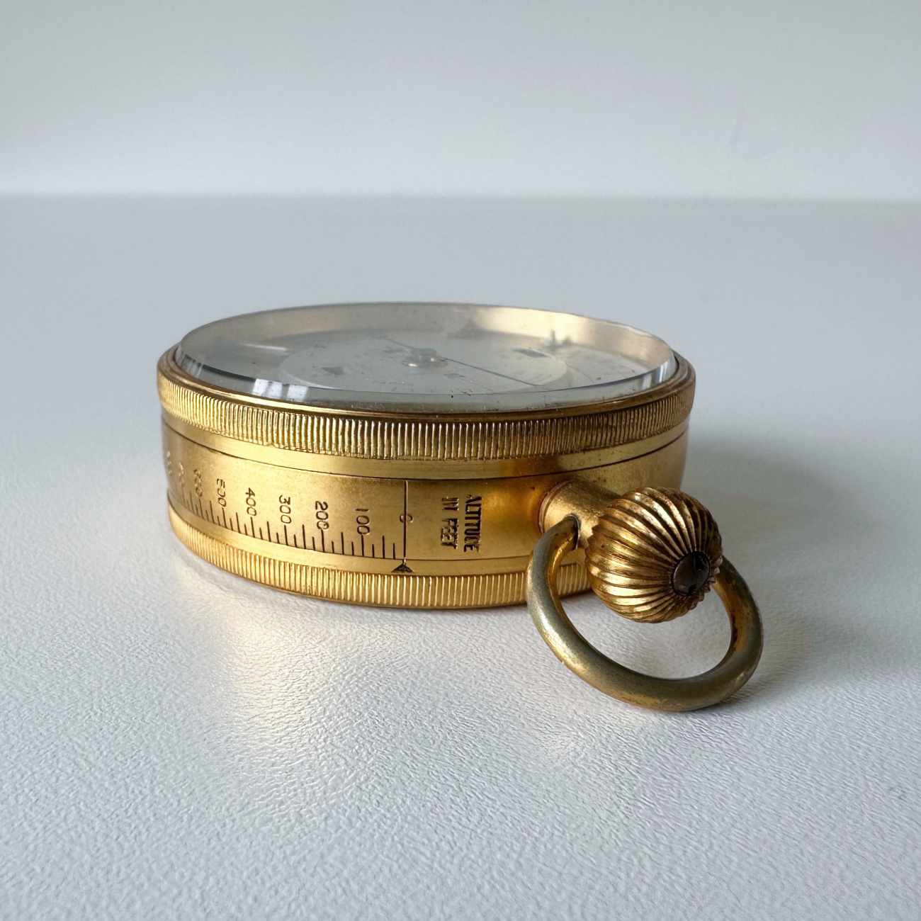 The three quarter inch deep case is engraved with an “altitude in feet” scale around the circumference which is operated by twisting a bezel at the back of the case allowing the barometer hand to be adjusted to the appropriate height above sea level thus providing accurate measurement in the given area of the country in which it is being operated.
