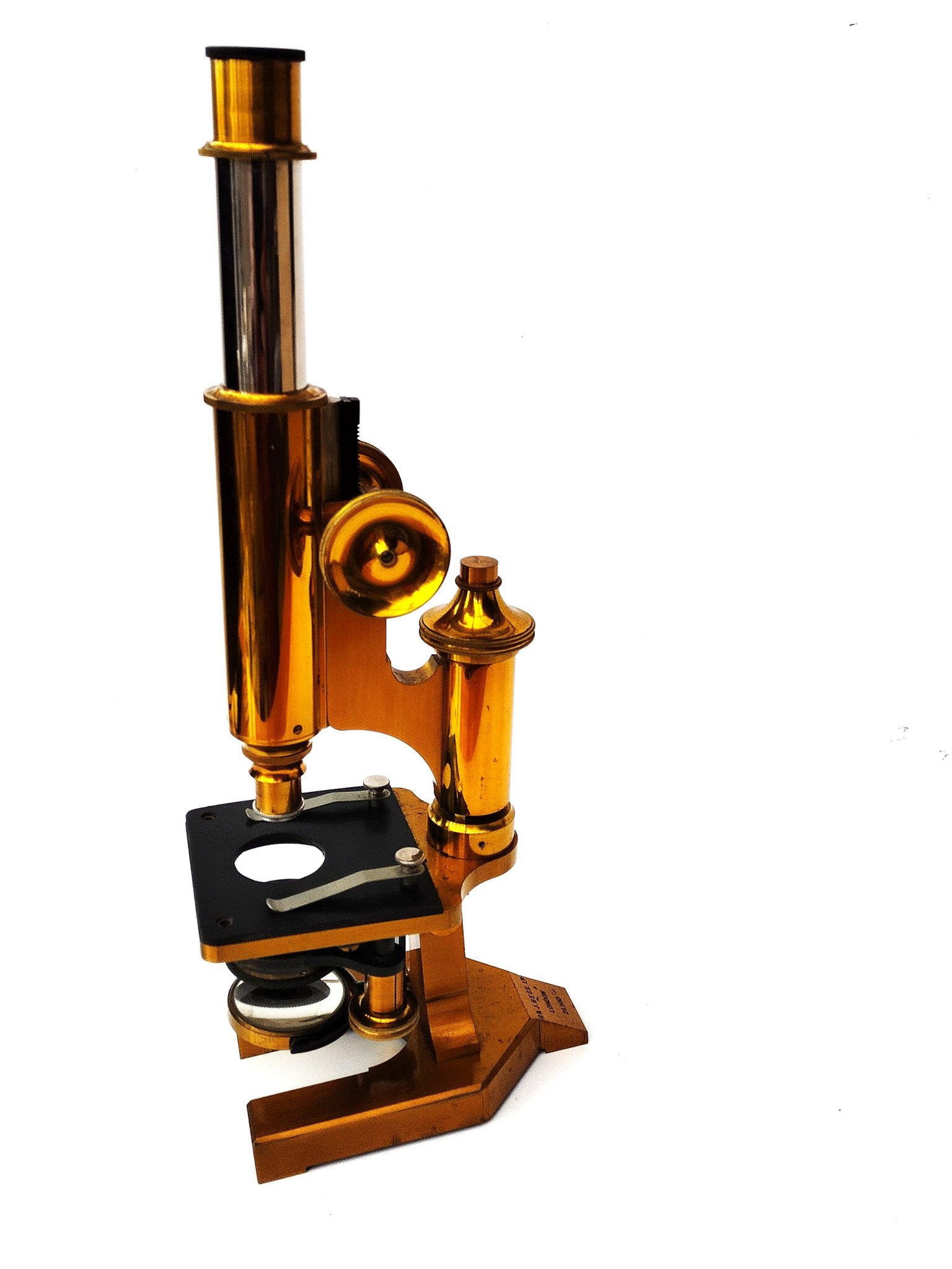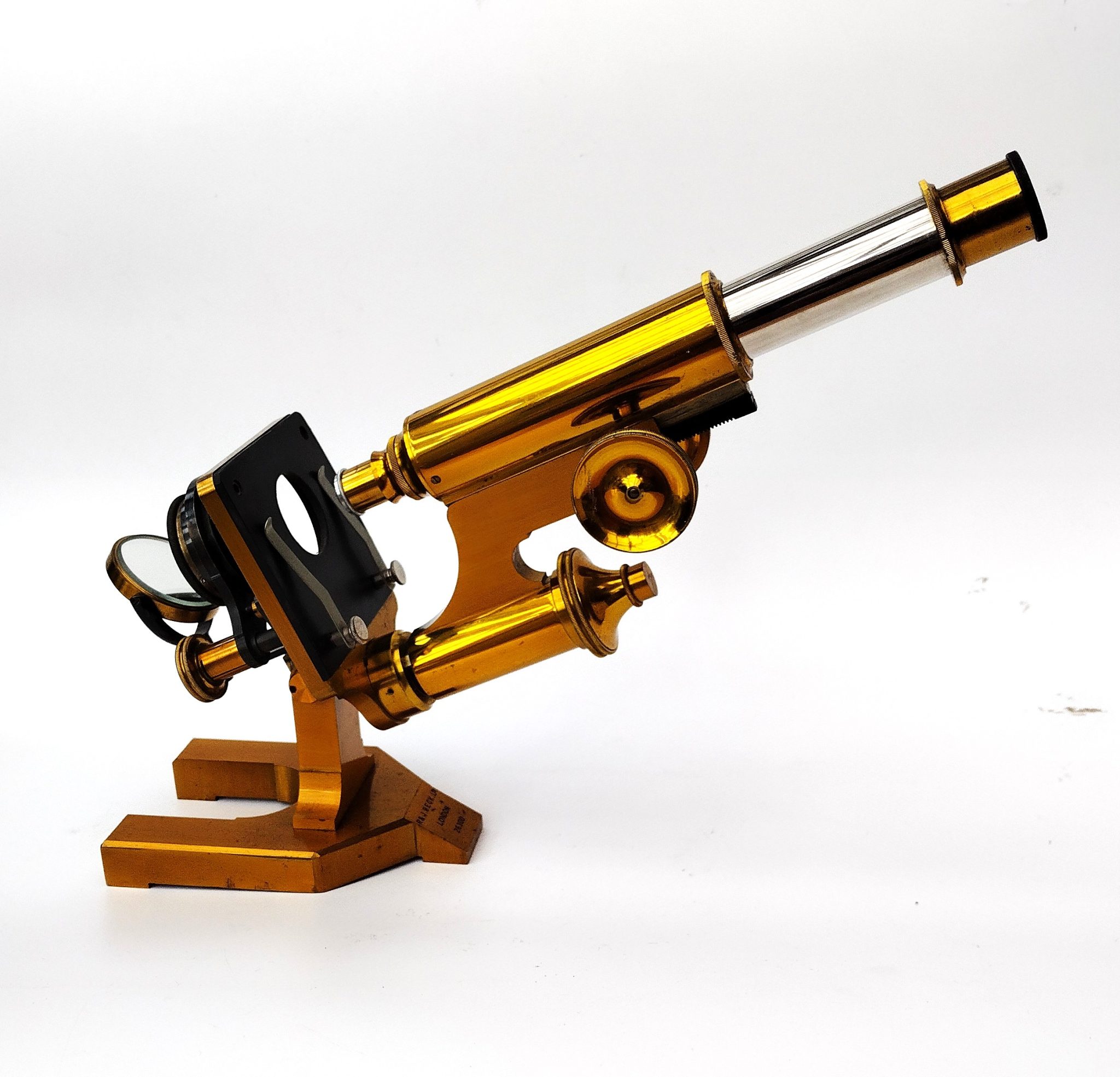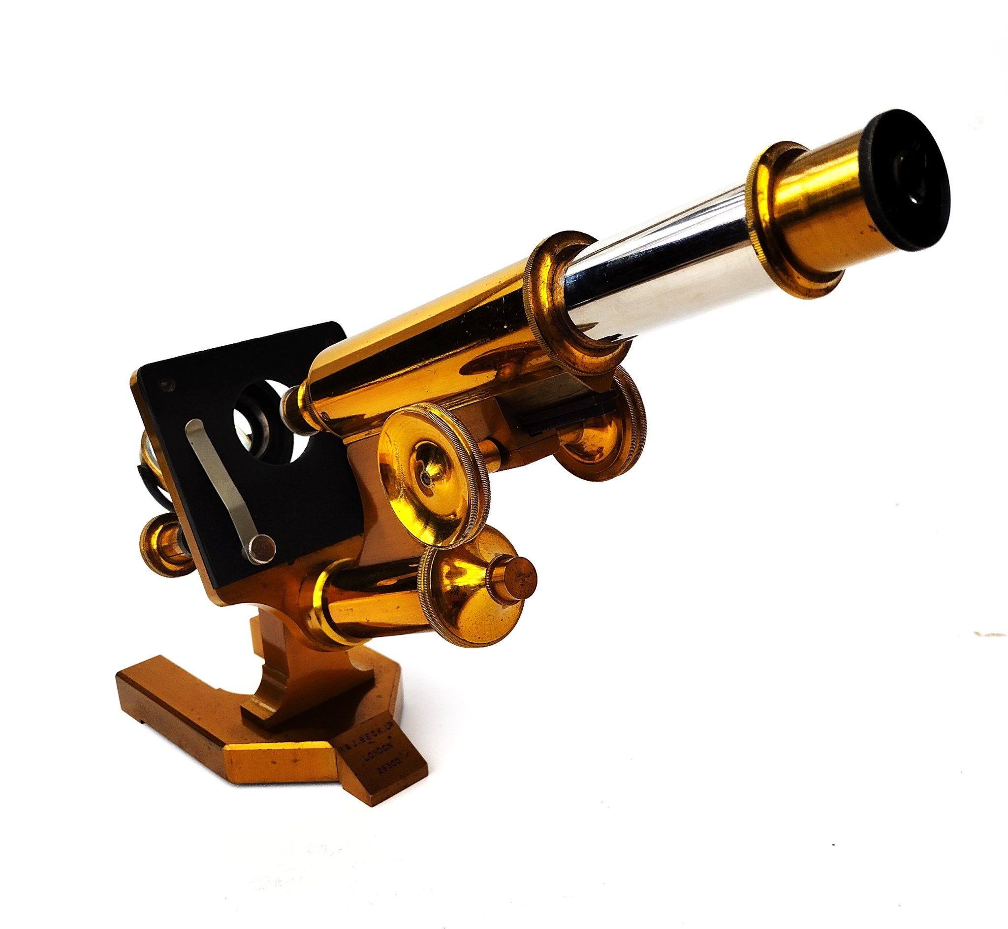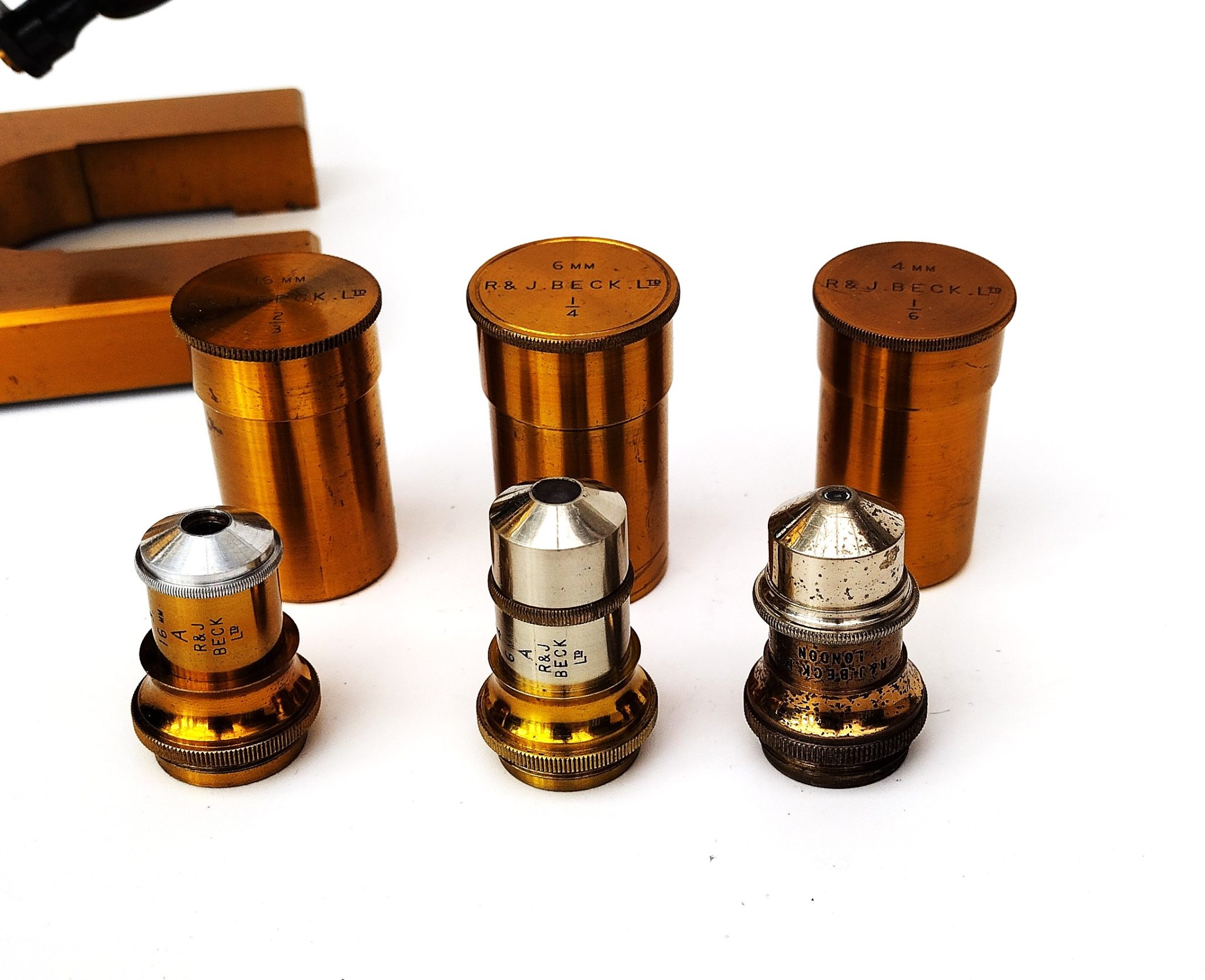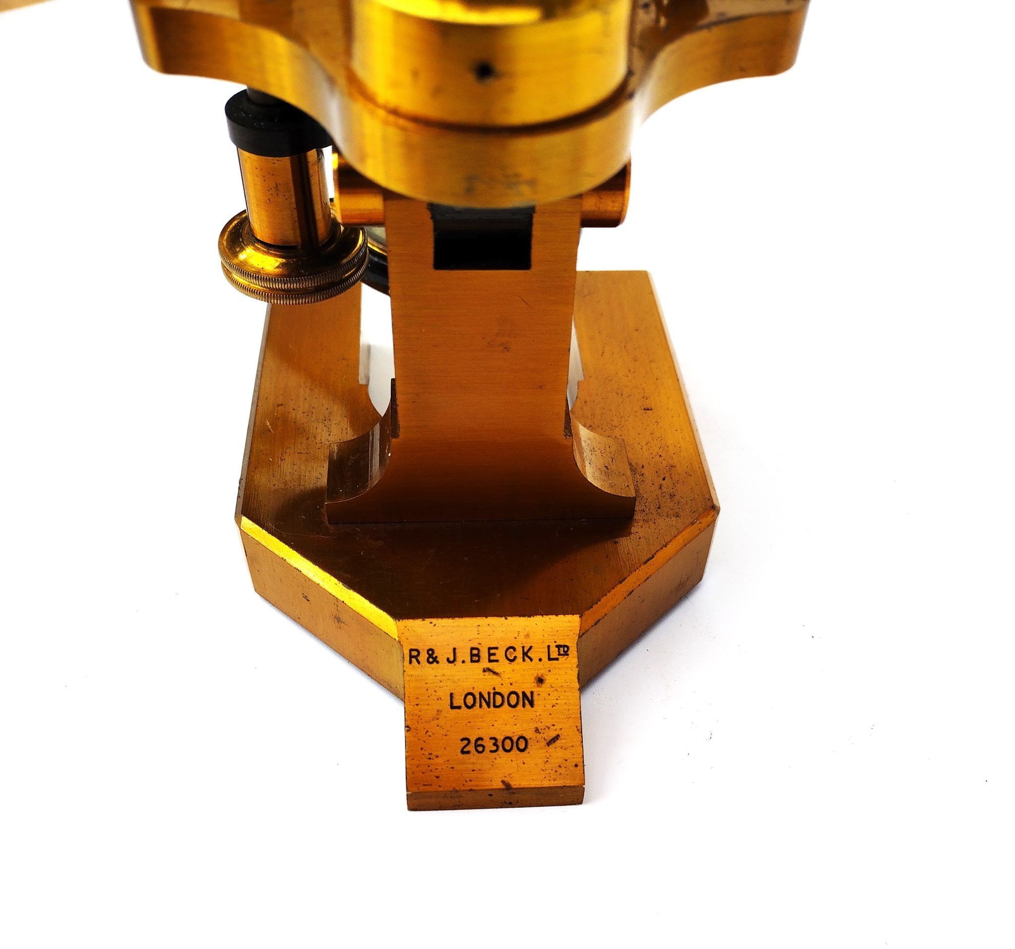 A monocular brass microscope engraved, ‘R & J Beck Ltd, London, 26300’ with coarse and fine focus wheels, graduated draw tube, plano / concave mirror and sub stage diaphragm.