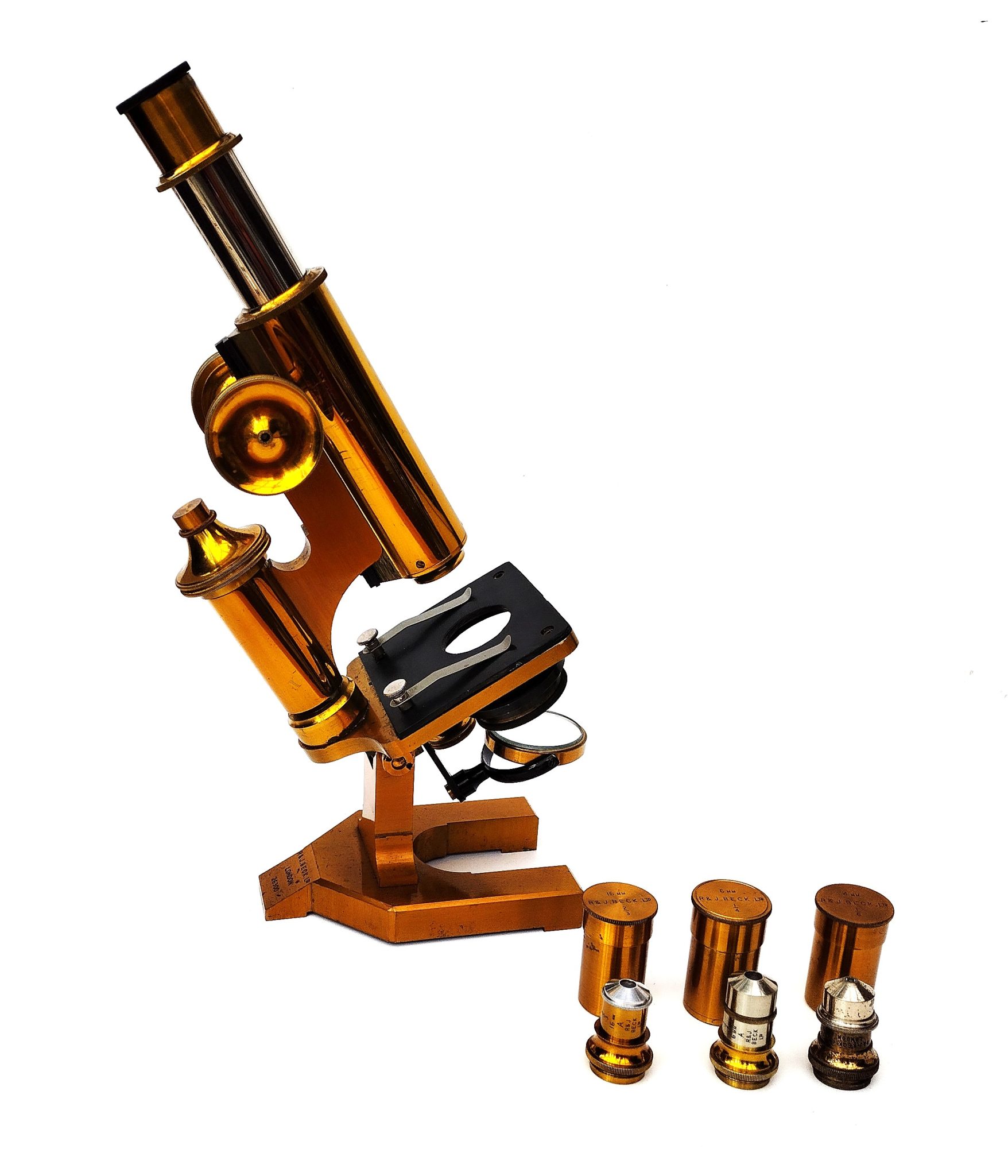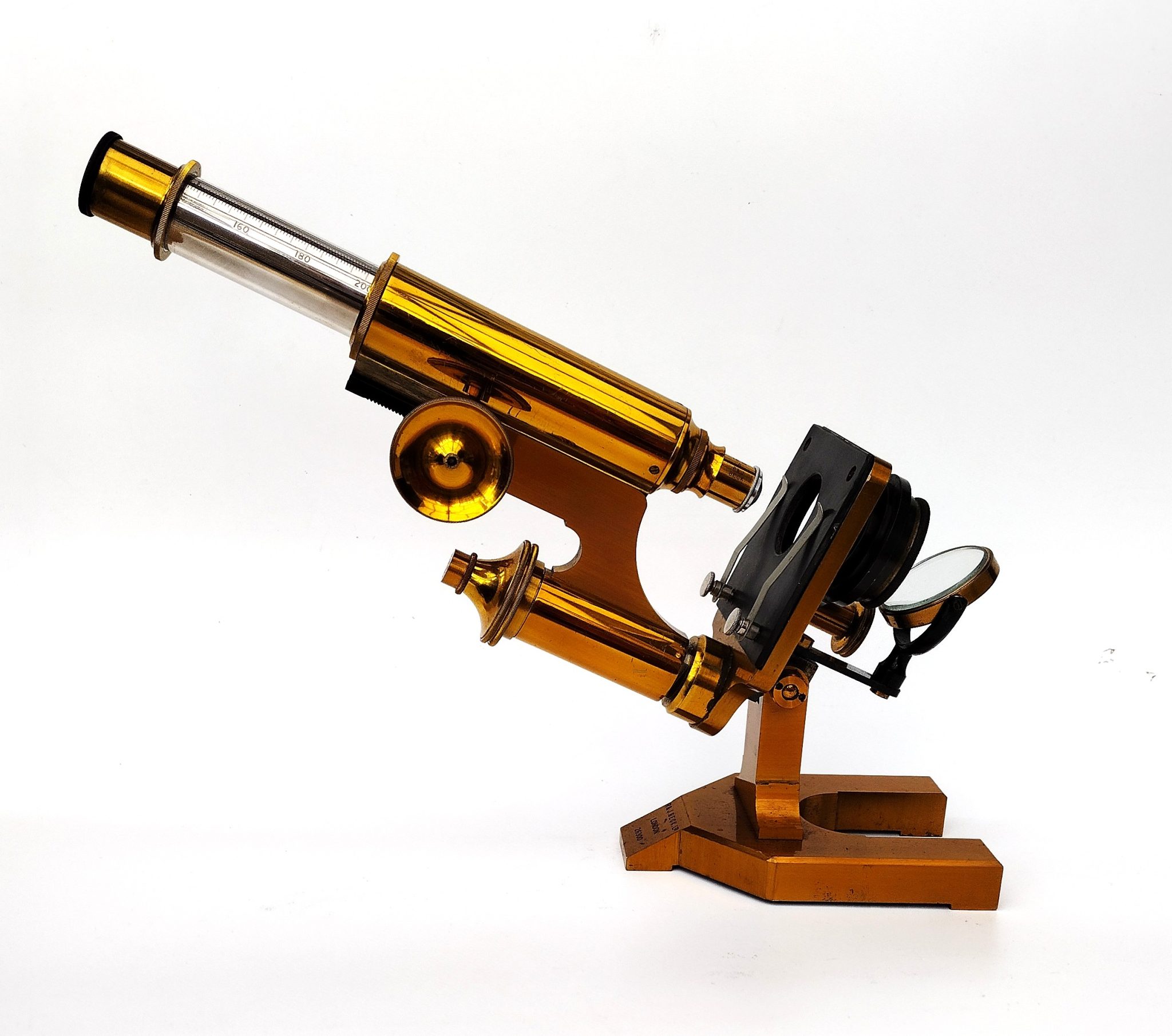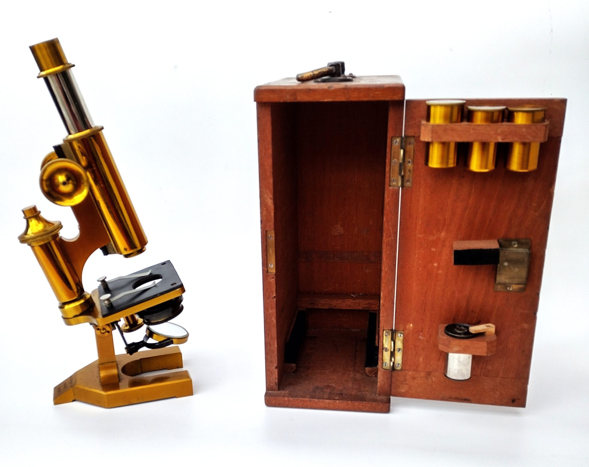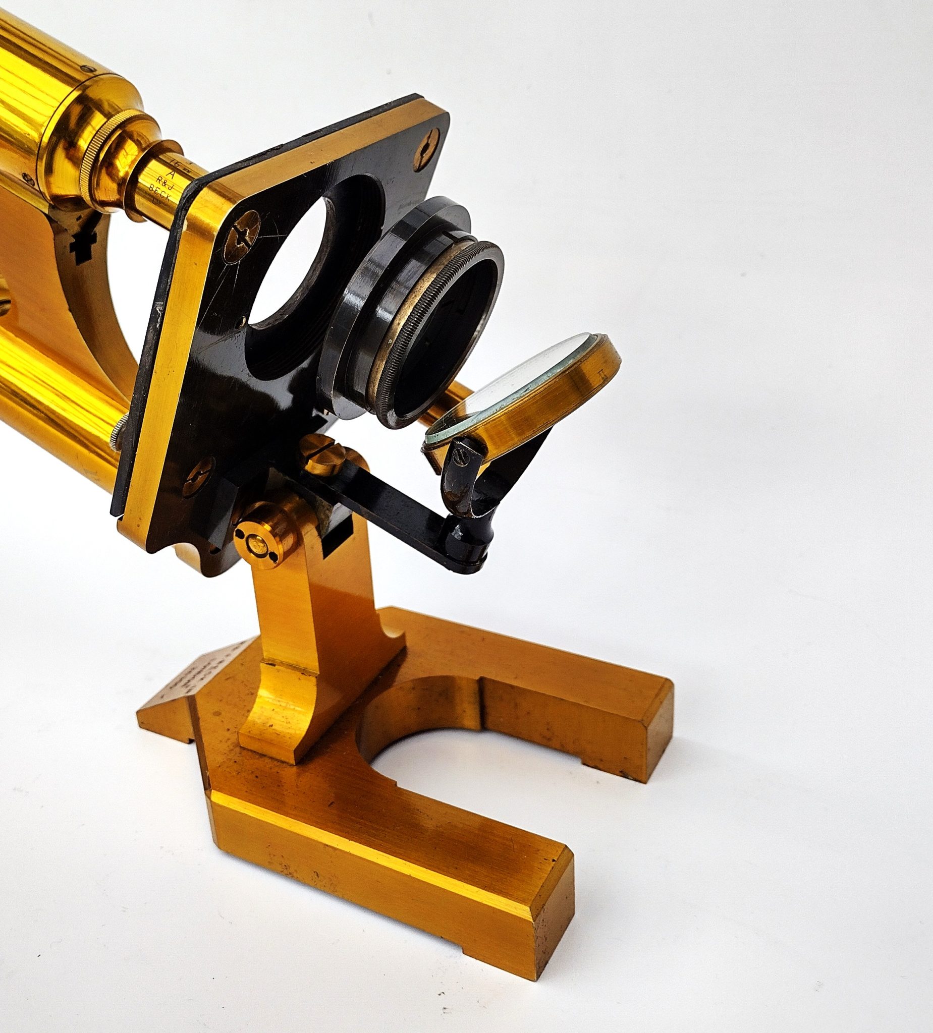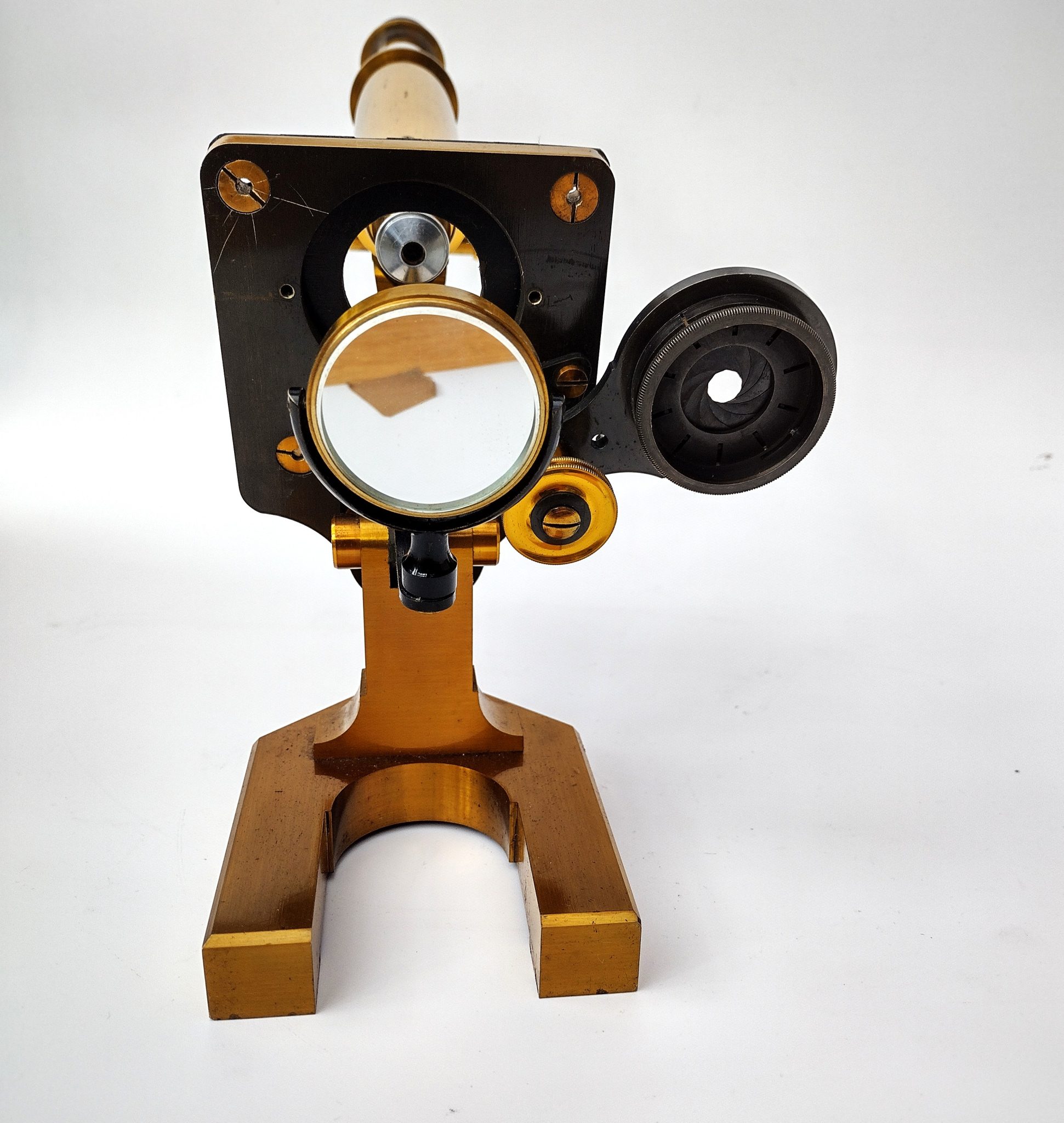 A monocular brass microscope engraved, ‘R & J Beck Ltd, London, 26300’ with coarse and fine focus wheels, graduated draw tube, plano / concave mirror and sub stage diaphragm.
