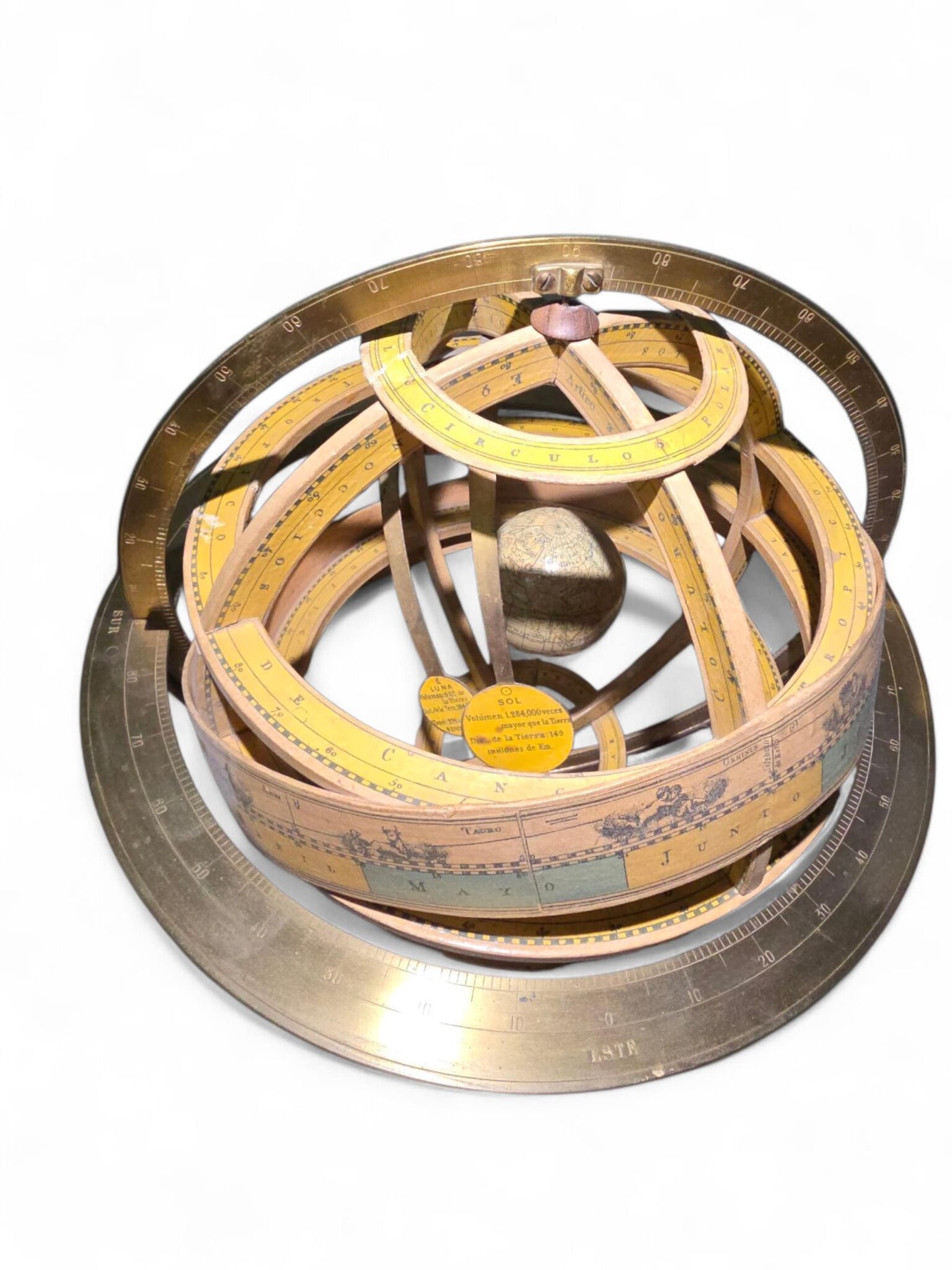 Exceptional and very rare armillary sphere made in Barcelona around 1880 by Faustino Paluzie, one of the most important 19th-century Spanish makers of scientific and educational instruments. Made of iron, wood, paper, and brass, this finely crafted model combines precision with decorative appeal. The paper rings are printed and hand-colored with celestial and terrestrial references, mounted on a turned wooden base and brass axle. Dimensions: Height: 53 cm (20.9 in) Diameter: 33 cm (13 in) A rare and valuable example of Paluzie’s globes and educational instruments, a symbol of the excellence of late 19th-century Catalan craftsmanship. Ideal for collectors of antique scientific instruments or antique cosmographic models.