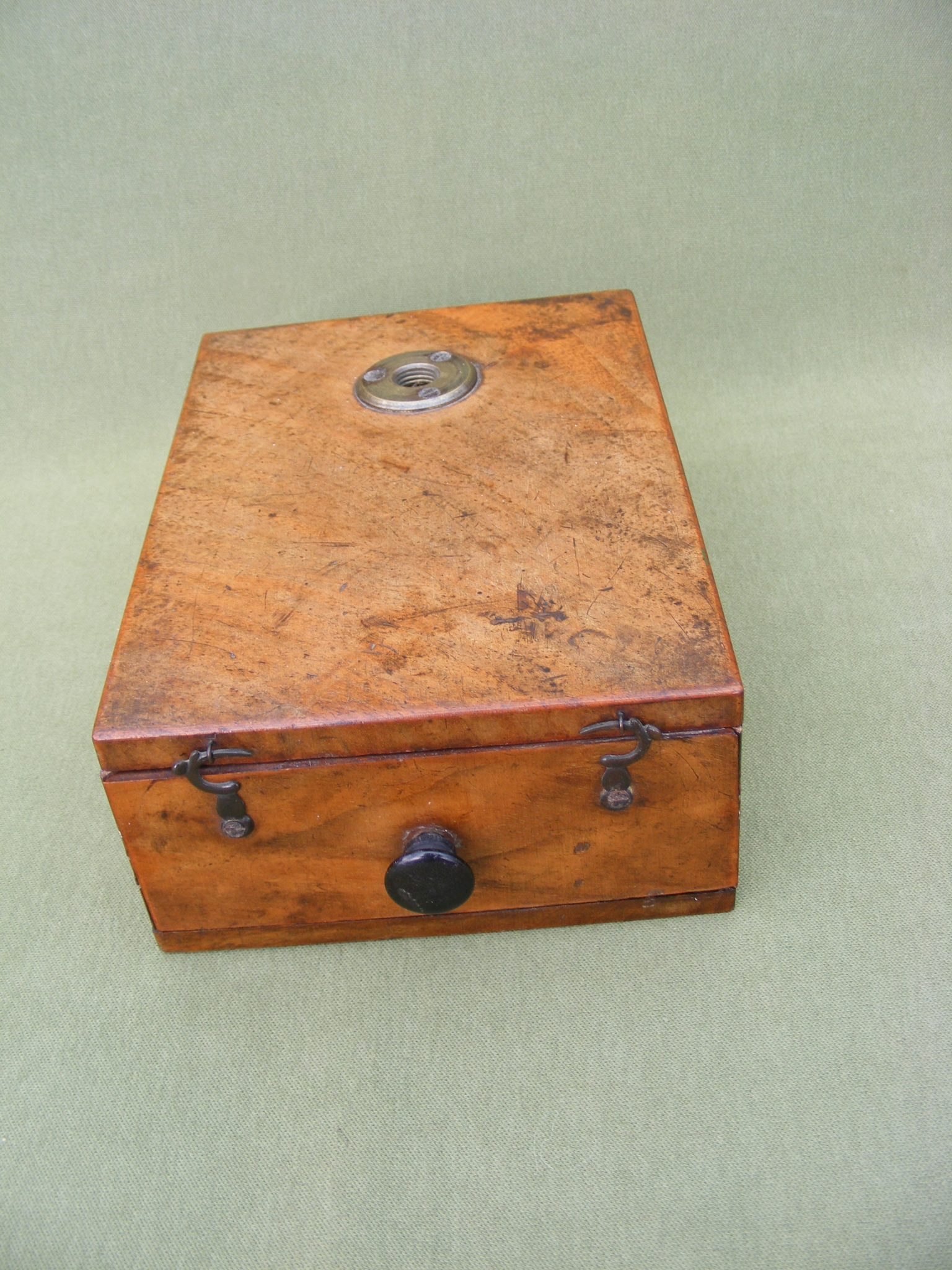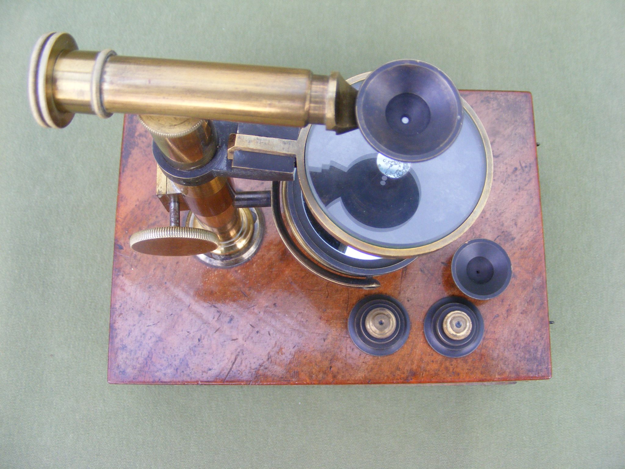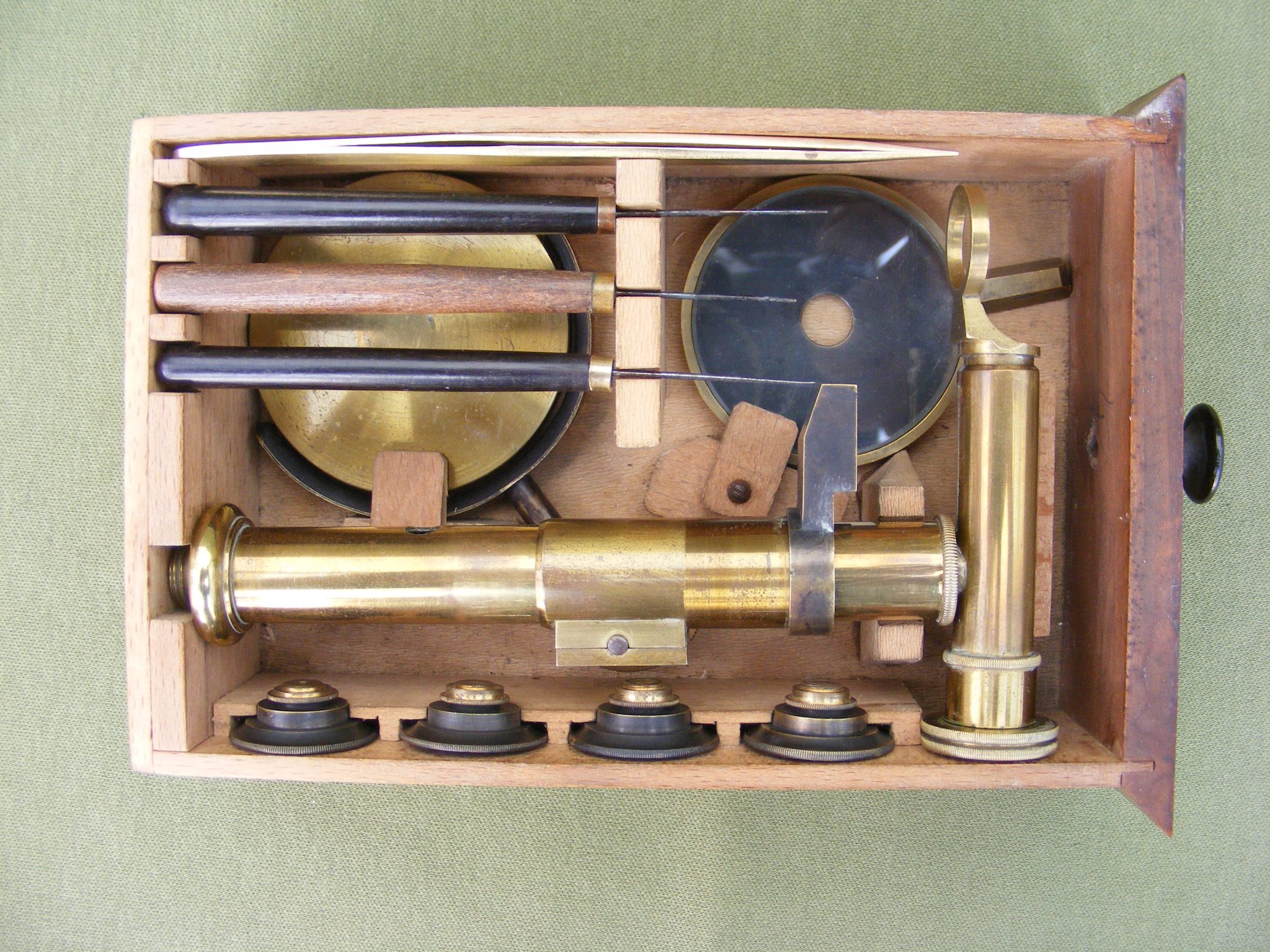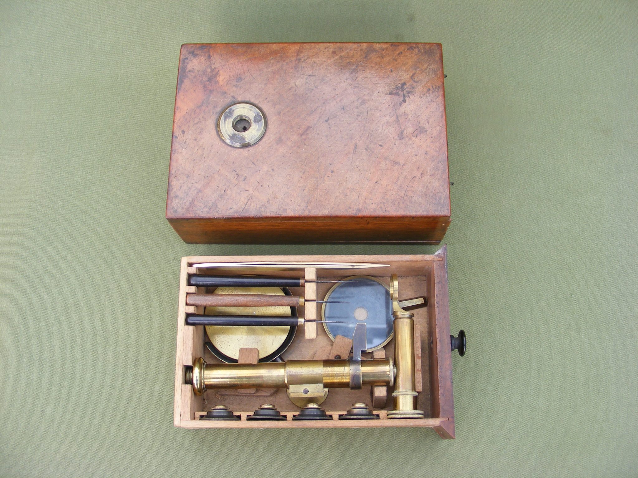 VERY GOOD FRENCH SIMPLE MICROSCOPE OF RASPAIL FORM IN LOVELY WALNUT BOX COMPLETE WITH 4 OBJECTIVES, DISSECTING TOOLS, TWEEZERS ( LATER ) SINGLE SIDED MIRROR & GLASS STAGE WITH BRASS INSERT/LIGHT STOP. RACK & PINION FOCUSING, HEAD WITH AQUATIC MOVEMENT. MAY HAVE BEEN MADE BY SECRETAN OF PARIS.