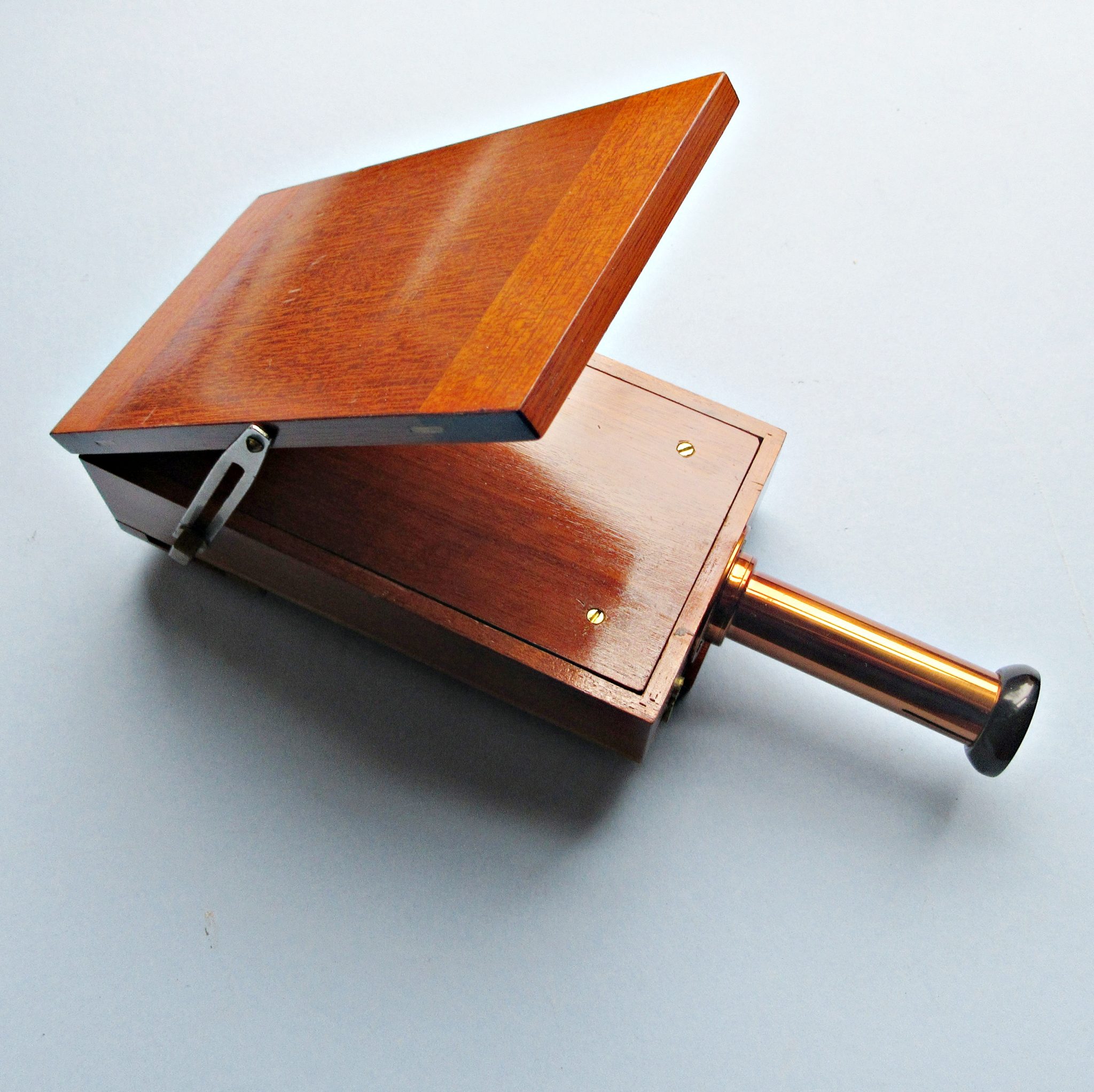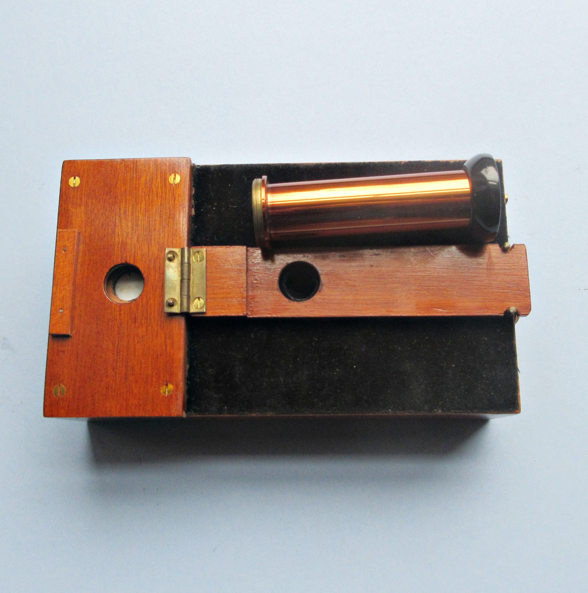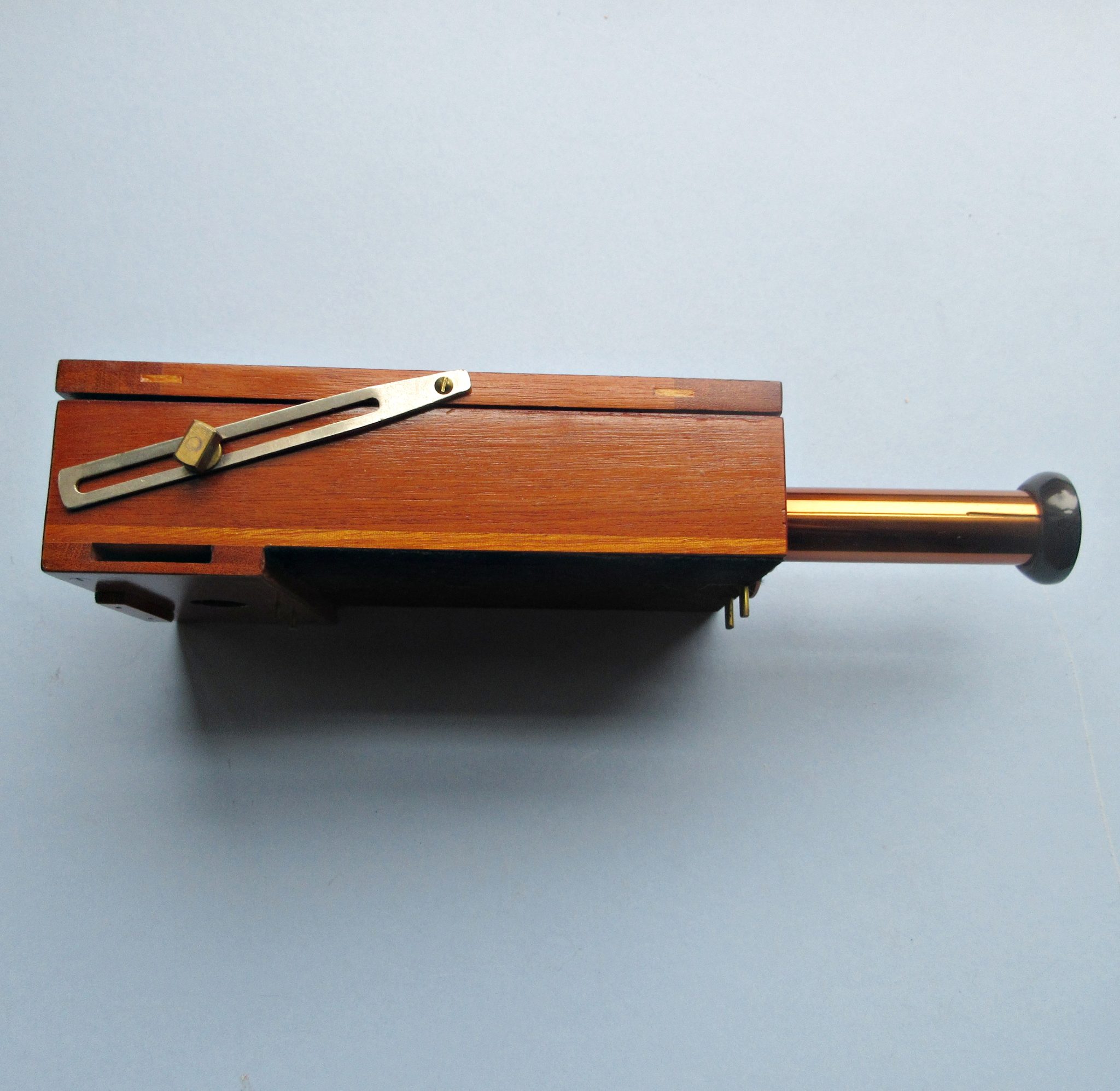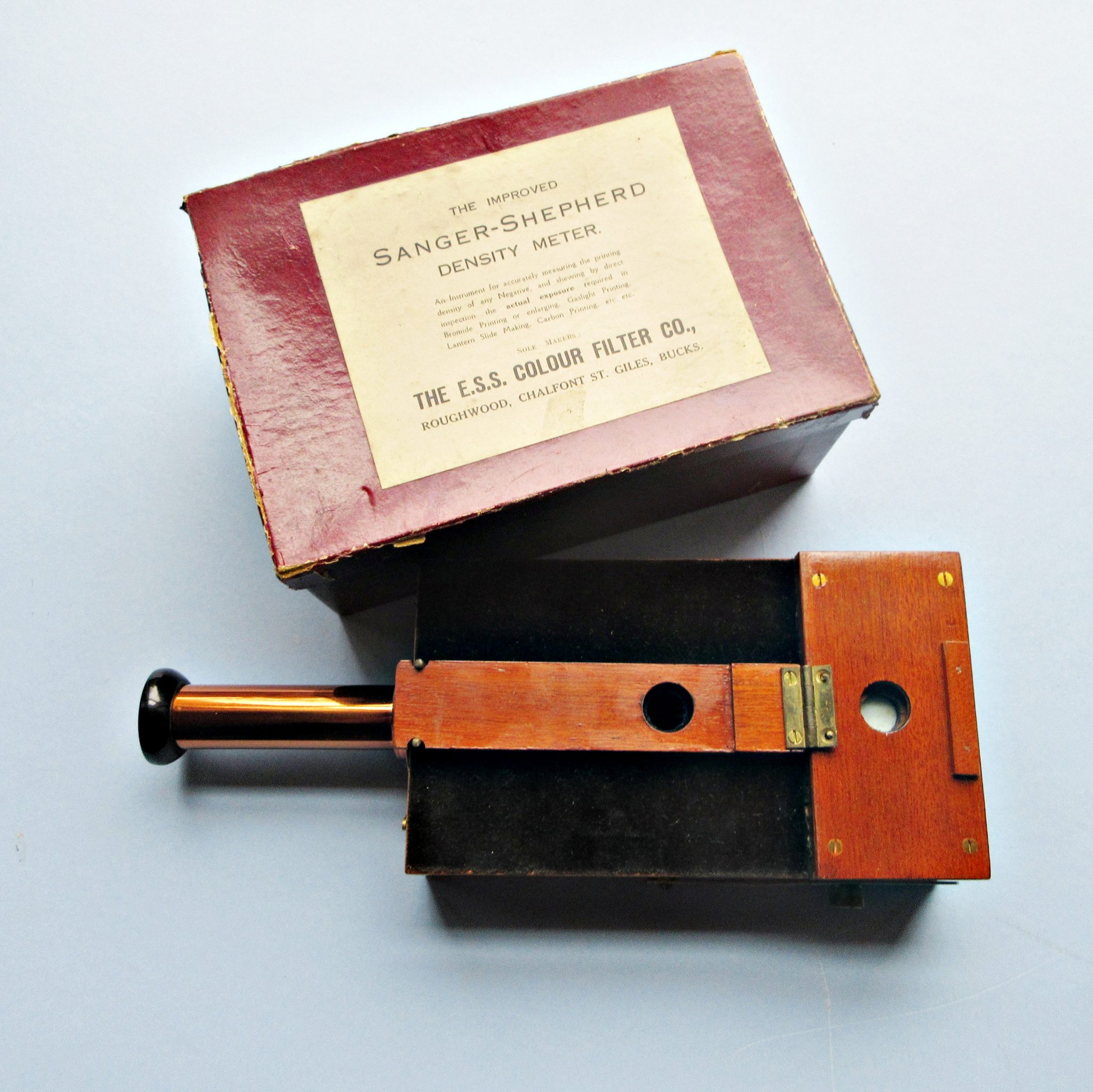 A fine C1920s example of a Sanger-Sheperd density meter in its original labeled box. This instrument was used ” for measuring the density of a negative and showing by direct inspection the actual exposure required in Bromide Printing or enlarging” (see box label) Maker: Maker: The E.S.S. Colour Filter Company operating in England. Dimensions of box: 7″ x 5″ x 4″. No condition issues.