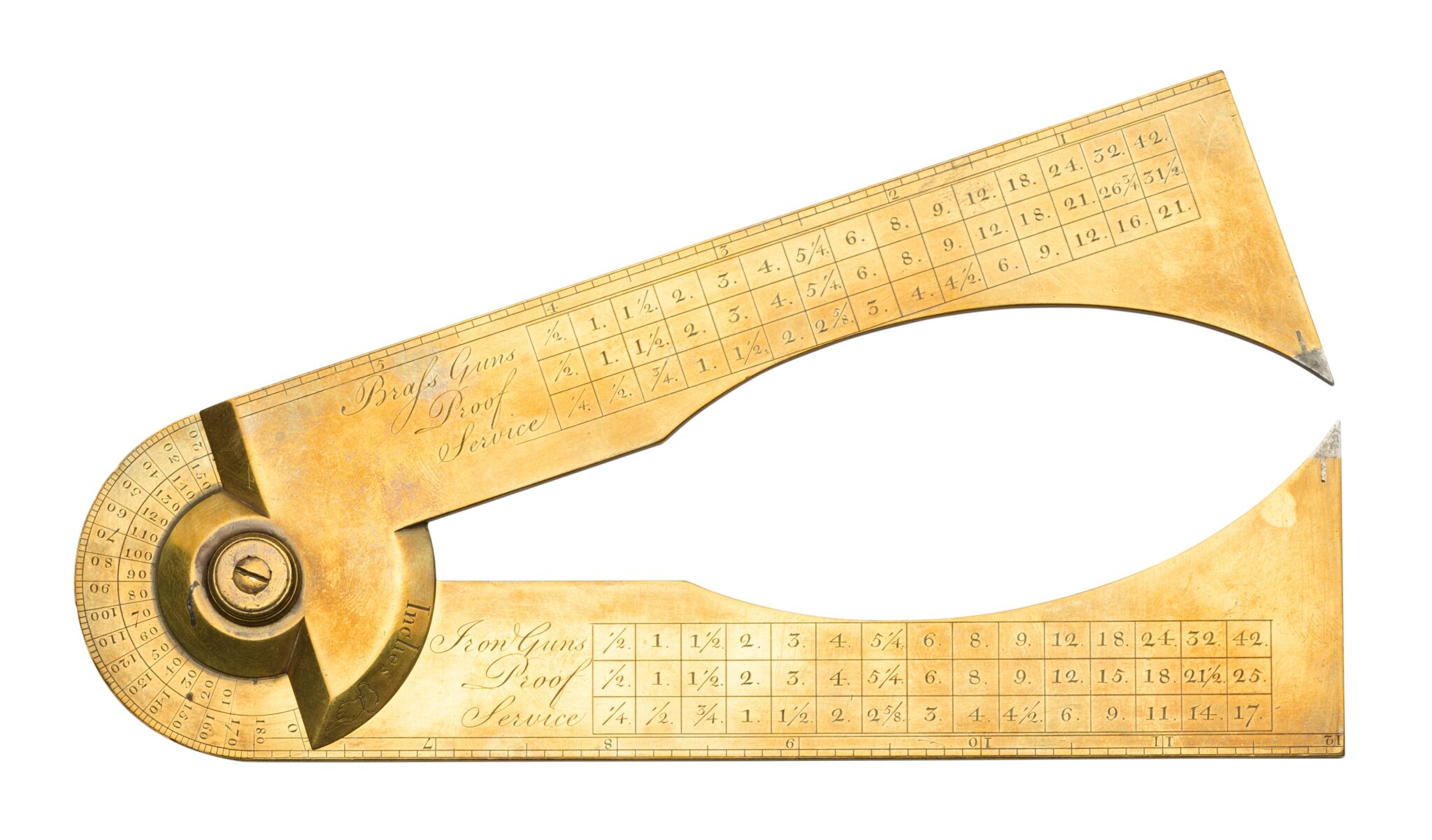 Rare gunners caliper by Jesse Ramsden finely engraved with scales for ‘The Weight of Powder that will Fill the Chamber of Brass Mortars’ and marked out in inches for ‘Mortars’ etc to the left ‘D of Shell’ over ‘Land’, ‘Sea’ on one side, and ‘Brass Guns’ over ‘Proof Service’ and ‘Iron Guns’ over ‘Proof Service’ on the other, hinged from ‘01’ to ‘180’ degrees and from ‘0’ to ’10 Inches’, the latter with engraved hand indicator.