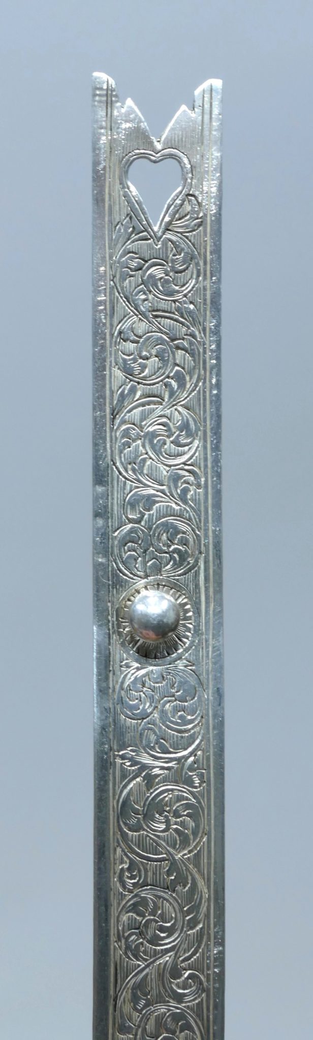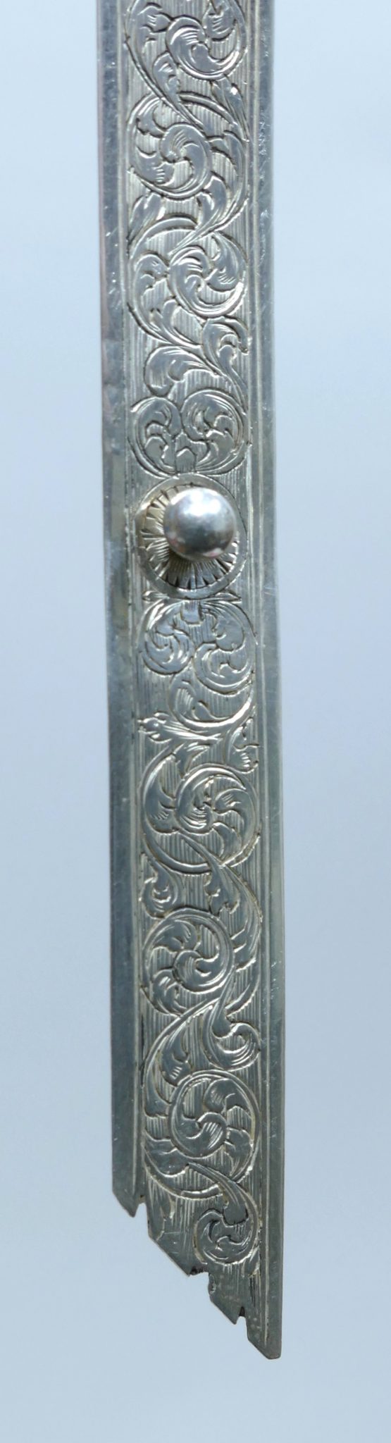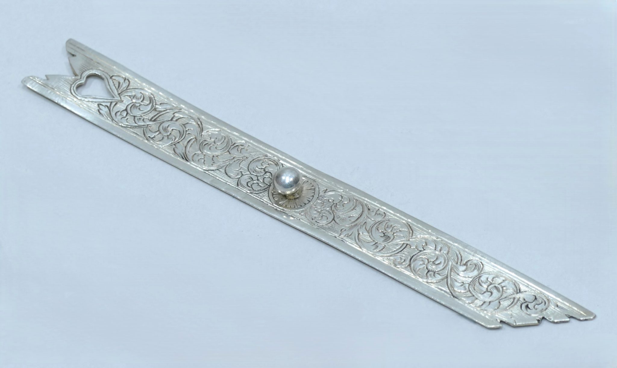 Small flat silver ruler with cut ends and a button-shaped grip in the centre. The top is engraved with a decoration of curled acanthus leaves and the back is plain.