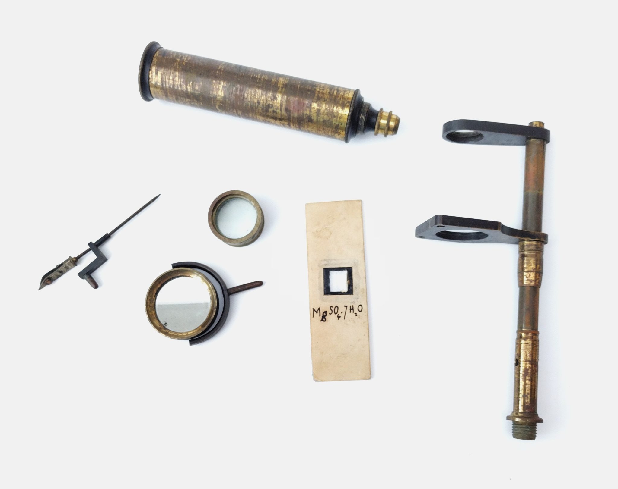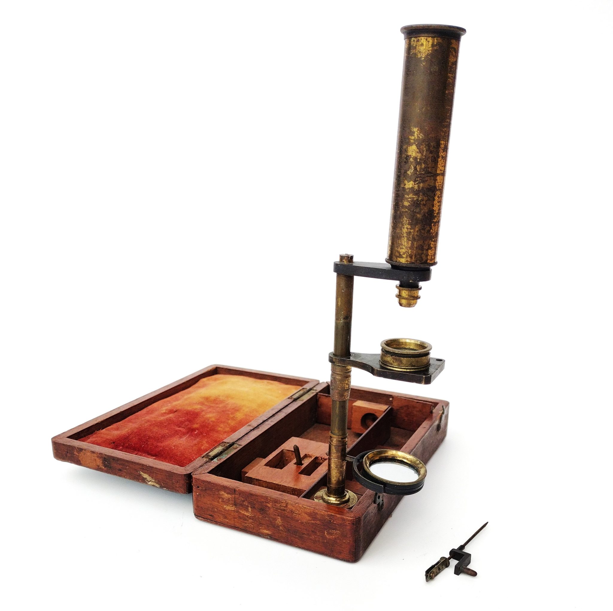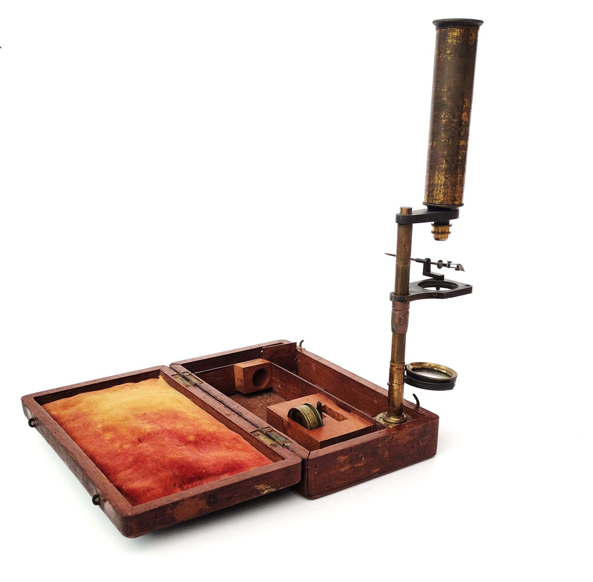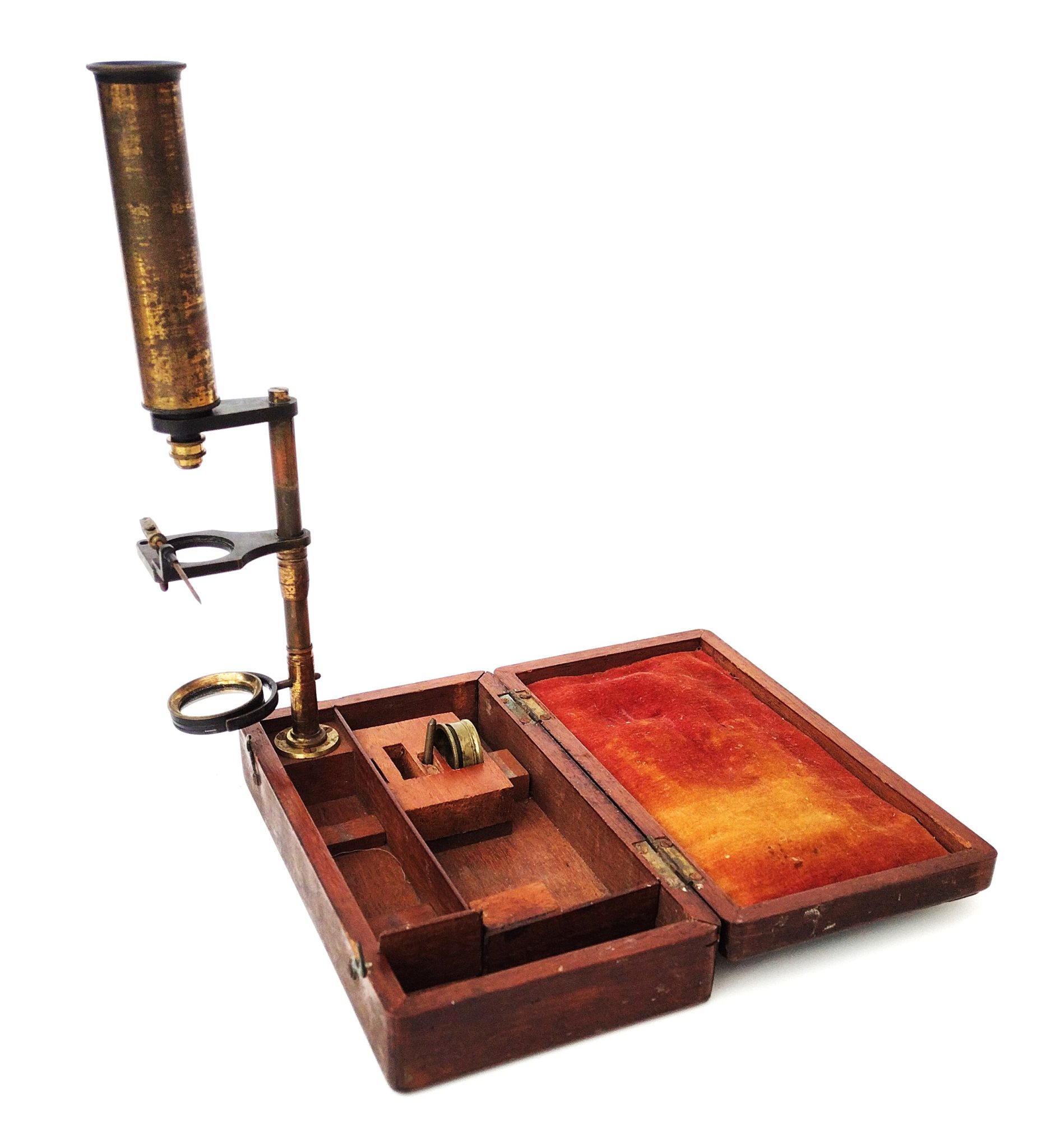 Unsigned. The column threads into the lug which is fixed to the corner of the case. The drawtube screws onto the top bracket. Focus is achieved by sliding the stage up / down the column.