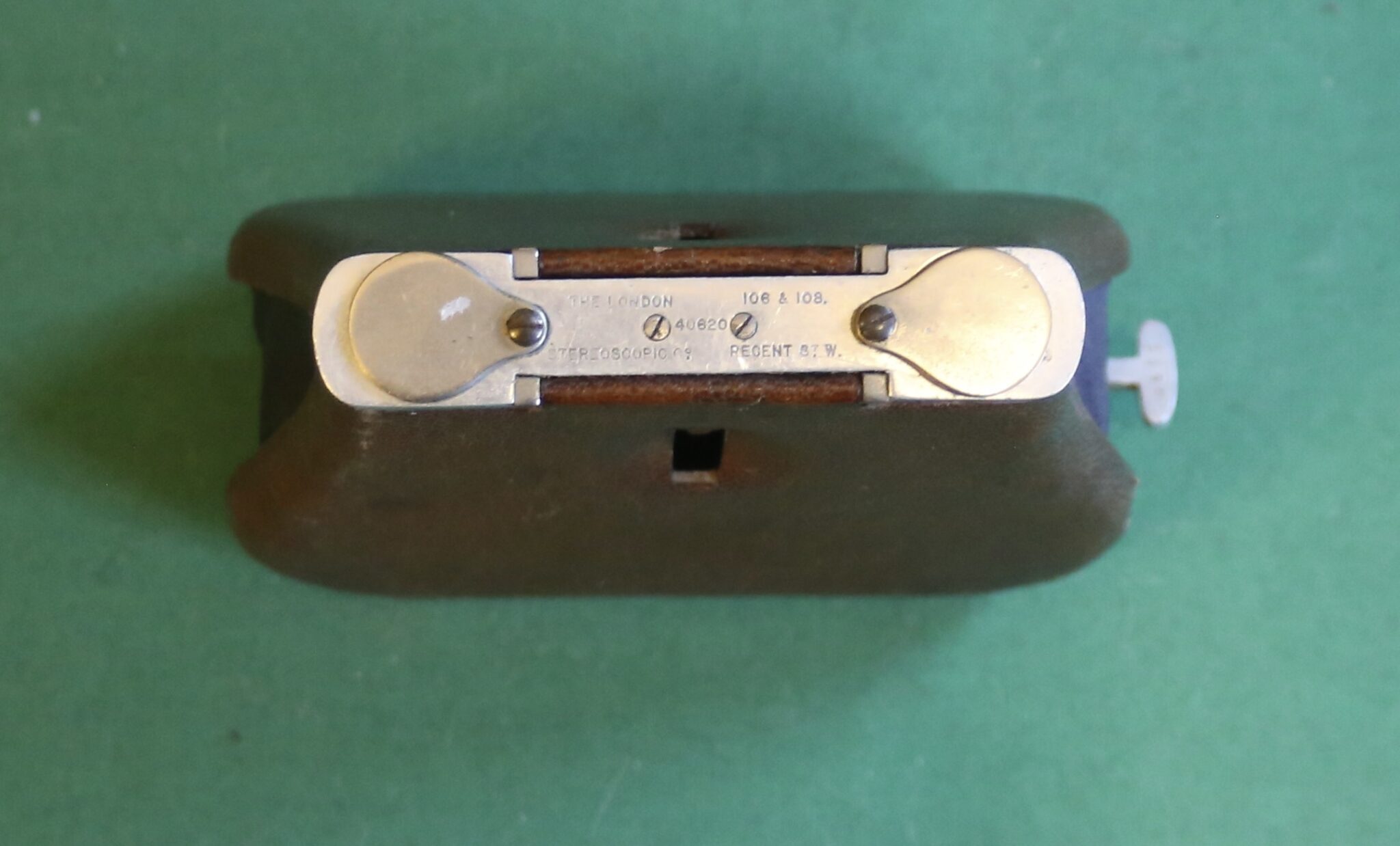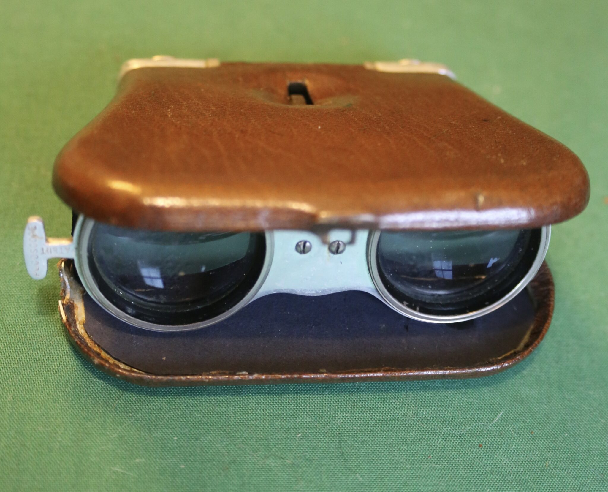 A smart pair of folding opera glasses by The London Stereoscopic Company, 106 & 108 Regent St. W. Covered in tan leather with silk side panels.