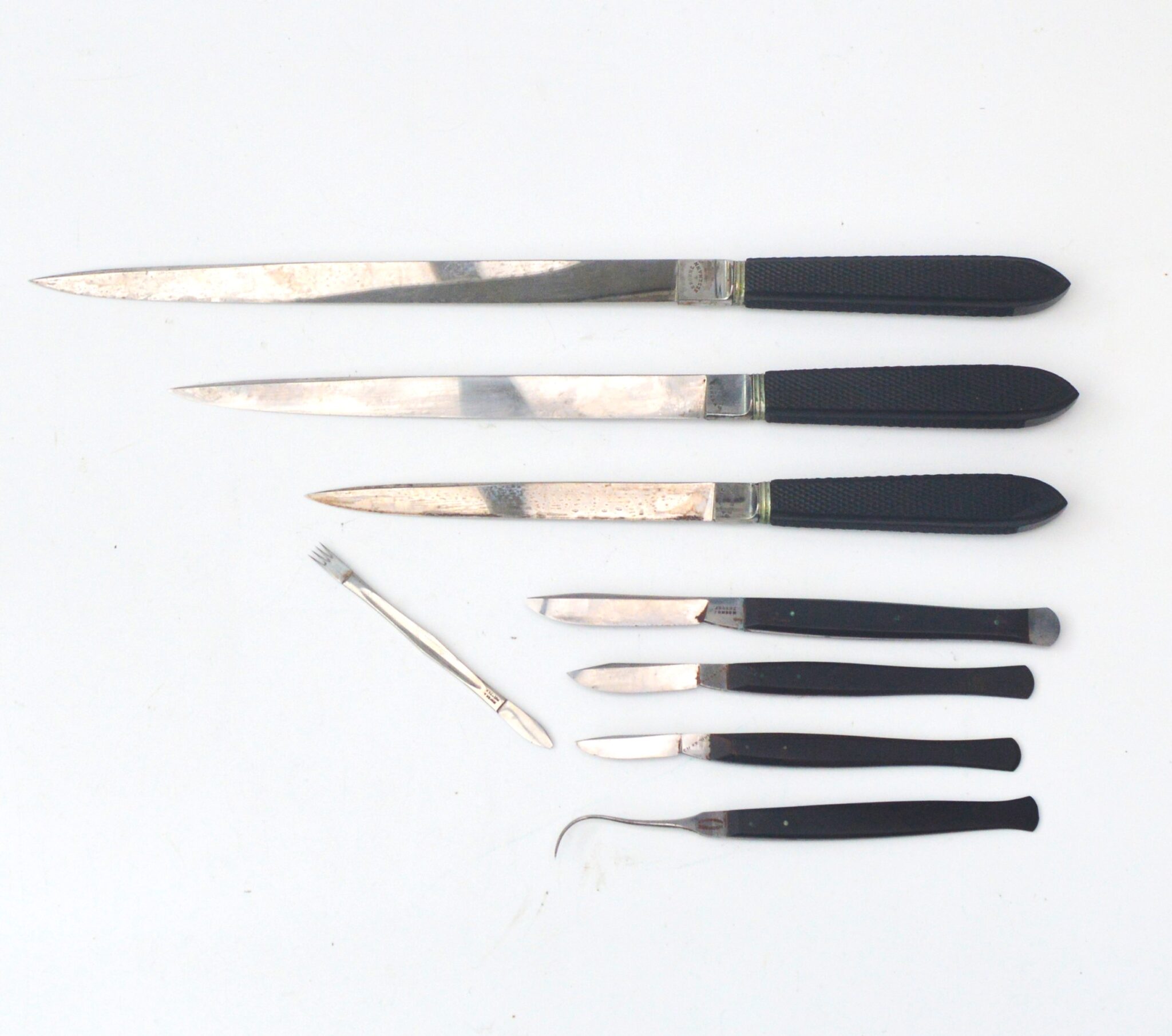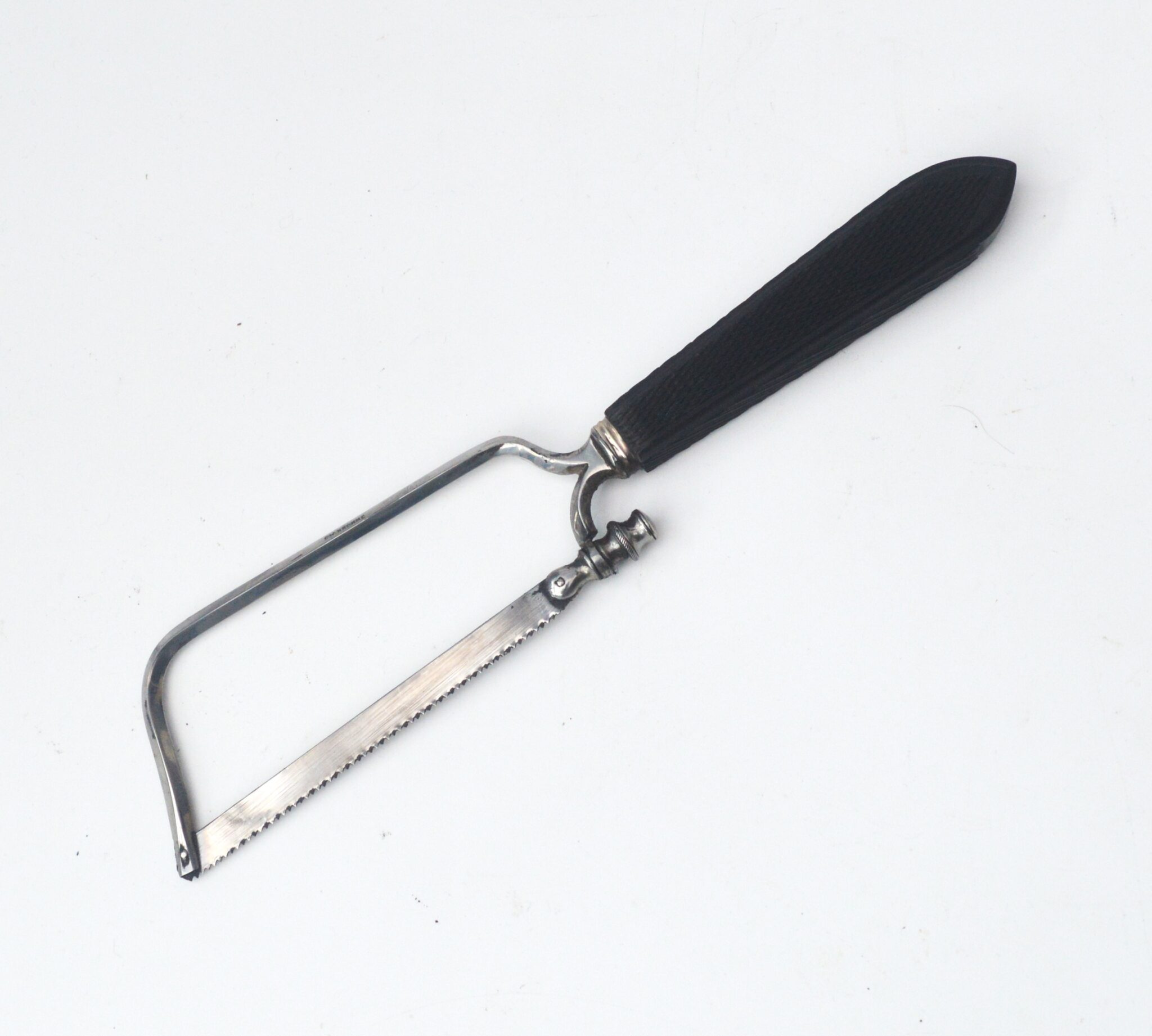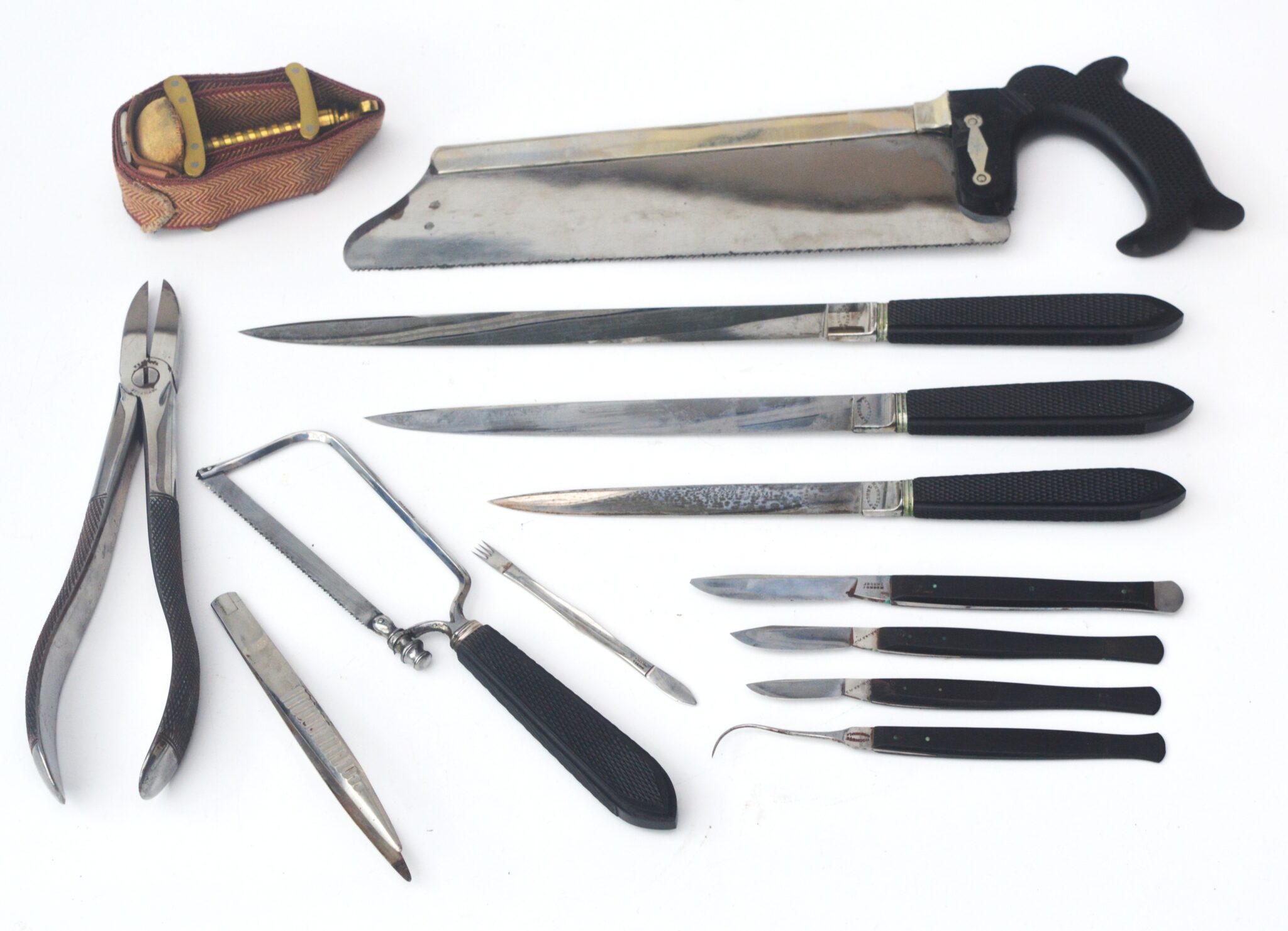Includes three Liston knives, three flesh and three incision knives all with tooled ebony handles, tourniquet, large and small bone saws