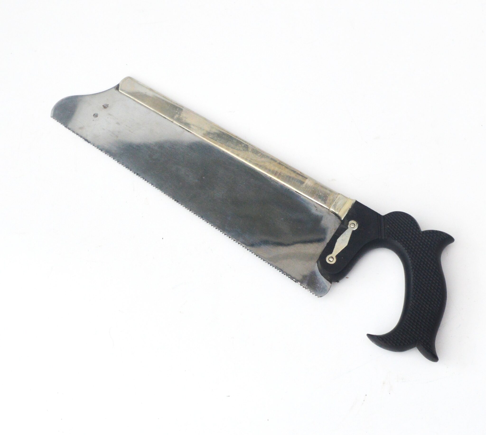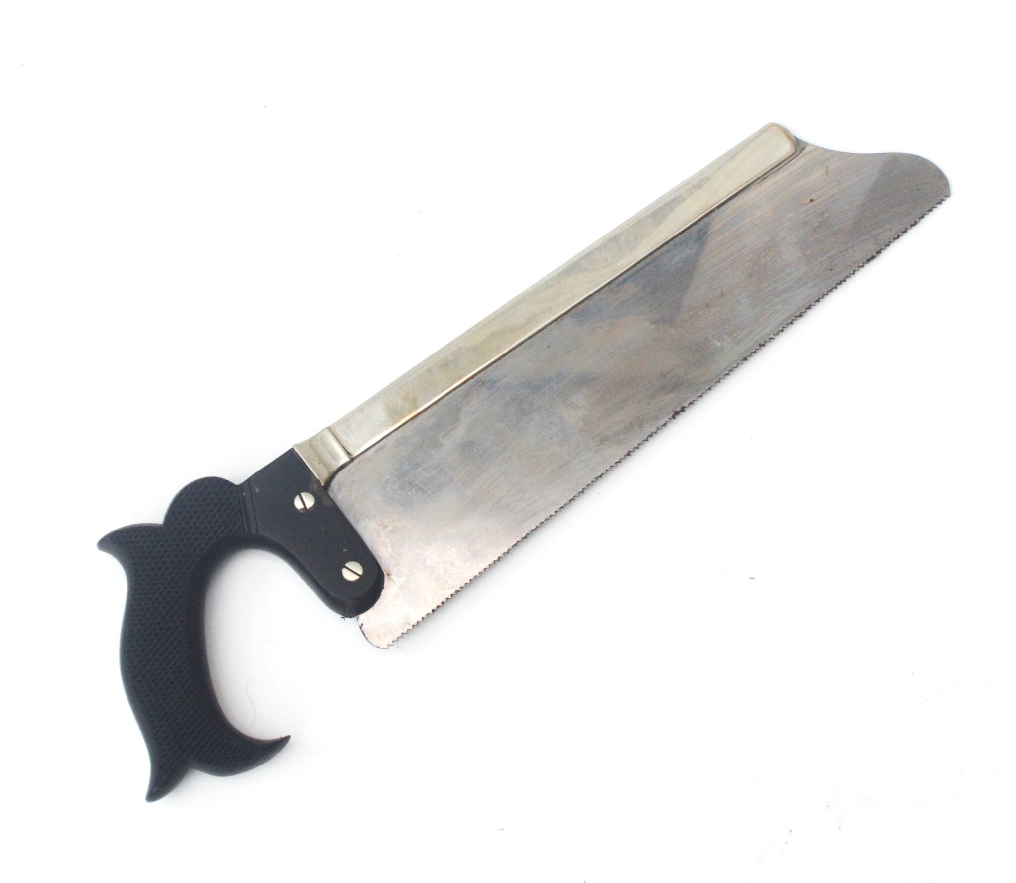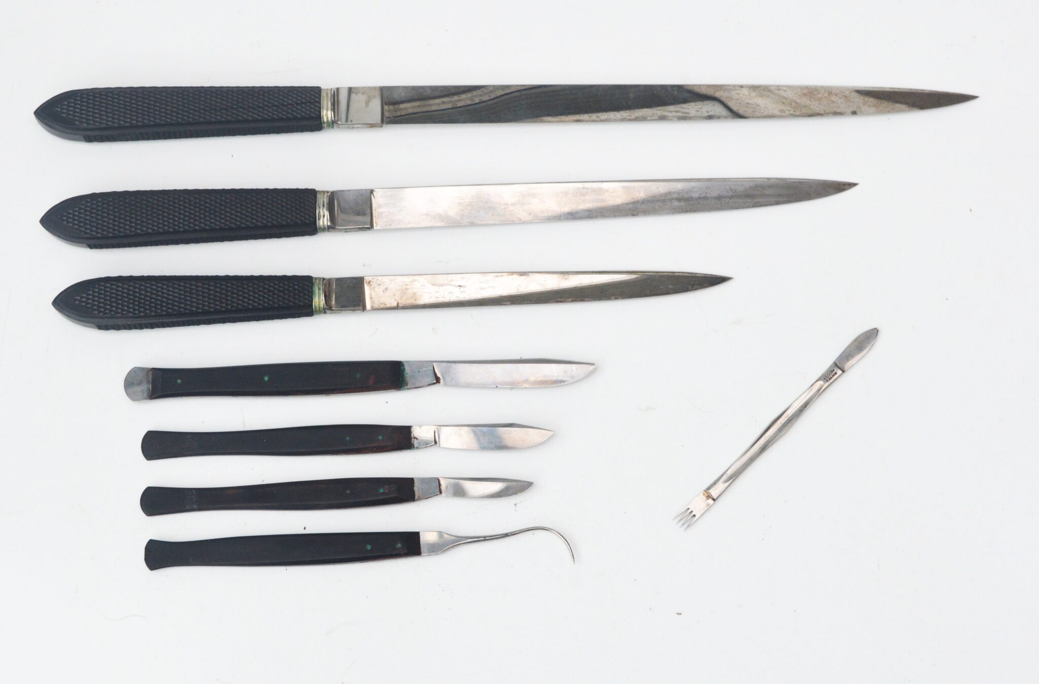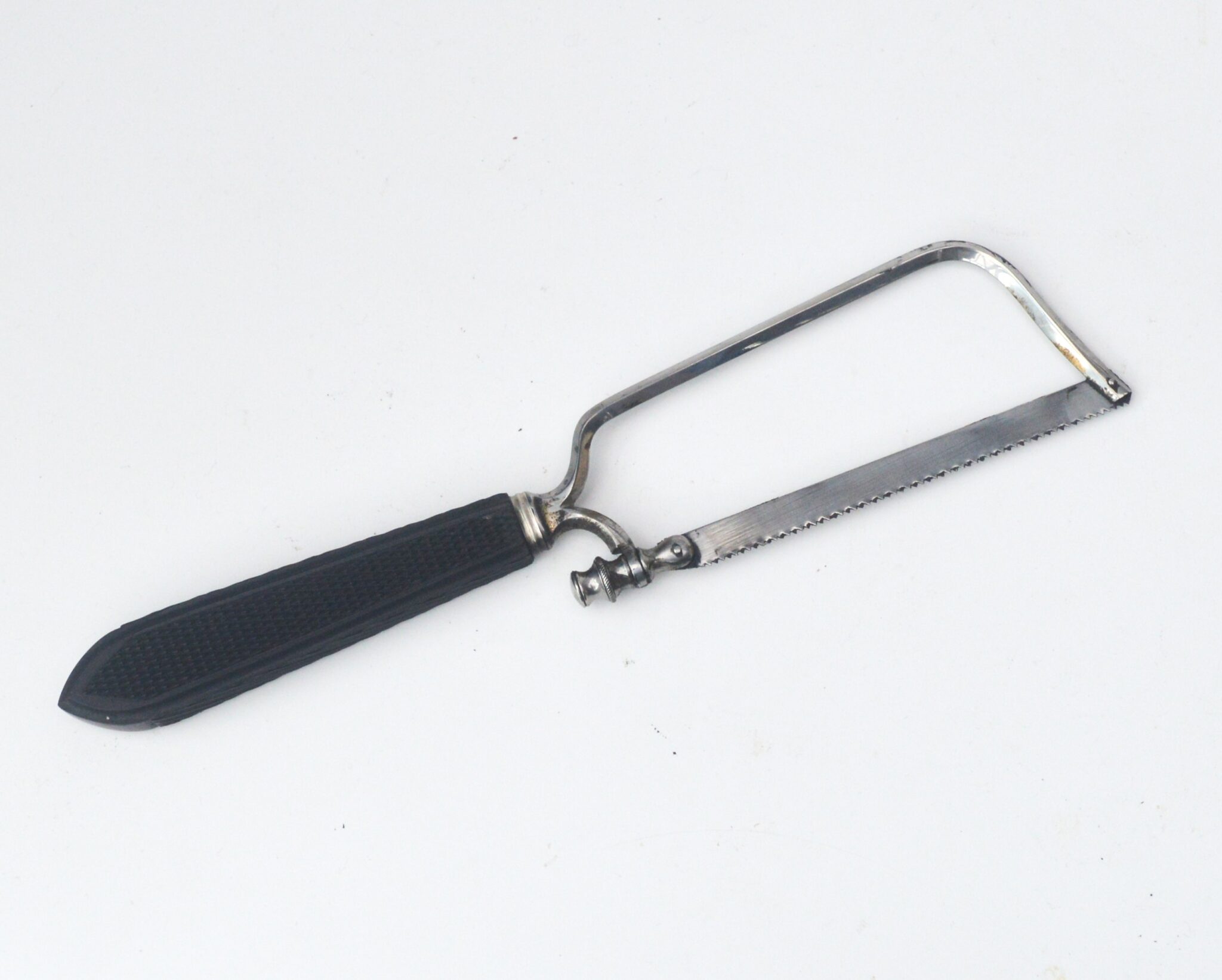 Includes three Liston knives, three flesh and three incision knives all with tooled ebony handles, tourniquet, large and small bone saws