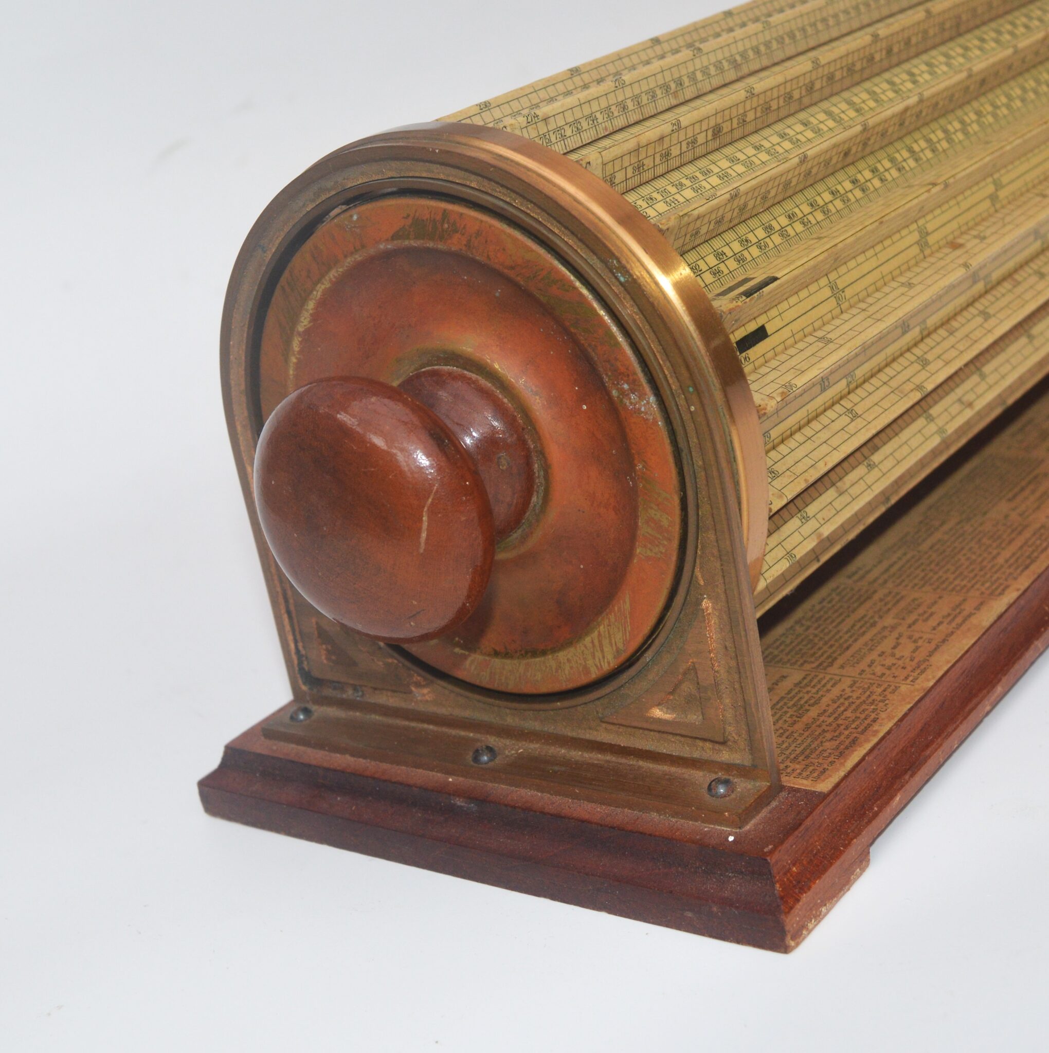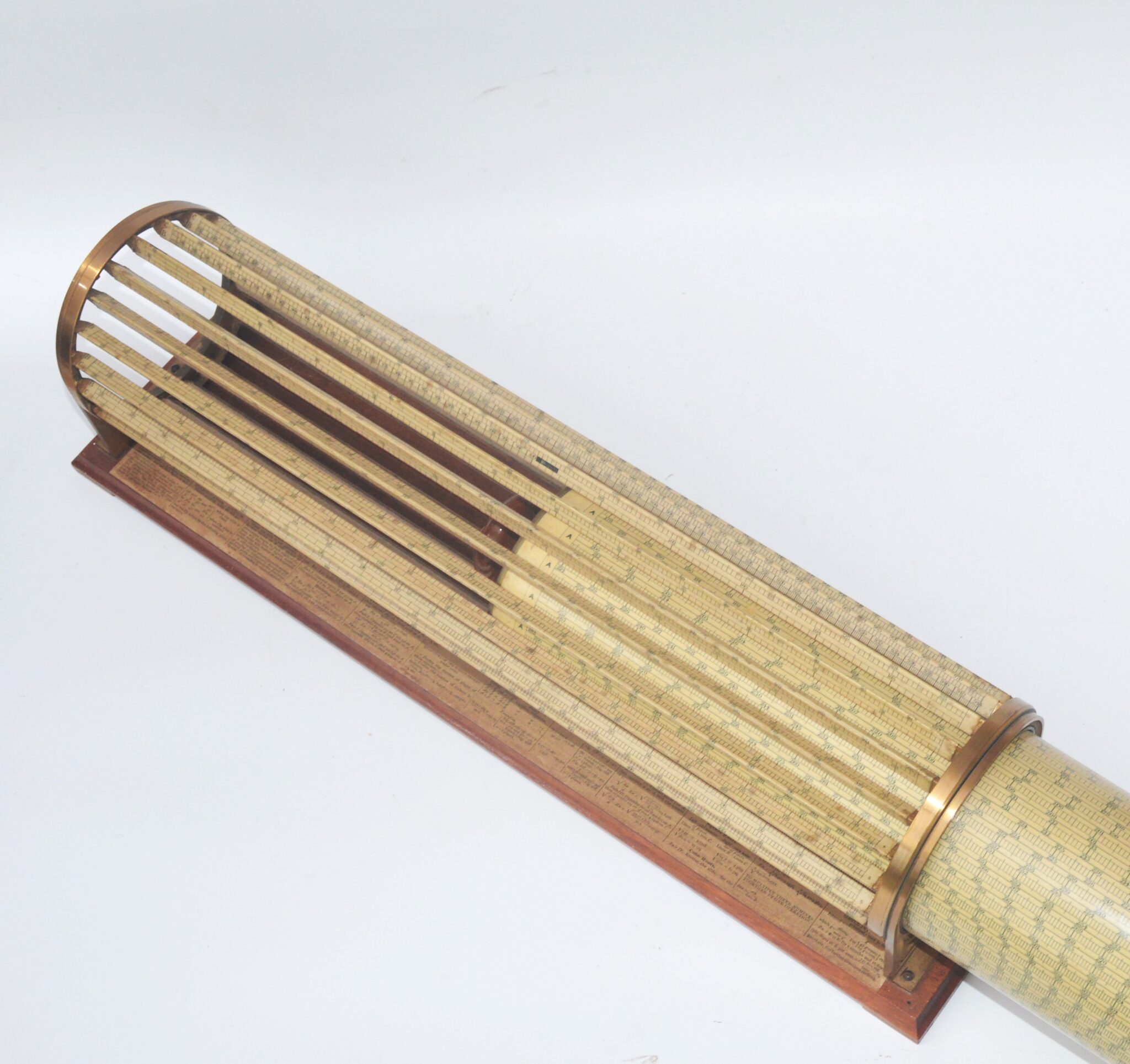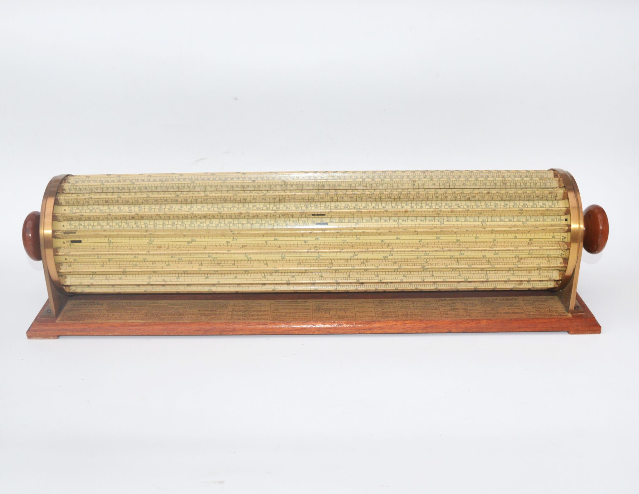 This instrument consists of a cylinder that revolves in an open framework made by 20 triangular brass bars. Each bar is covered in a paper on two of its visible sides, and each piece of paper has two scales. These bars are held between two metal rings which are mounted to a wood base. There are wooden knobs on either side of the instrument that both rotate the cylinder, and move it from right to left. There are detailed usage instructions pasted to the top of the wooden base that holds the slide rule. The instrument is stored in a mahogany case with a small Keuffel & Esser plaque fitted on a corner of the base.