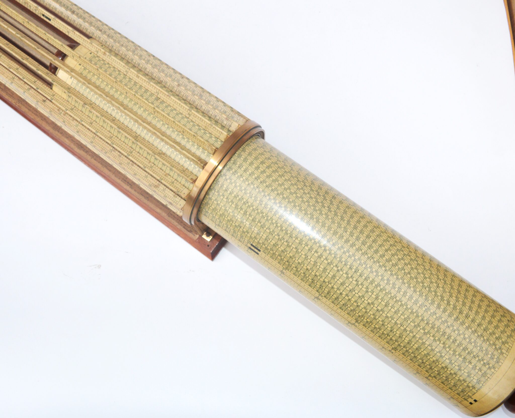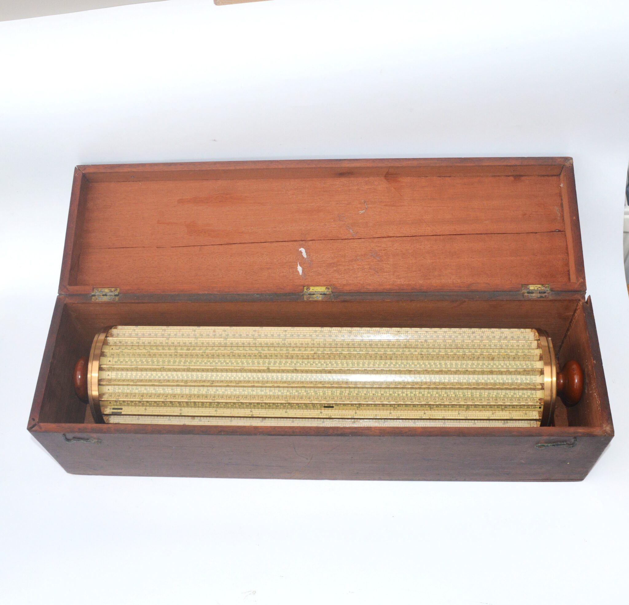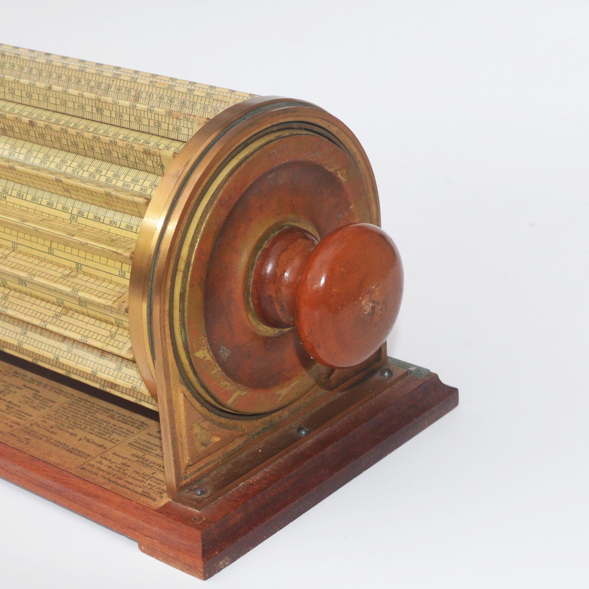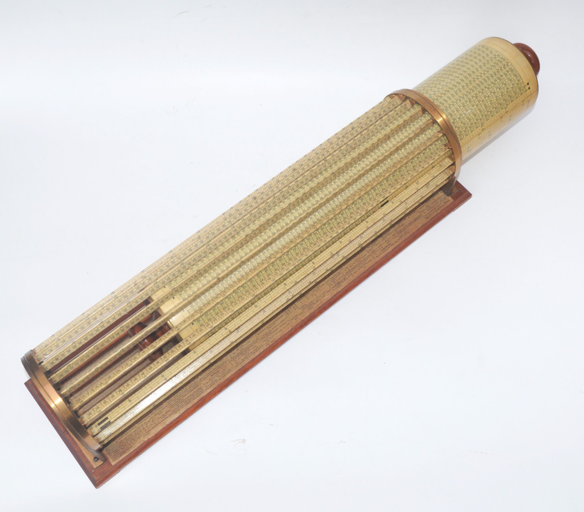 This instrument consists of a cylinder that revolves in an open framework made by 20 triangular brass bars. Each bar is covered in a paper on two of its visible sides, and each piece of paper has two scales. These bars are held between two metal rings which are mounted to a wood base. There are wooden knobs on either side of the instrument that both rotate the cylinder, and move it from right to left. There are detailed usage instructions pasted to the top of the wooden base that holds the slide rule. The instrument is stored in a mahogany case with a small Keuffel & Esser plaque fitted on a corner of the base.