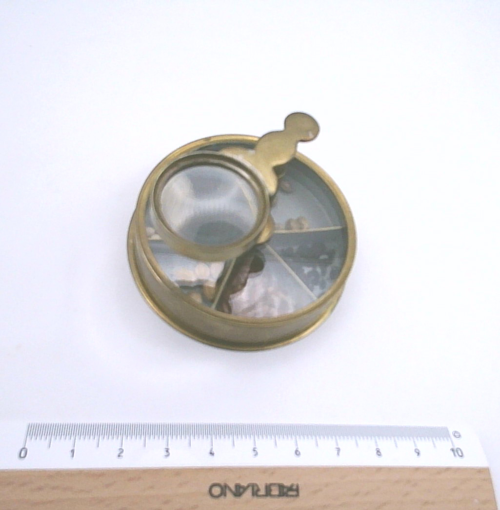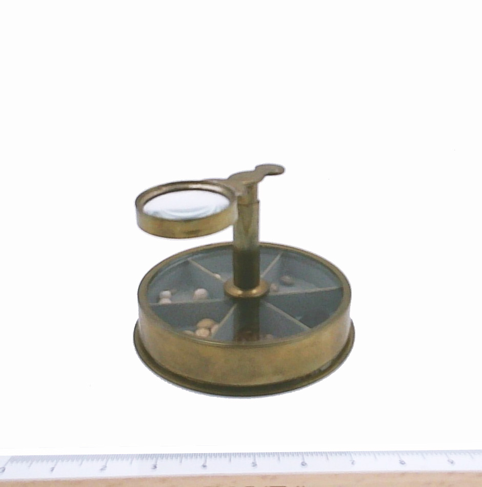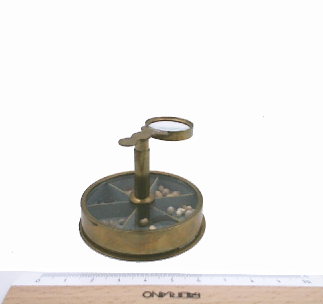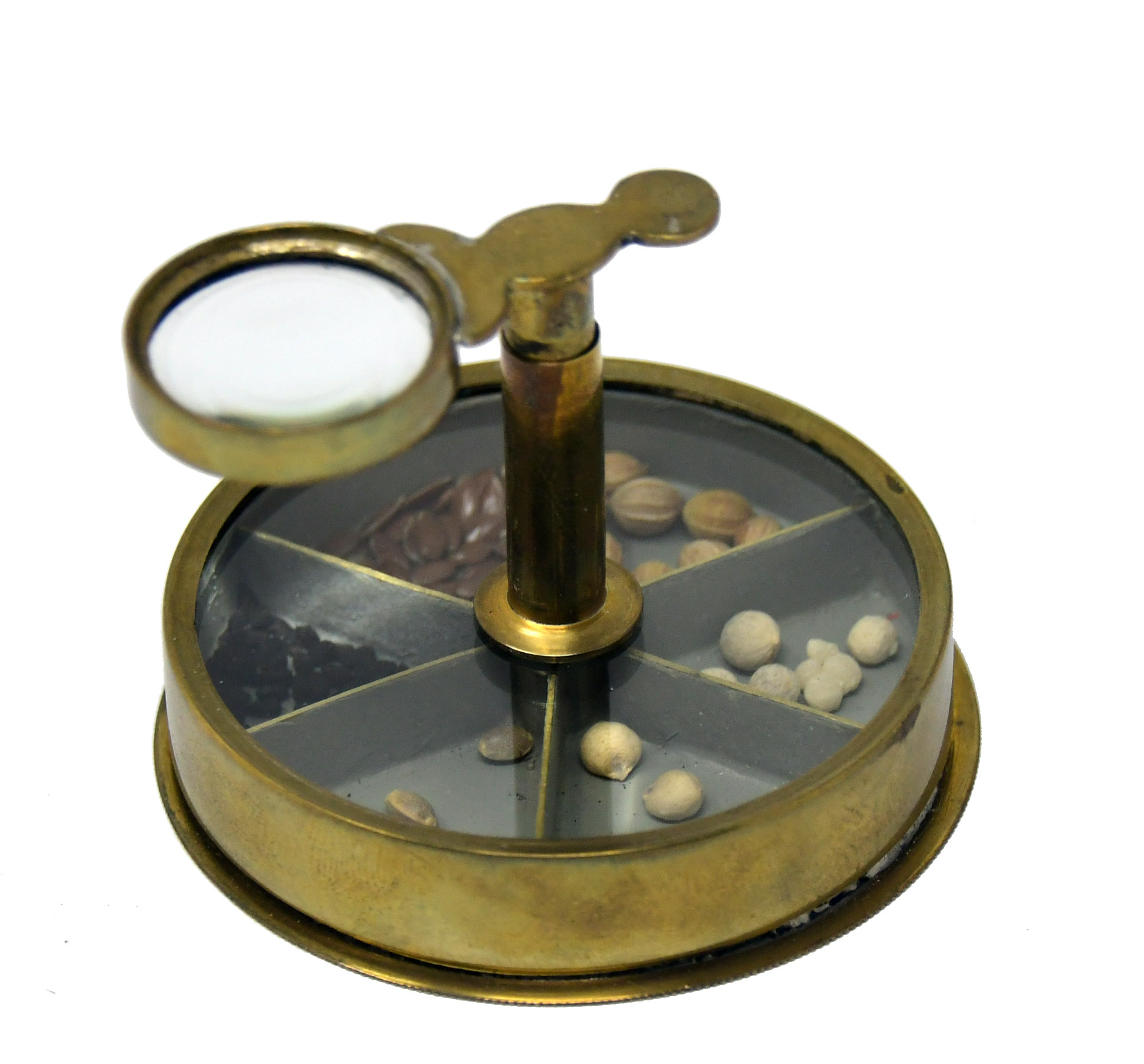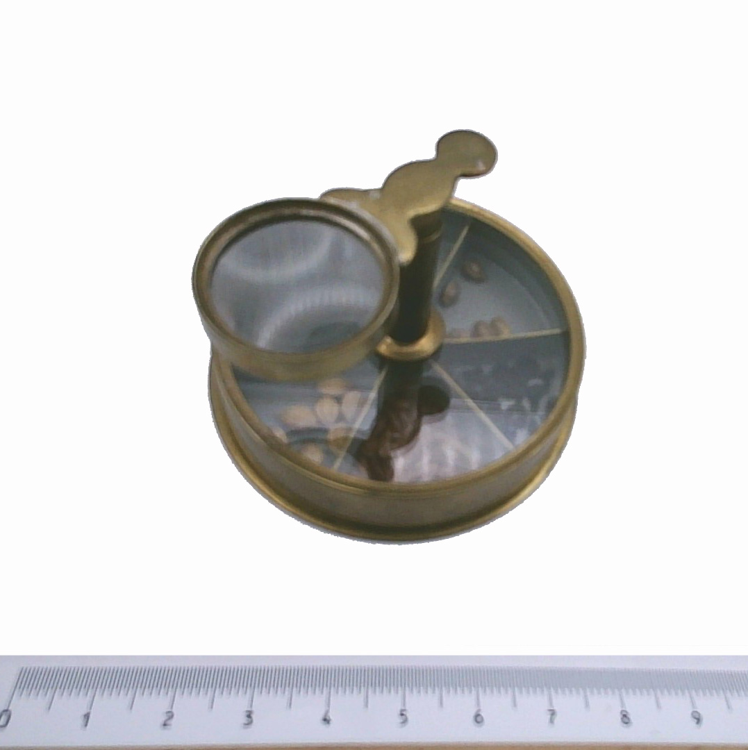 A mid-19th-century version of a livebox microscope is shown on the right. Its purpose is to inspect plant seeds under magnification for comparison. The microscope features a circular base divided into six compartments, covered with a glass top. Rising from the center is a pillar that carries a lens in a rotating mount, providing a magnification of about 5x. Different varieties of seeds are placed in these compartments, making them easily available for examination and comparison.