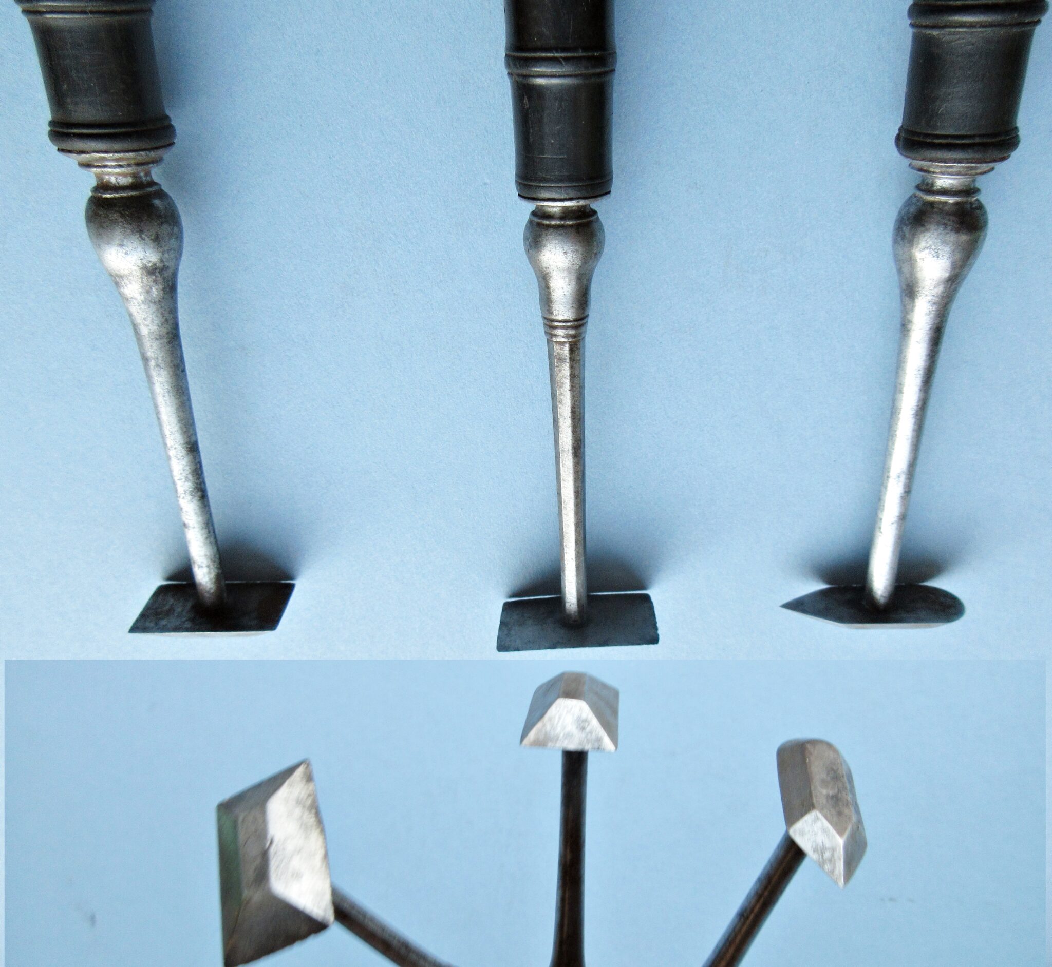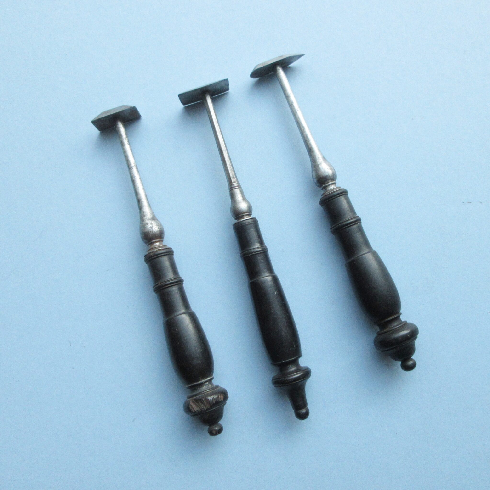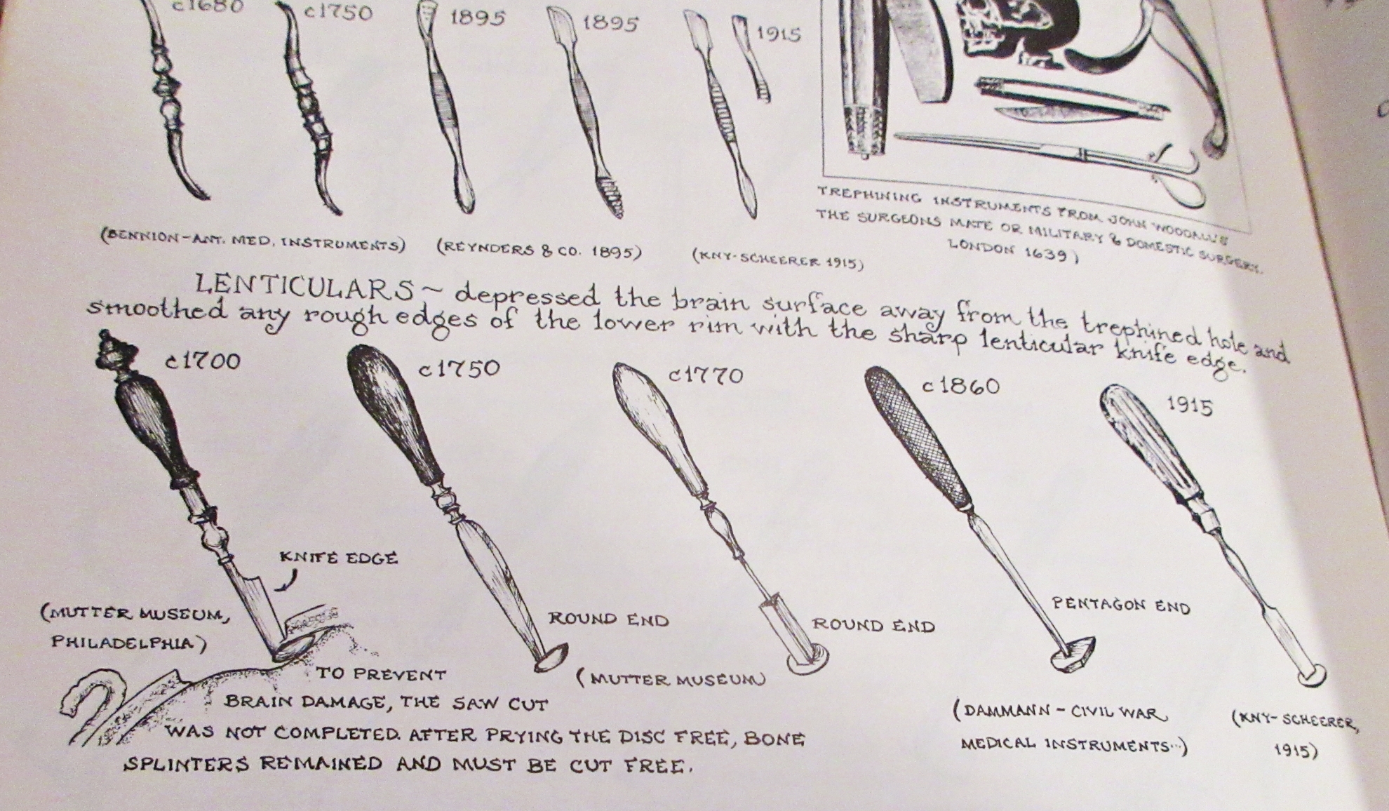 Three 18th-century lenticulars used for skull surgery (aka: trepanning), all likely English. See last image taken from Keith Wilbur’s ANTIQUE MEDICAL INSTRUMENTS (1987: 134) for an explanation of their use. All with ebony handles. Number 2 is in very good+ condition numbers 1 & 2 have chips or a crack. Numbers 1 & 3 are $150 each; number 2 is $200.00.