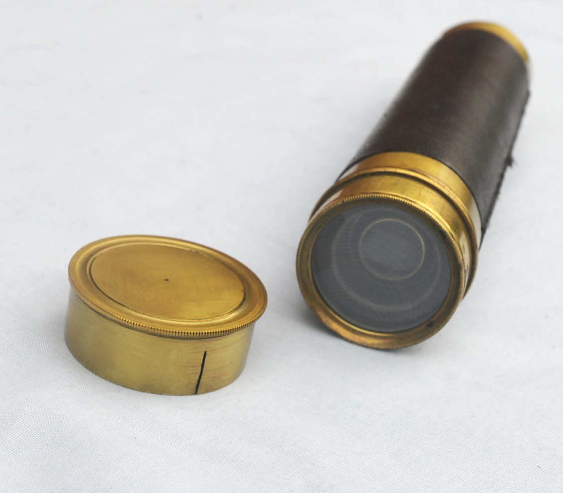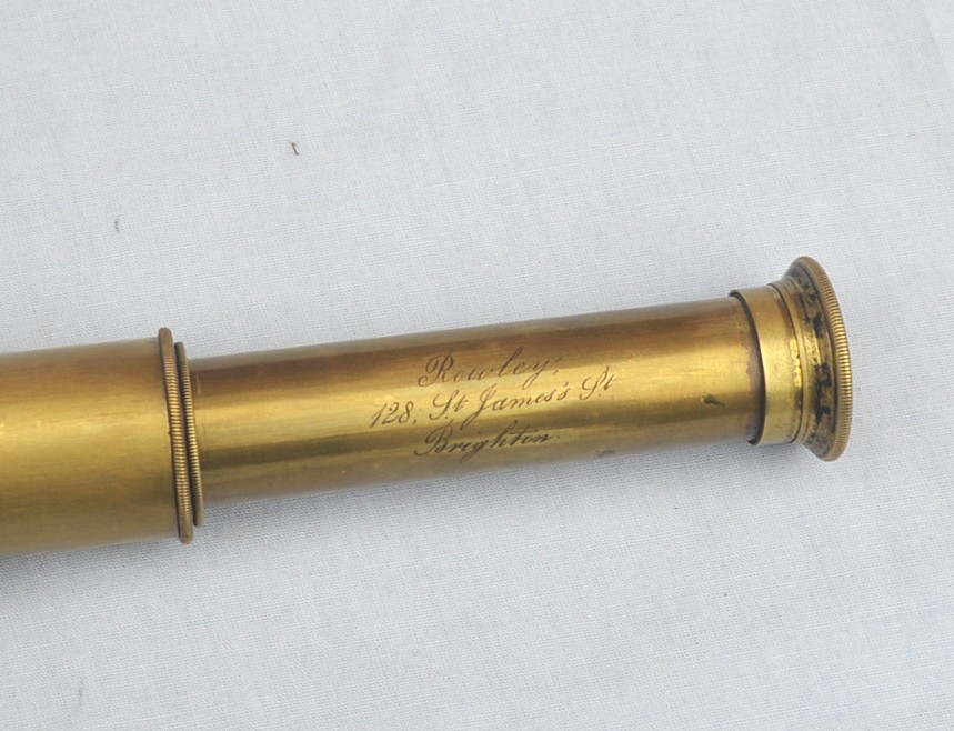 A three draw brass telescope with a leather covered barrel, signed on the first draw, ‘Rowley, 128, St James St., Brighton’. It measures 8″ long when closed and pulls out to 23.75″.