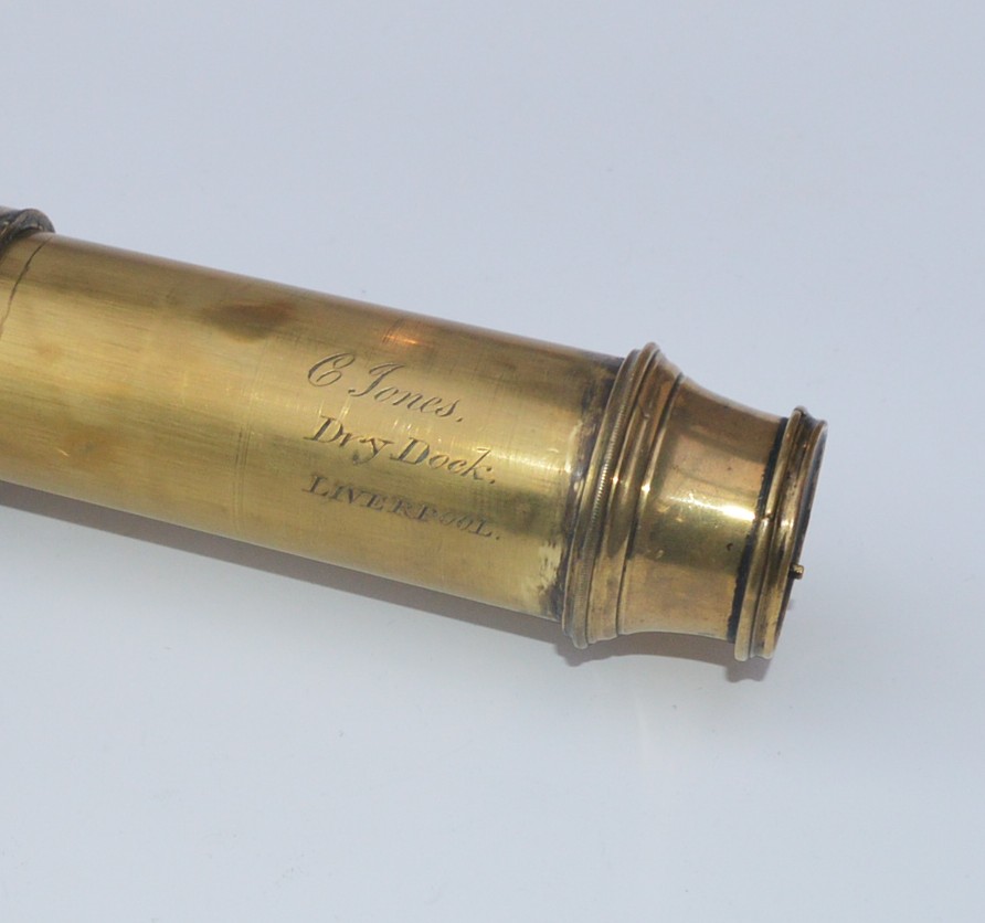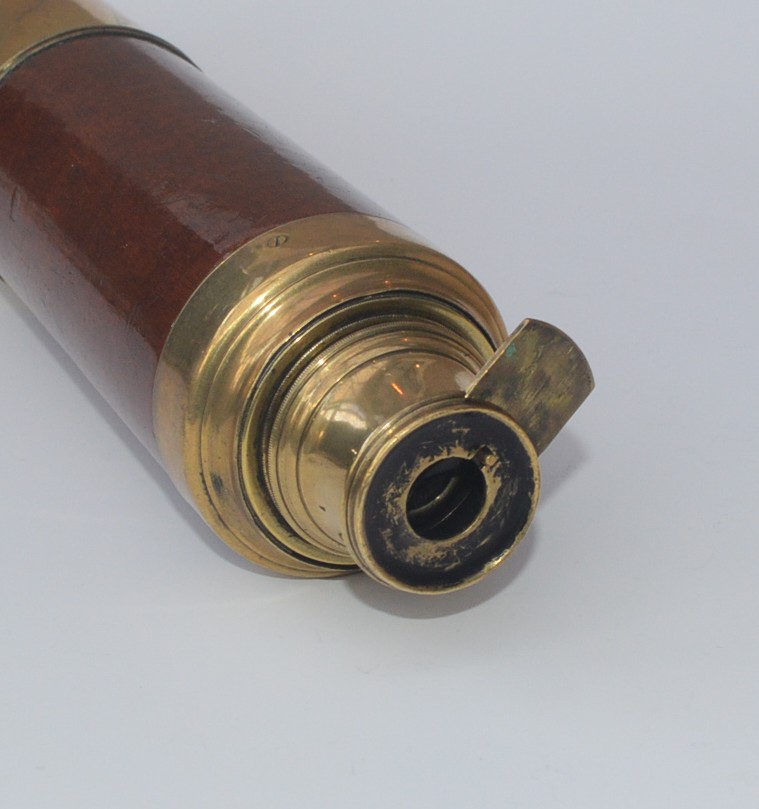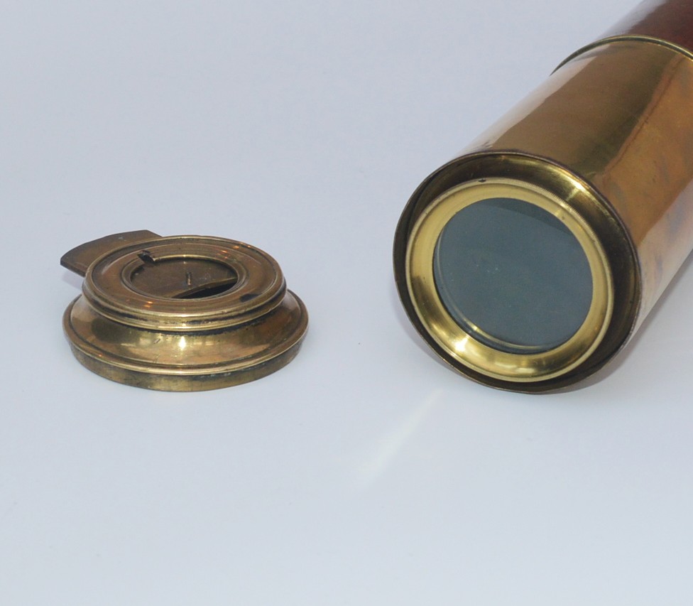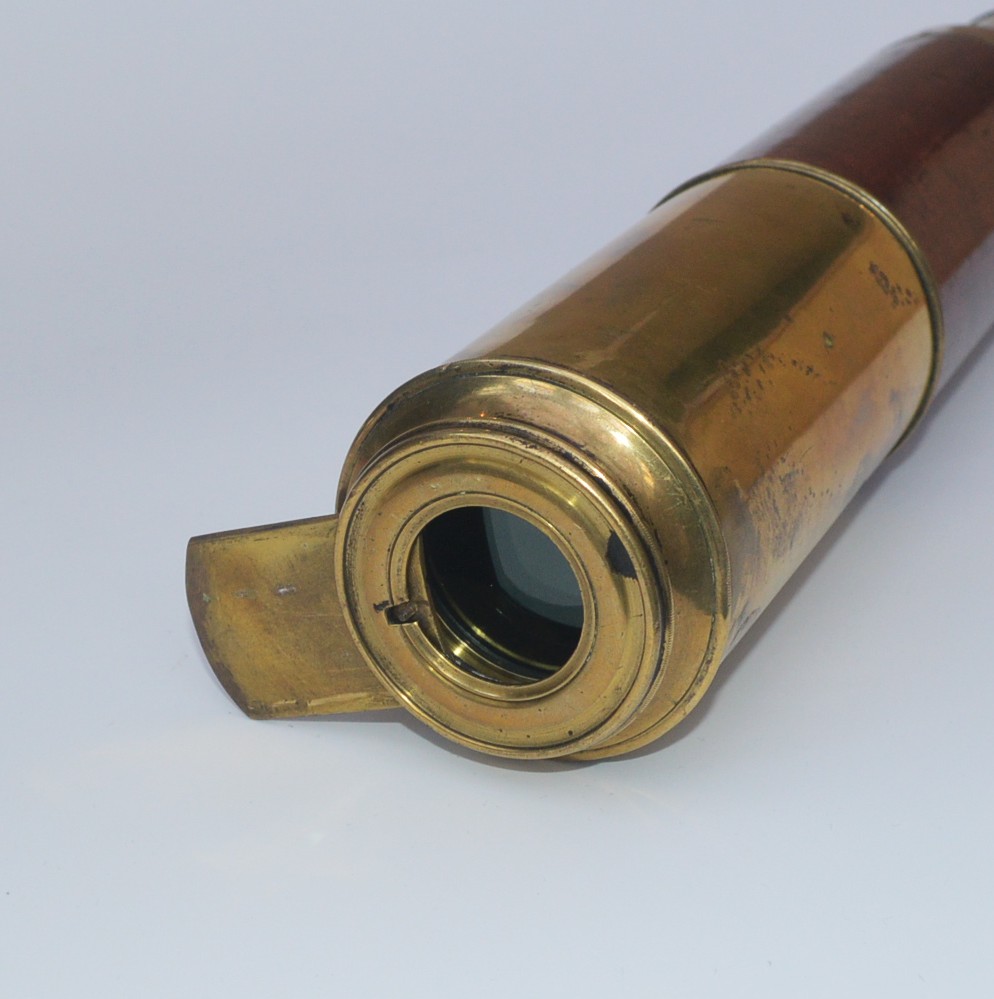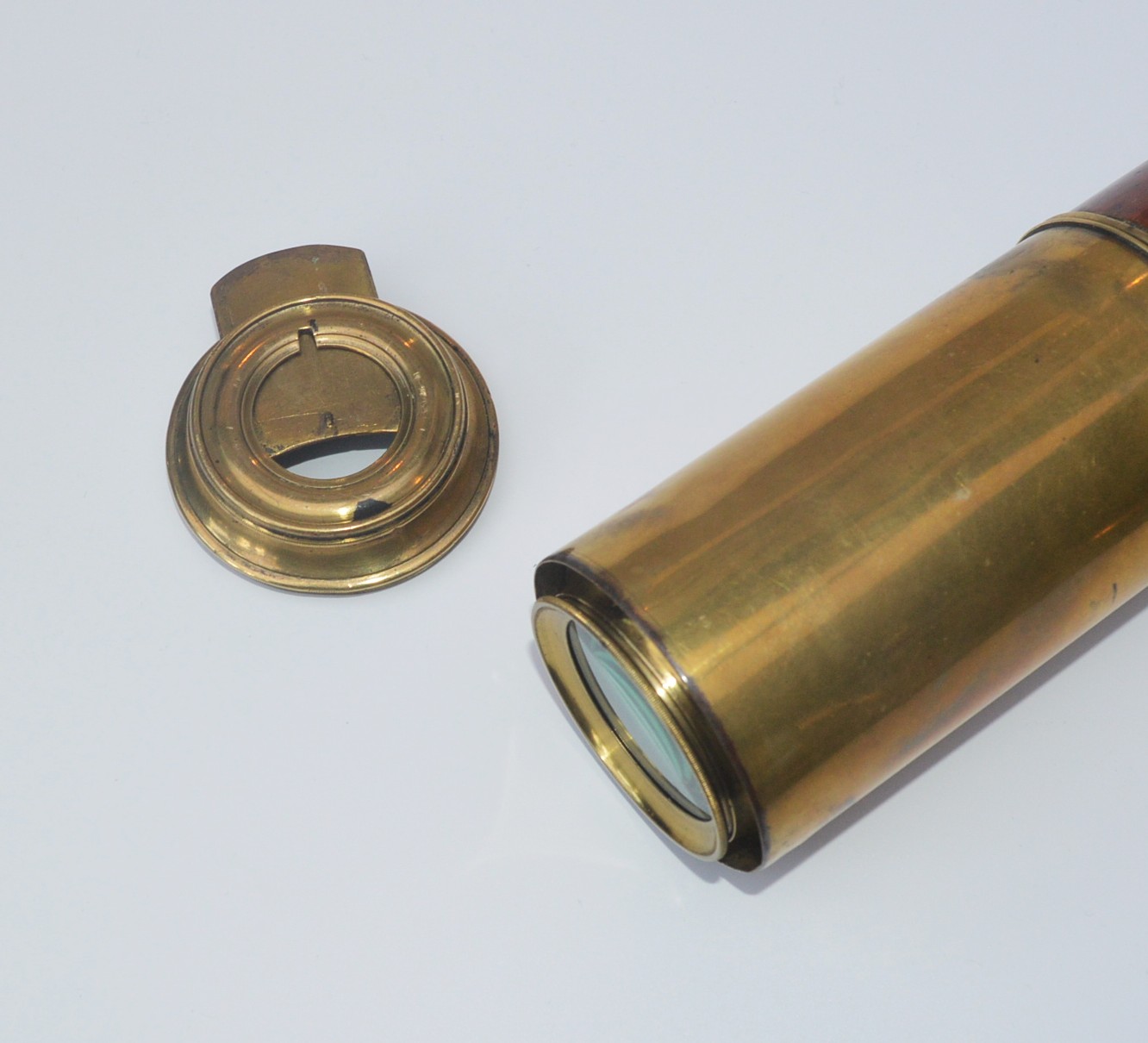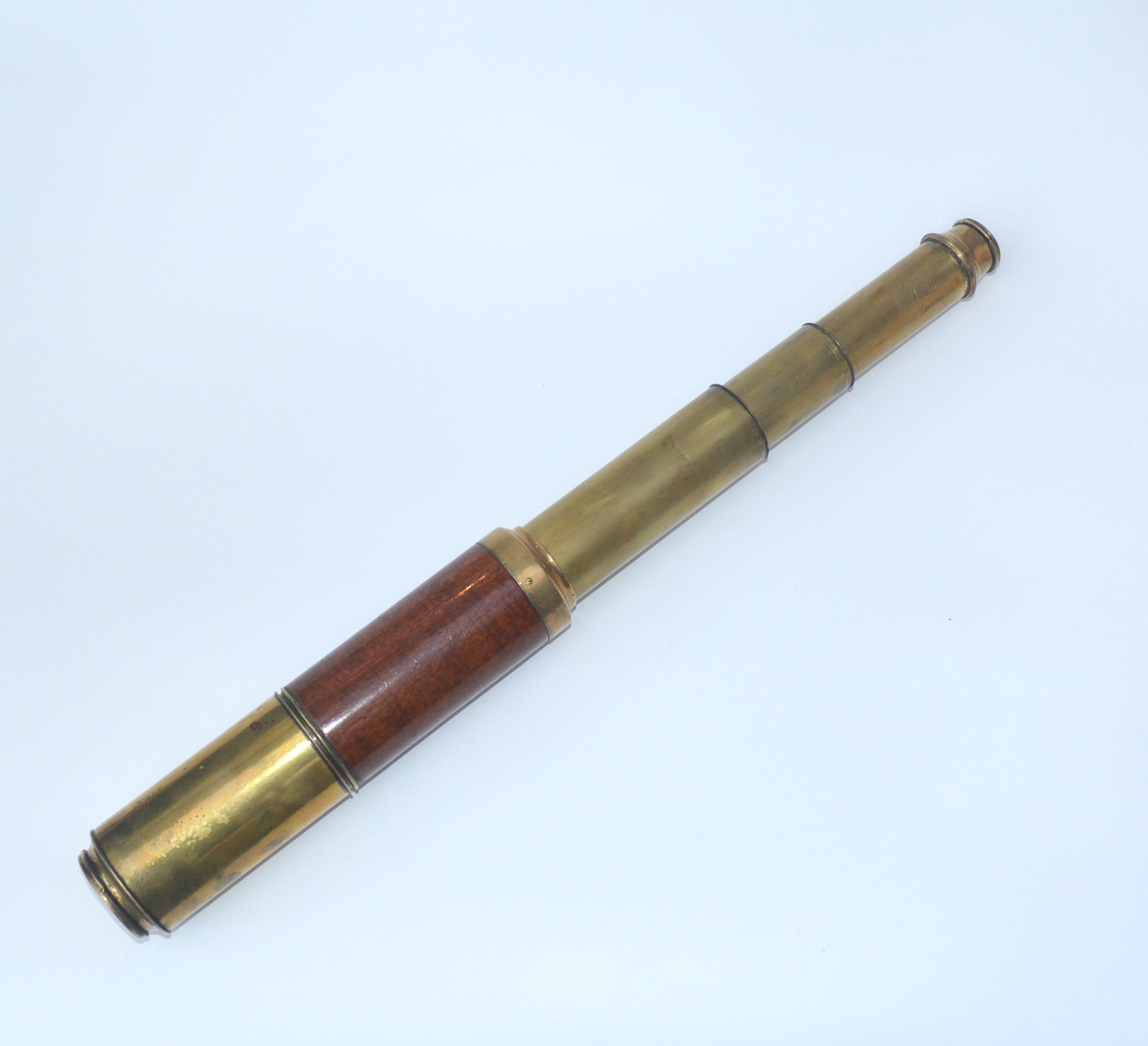 A three draw wooden barrelled brass telescope measuring 12″ long and 33.75″ fully extended with a main lens diameter of 1.5″. There are slide covers at each end of the telescope and an extending ray shade to the front. It gives a magnification of around 16 x.