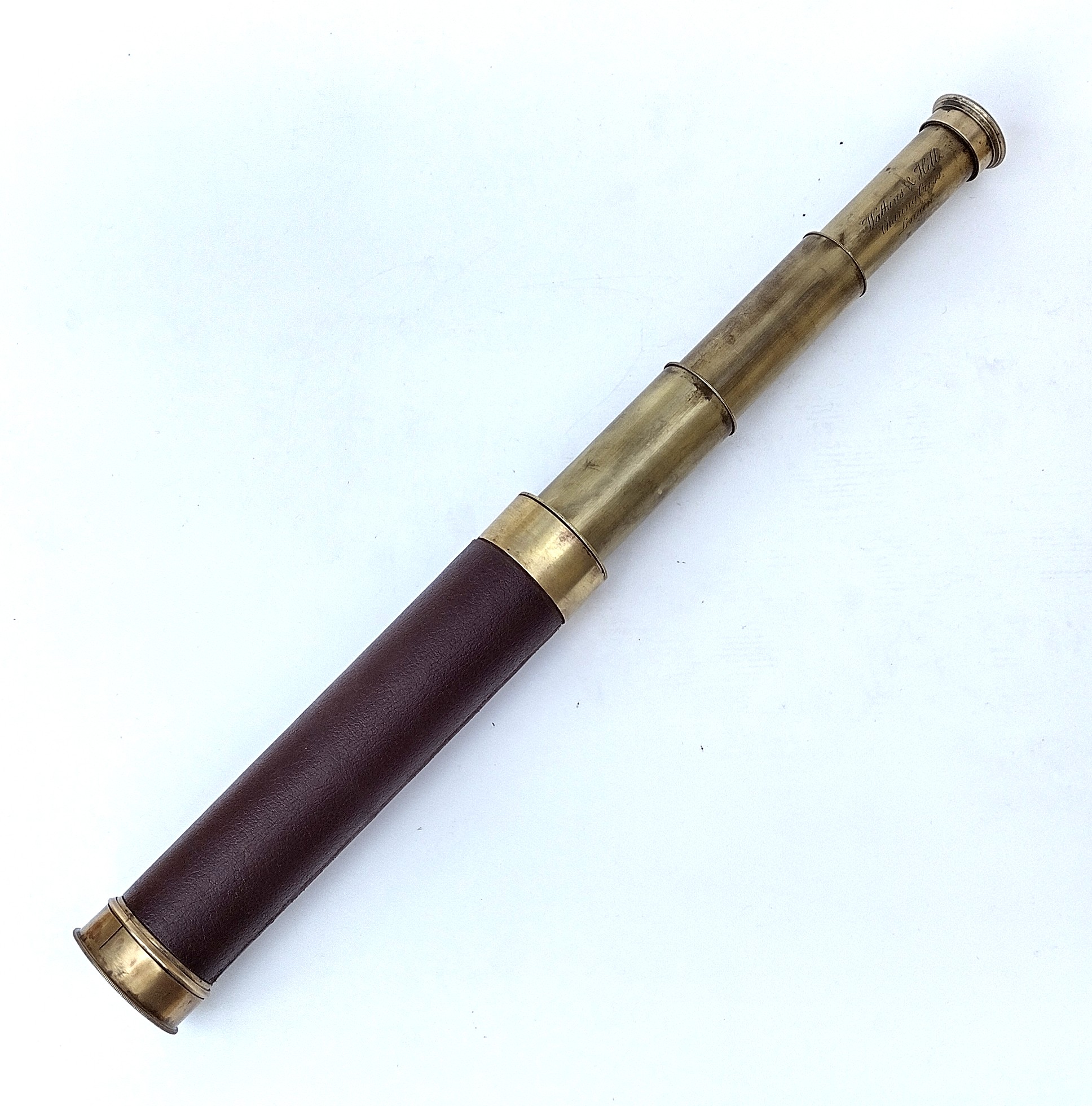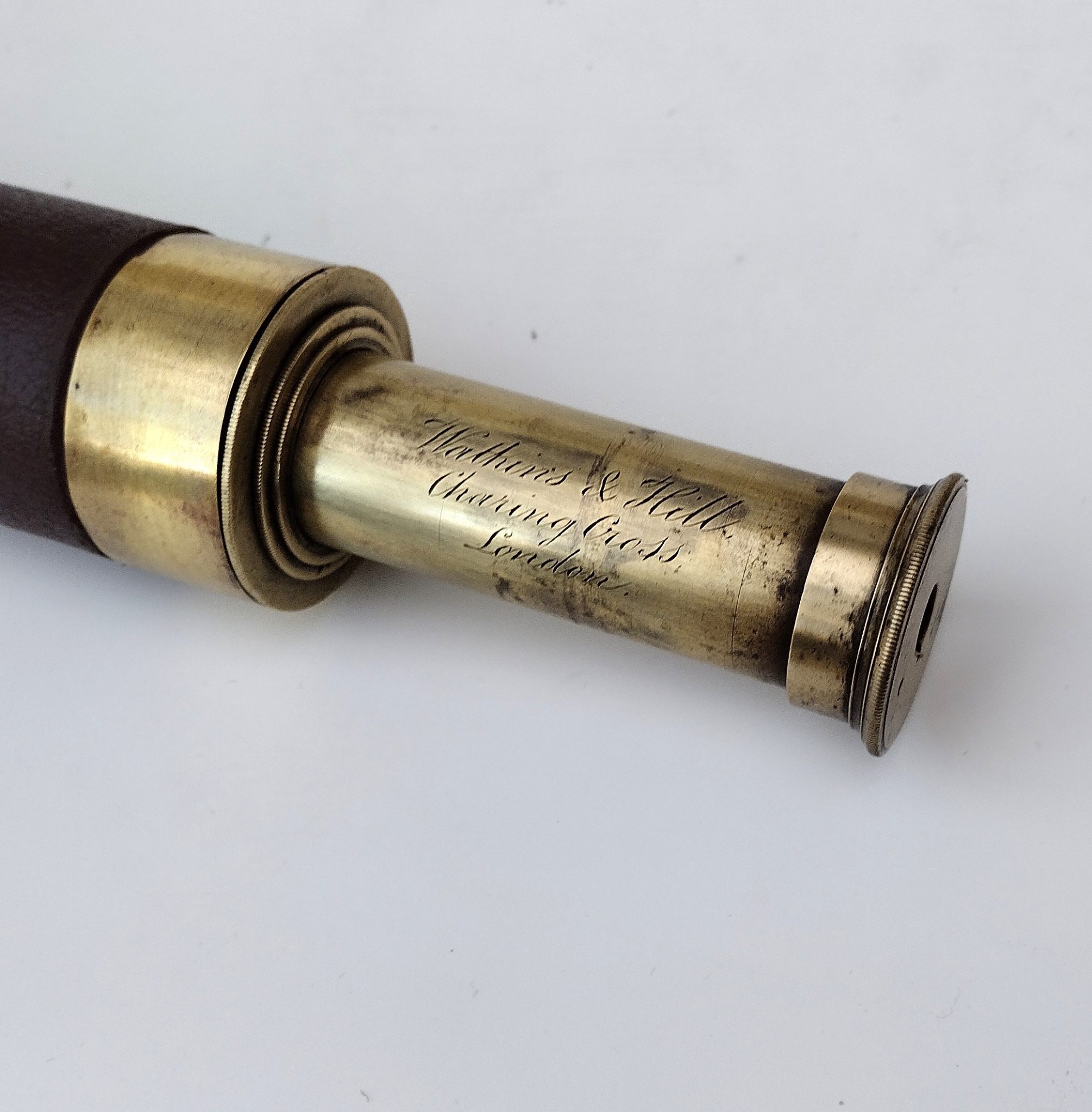 A three draw brass telescope, the first draw is engraved, ‘ Watkins & Hill, Charing Cross, London ‘.