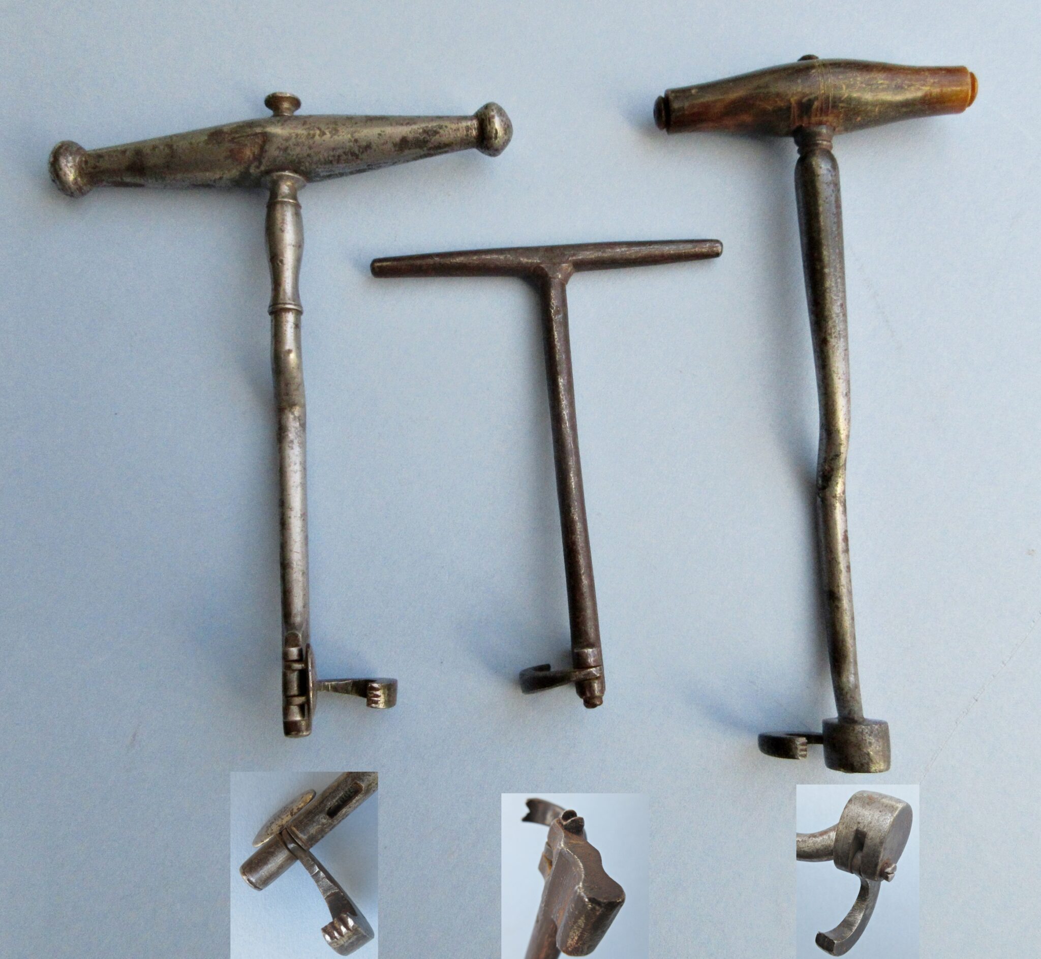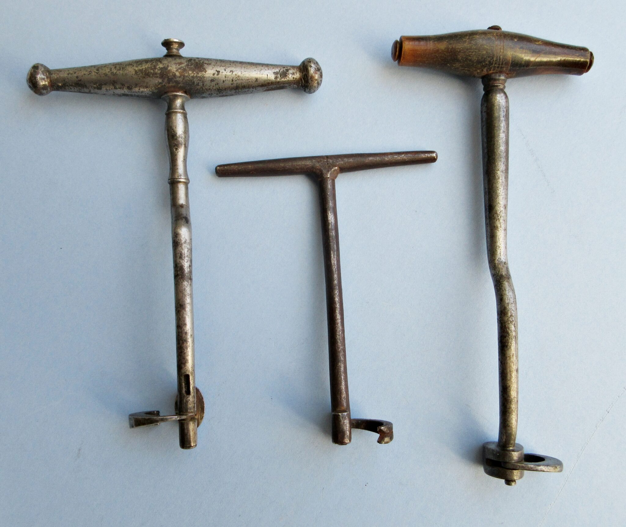 Three tooth keys. The two on either end are C1850 in date( $295.00 each) , the iron one in the center is 18th-century ($495.00). The key on the right has a turned horn handle.