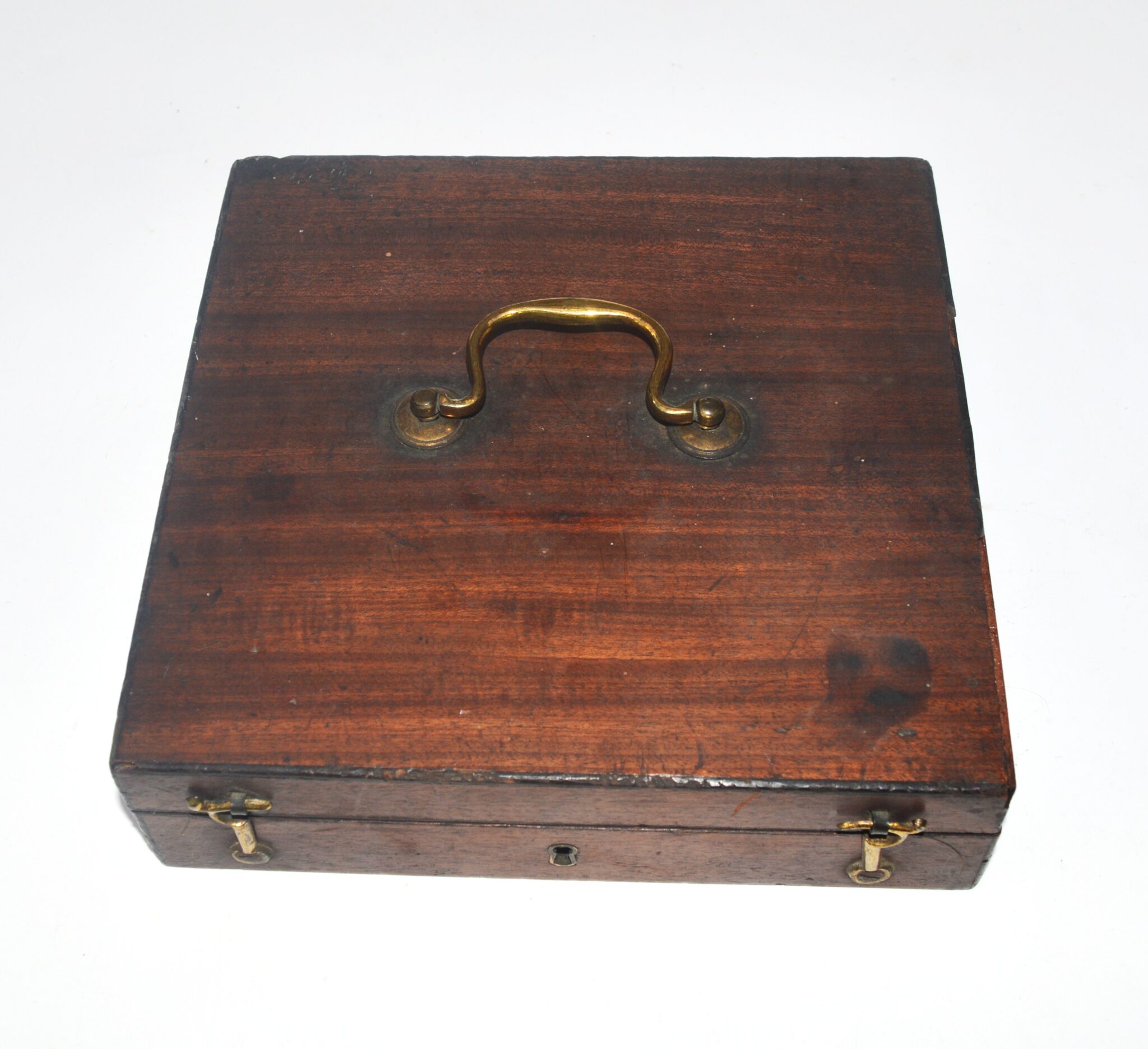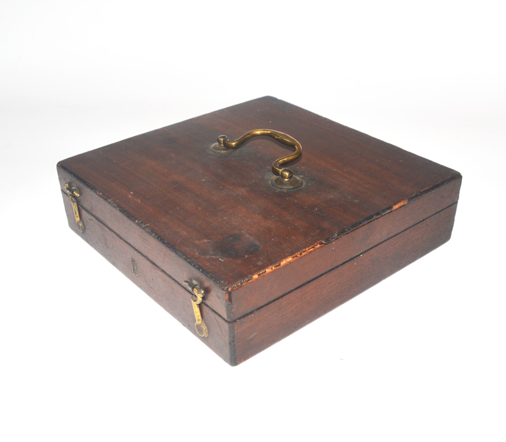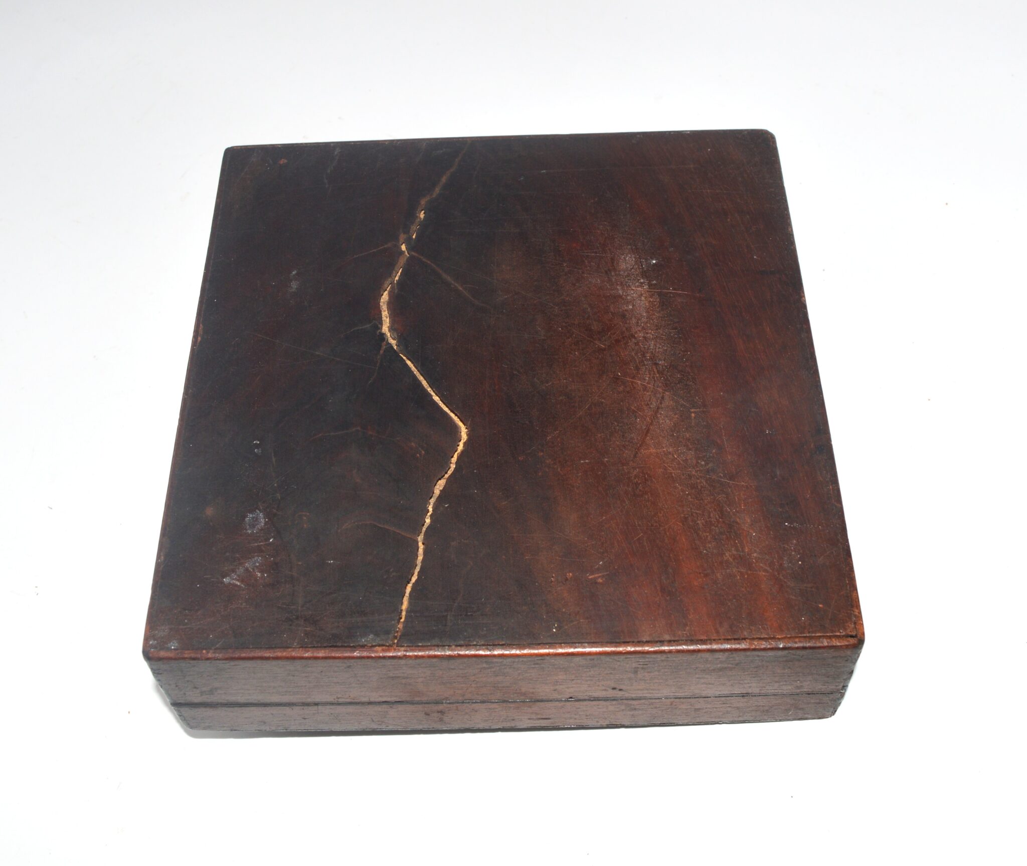 SOLD – The case measures 8 x 8 inches ( 20 cm ) and has a little loss to the edging of the lid. There is a crack to the base.