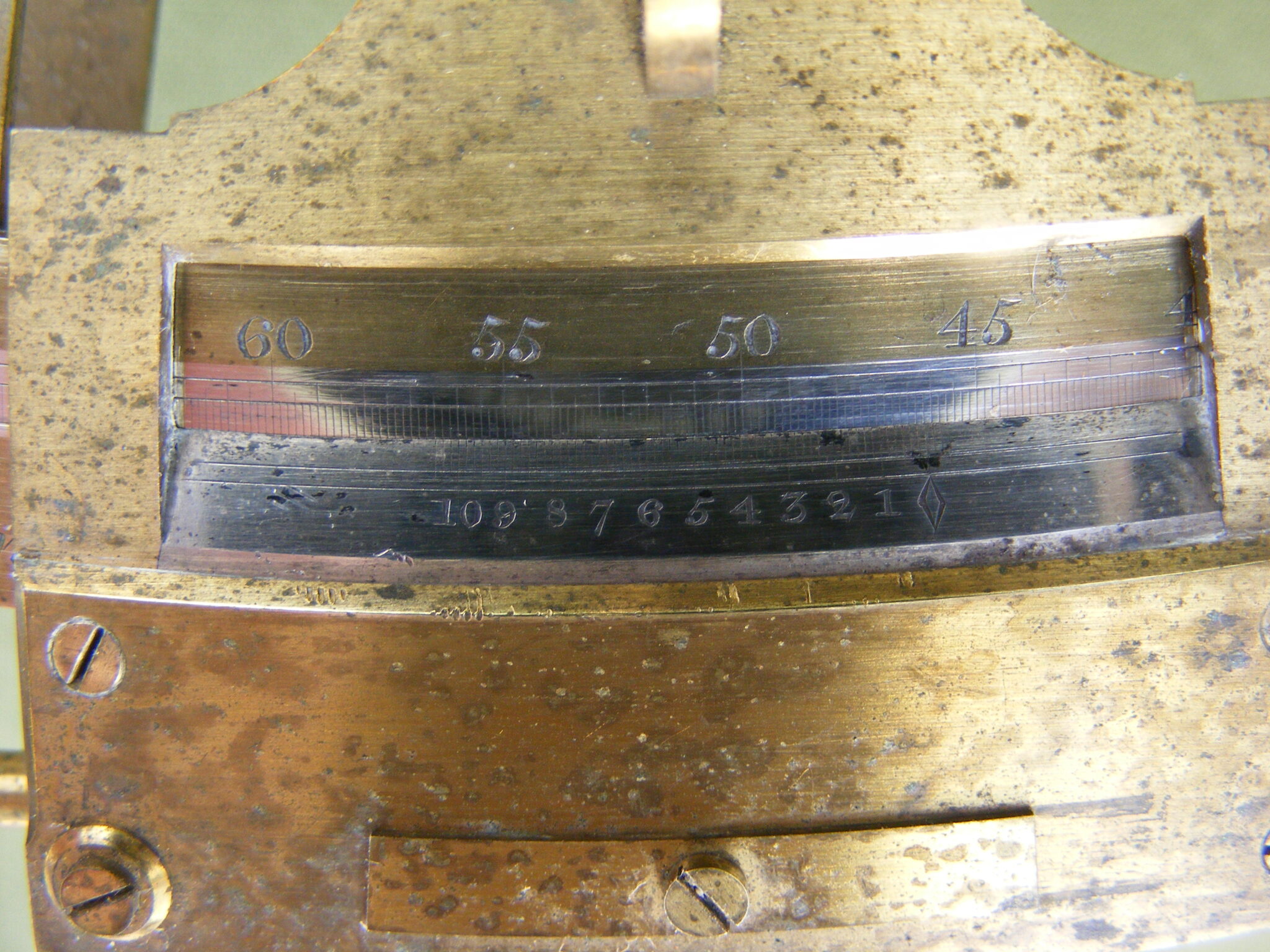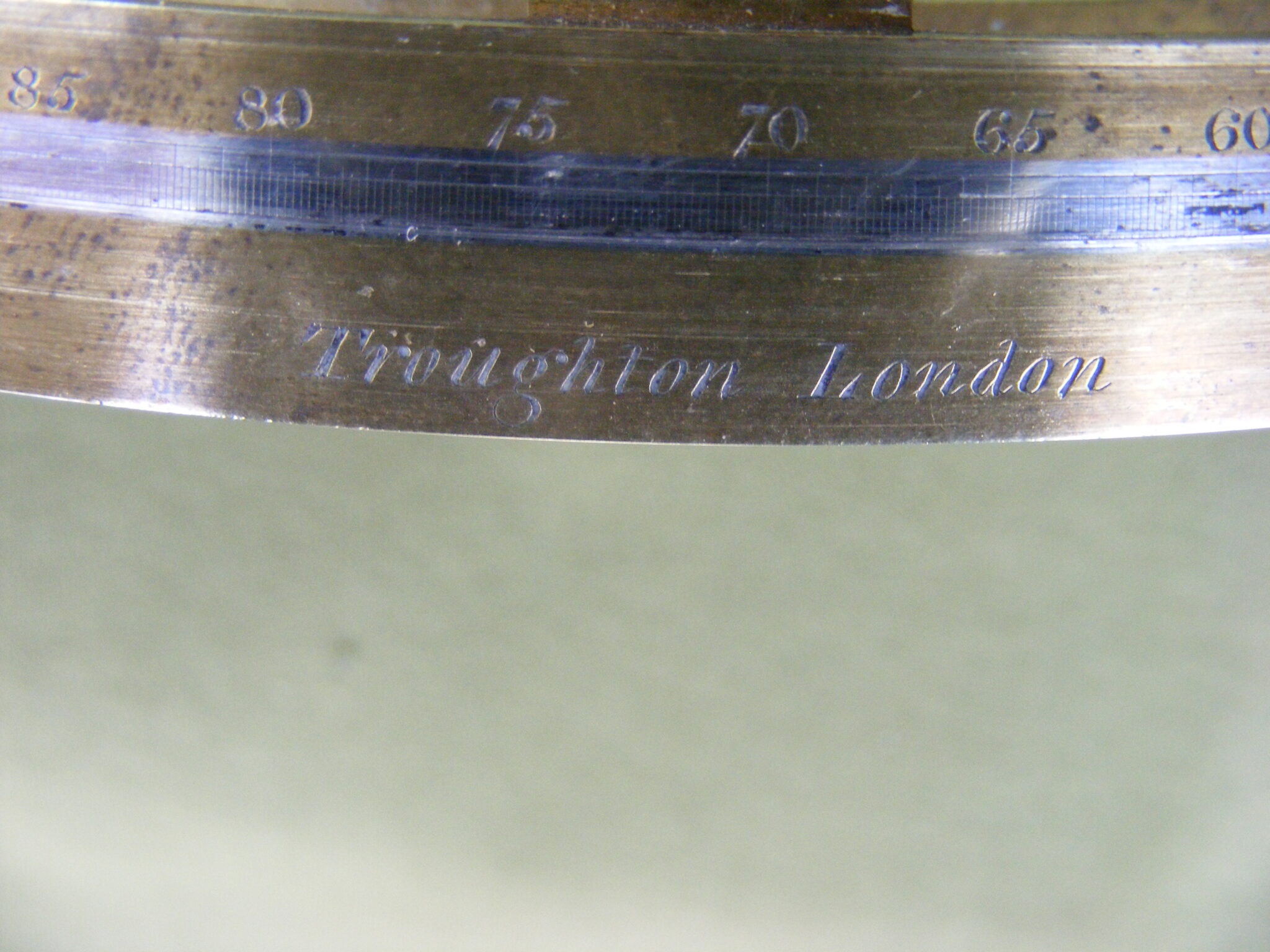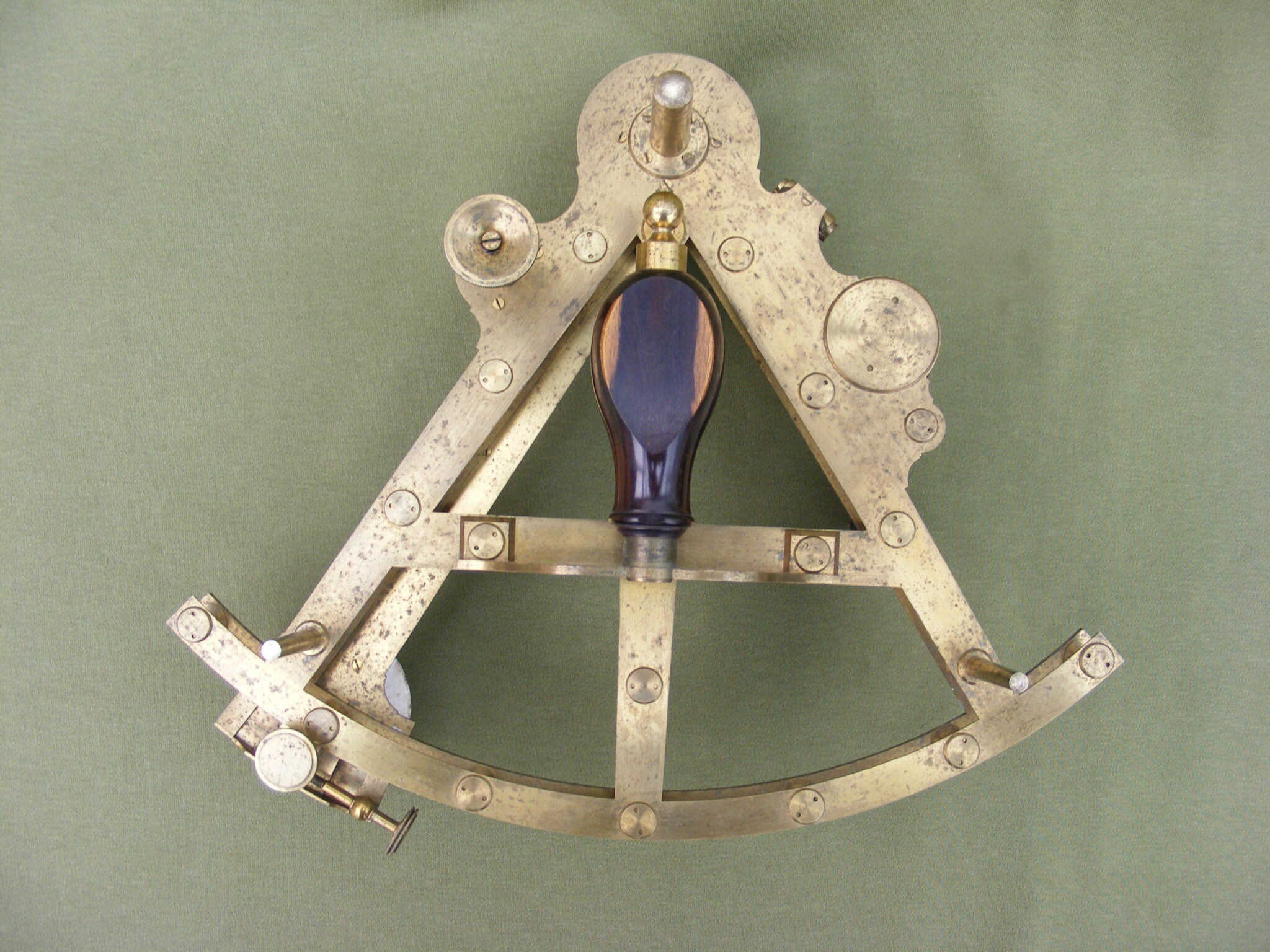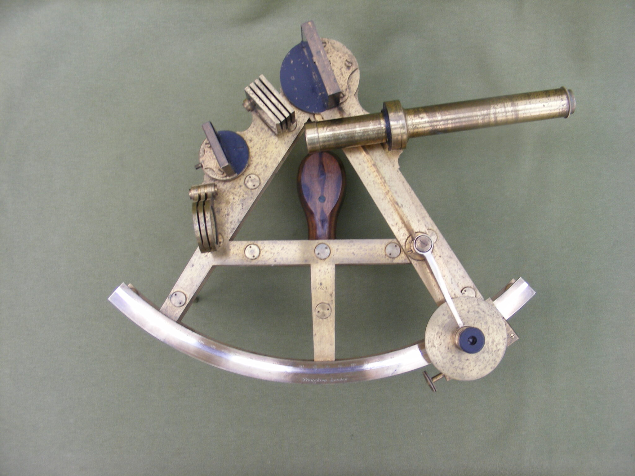 VERY GOOD PILLAR OR DOUBLE FRAMED SEXTANT SIGNED: TROUGHTON. LONDON. No.824. 8" INCH RADIUS, SILVER SCALE MINUS 5 TO 150 DEGREES DIVIDED IN 10 MINUTE DIVISIONS, VERNIER READING TO 10" SECONDS OF ARC. SIGHTING TUBE, ERECTING SCOPE, INVERTING LONG SCOPE WITH TWO EYE-PIECES & ONE FILTER CAP, PLASTER OF PARIS LIGHT REFLECTOR ON READER, LIGNUM VITAE HANDLE IN ORIGINAL MAHOGANY KEYSTONE BOX. REPAIR TO BOX.
