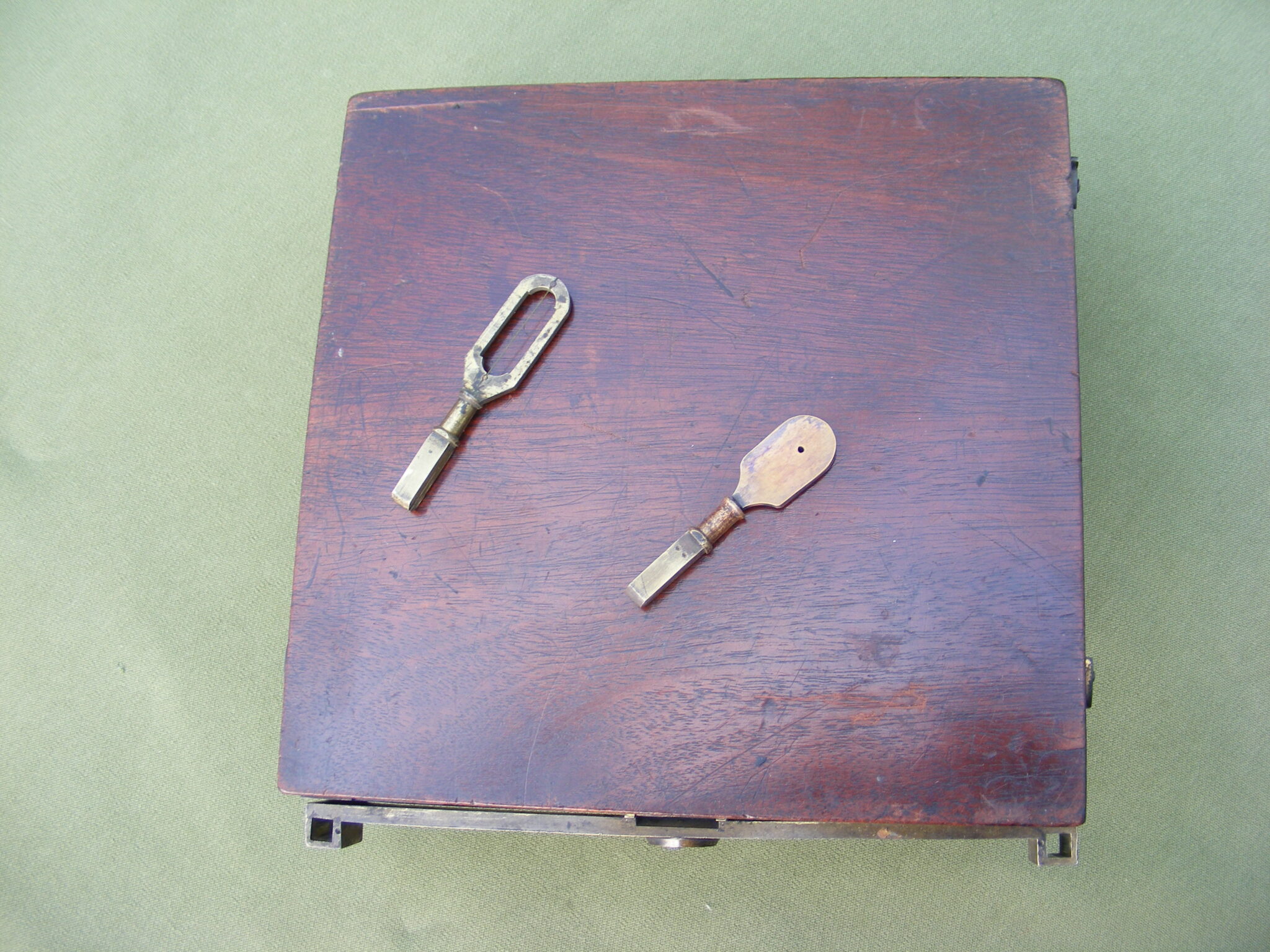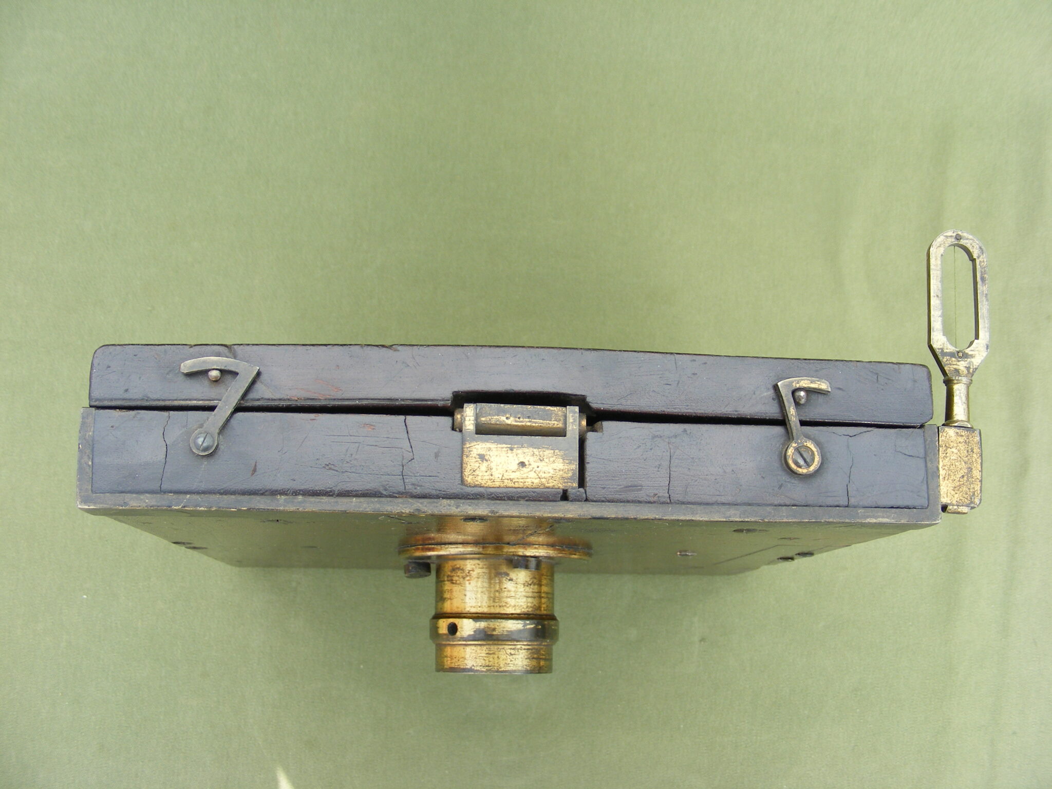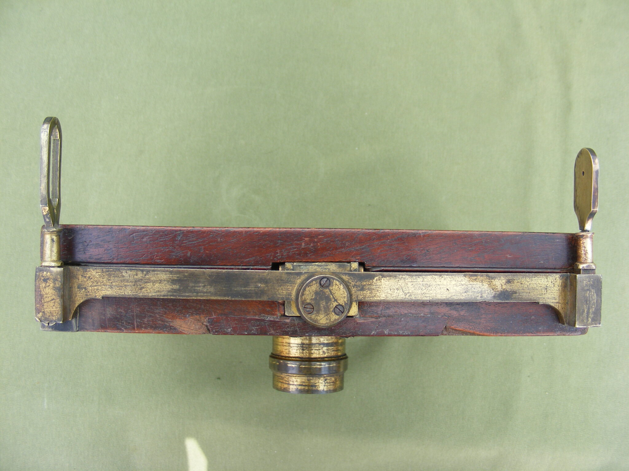INTERESTING LARGE SURVEYORS COMPASS & CROSS WITH ALTITUDE SIGHT IN MAHOGANY CASE 8" INCHES SQUARE WITH FOUR FOLDING SIGHTS & TWO INSET SPIRIT LEVELS, COMPASS BOX 5" INCHES DIA. SILVERED 8 POINT CONVENTIONAL COMPASS WITH 390 DEGREE OUTER RING, SIGNED: TANETTI & AGNEW. MANCHESTER. ALL ORIGINAL APART FROM REPLACEMENT PINHOLE SIGHT ON THE ALTITUDE SIGHT. SOME RESTORATION ON THE MAHOGANY CASE WITH A FEW MINOR CHIPS AND CRACKS.