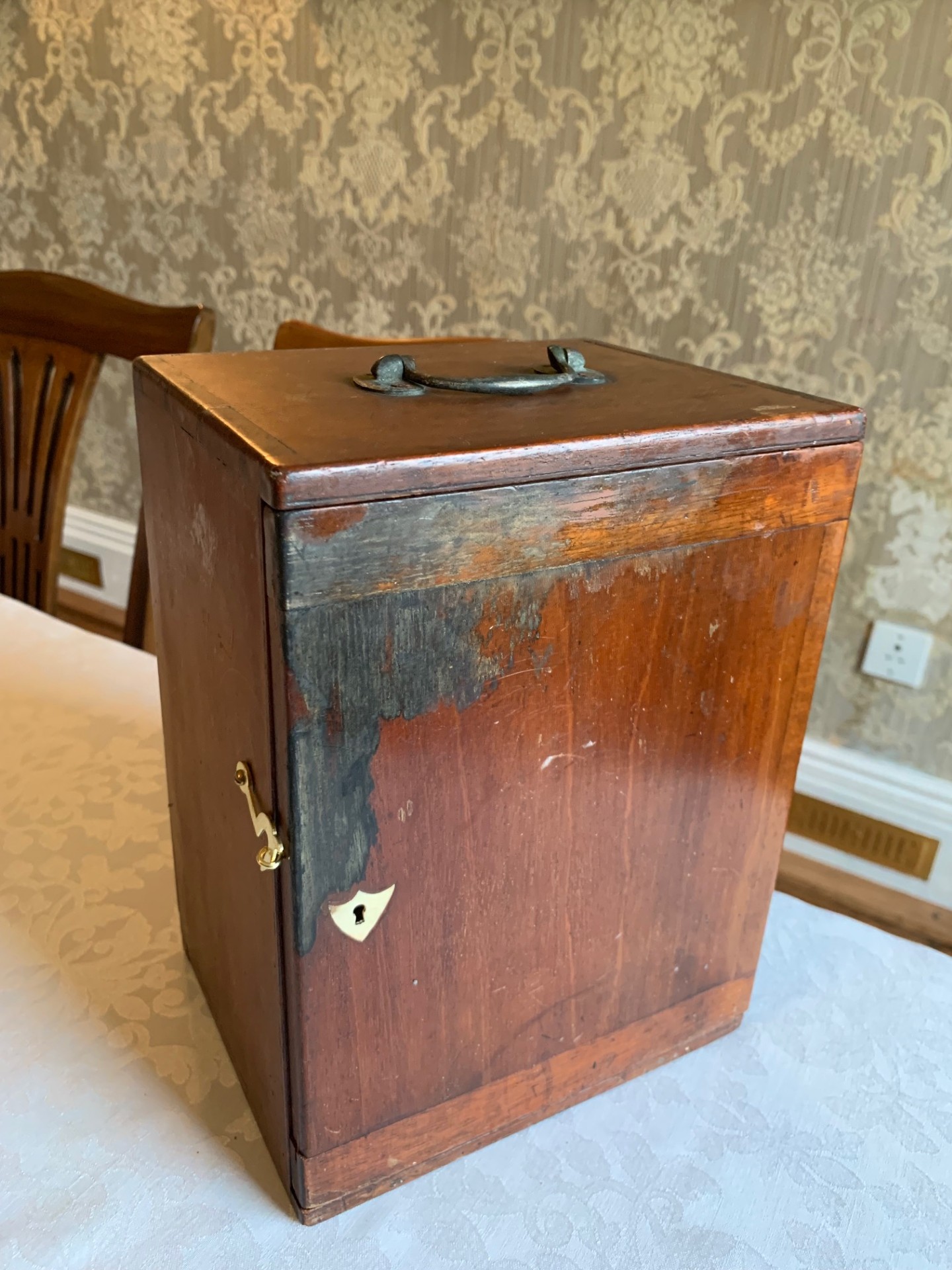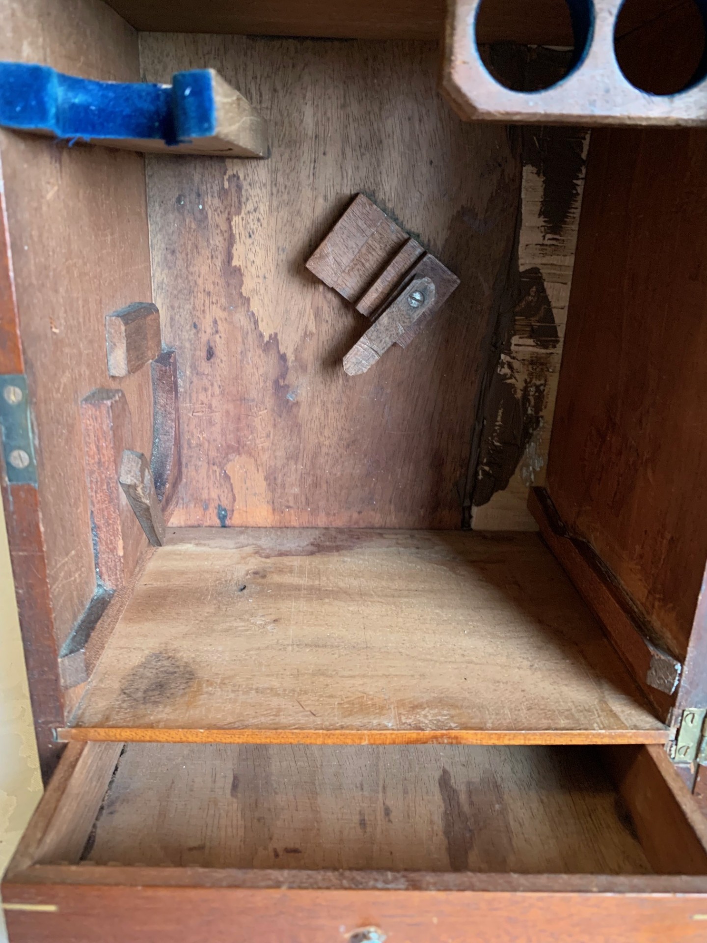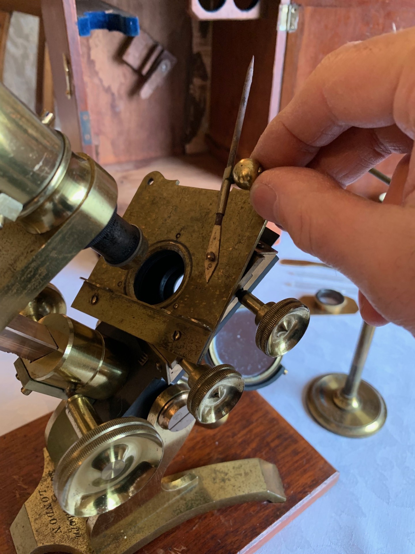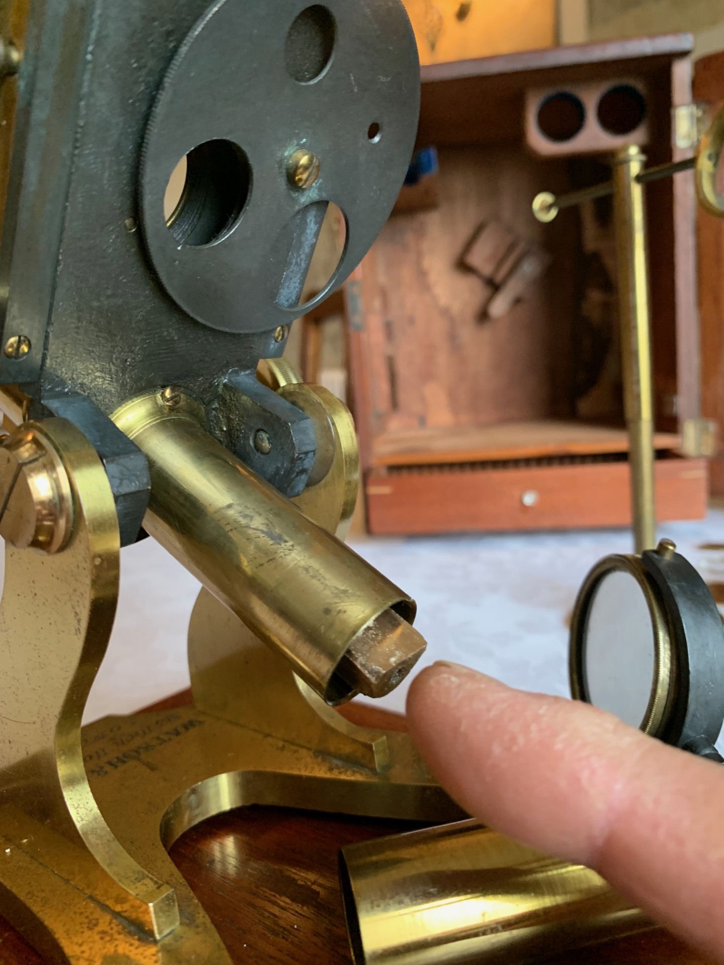 There’s an original fitted case probably in mahogany that’s showing some age and has a repaired area to the rear panel. It’s still in usable condition with appropriate external finish showing some water damage to the front surfaces, internal fittings, drawer for slides, brass carry-handle and a lock & key that are missing, so it’s got a cupboard latch to keep the door closed, which works well. In order to store the microscope away in its case, the optical tube has to be removed – it just unscrews, so is easy to remove and as shown it fits into a recess in the case.