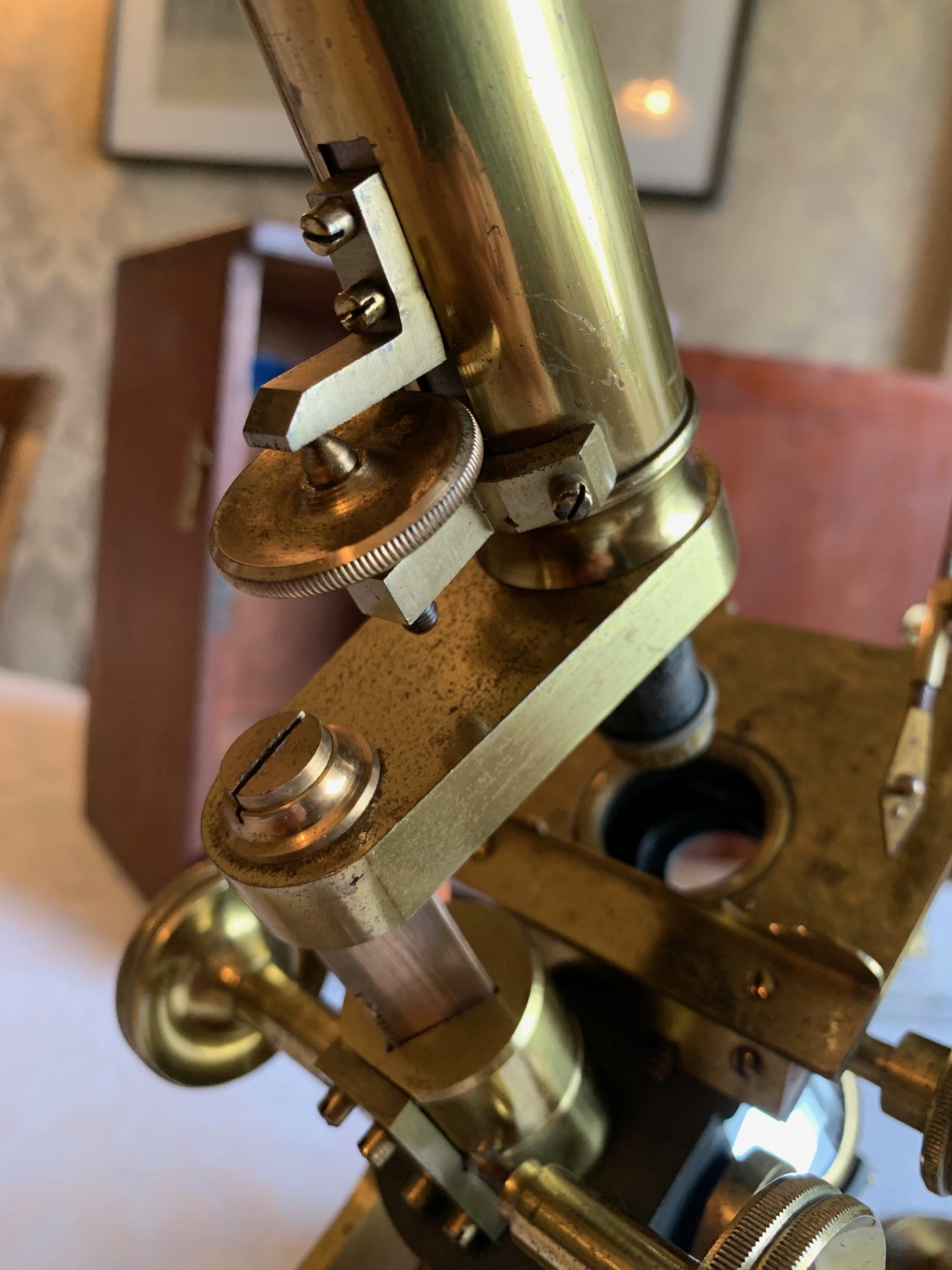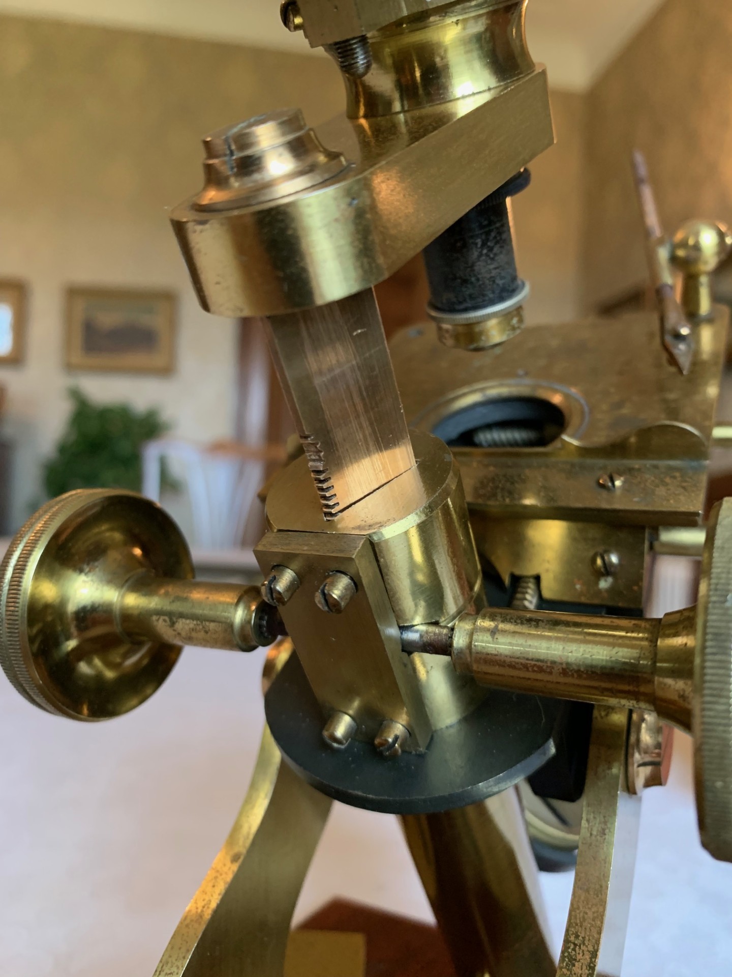 Technical details – the construction is a lacquered brass y-shaped foot – the firm’s name is engraved to the rear of the foot. There’s also a wooden base-plate in the case that can be used to give extra stability when in use, if so desired. From the foot twin uprights support a pivot and a bar-limb arrangement, comprising triangular section limb. Coarse focus is by a rack and pinion system with optical tube in brass. The coarse focus works well holding in position as it should with straight cut rack, with just a couple of teeth missing at the very bottom of it’s range of travel, which is outside the normal working range. The coarse focus rack can be moved manually by removing the mirror slider and just pushing up from underneath to re-engage the rack as needed. Fine focus is controlled by a brass thumb-wheel at the rear of the optical tube just above the bar, which also works well with good smooth fine adjustment.