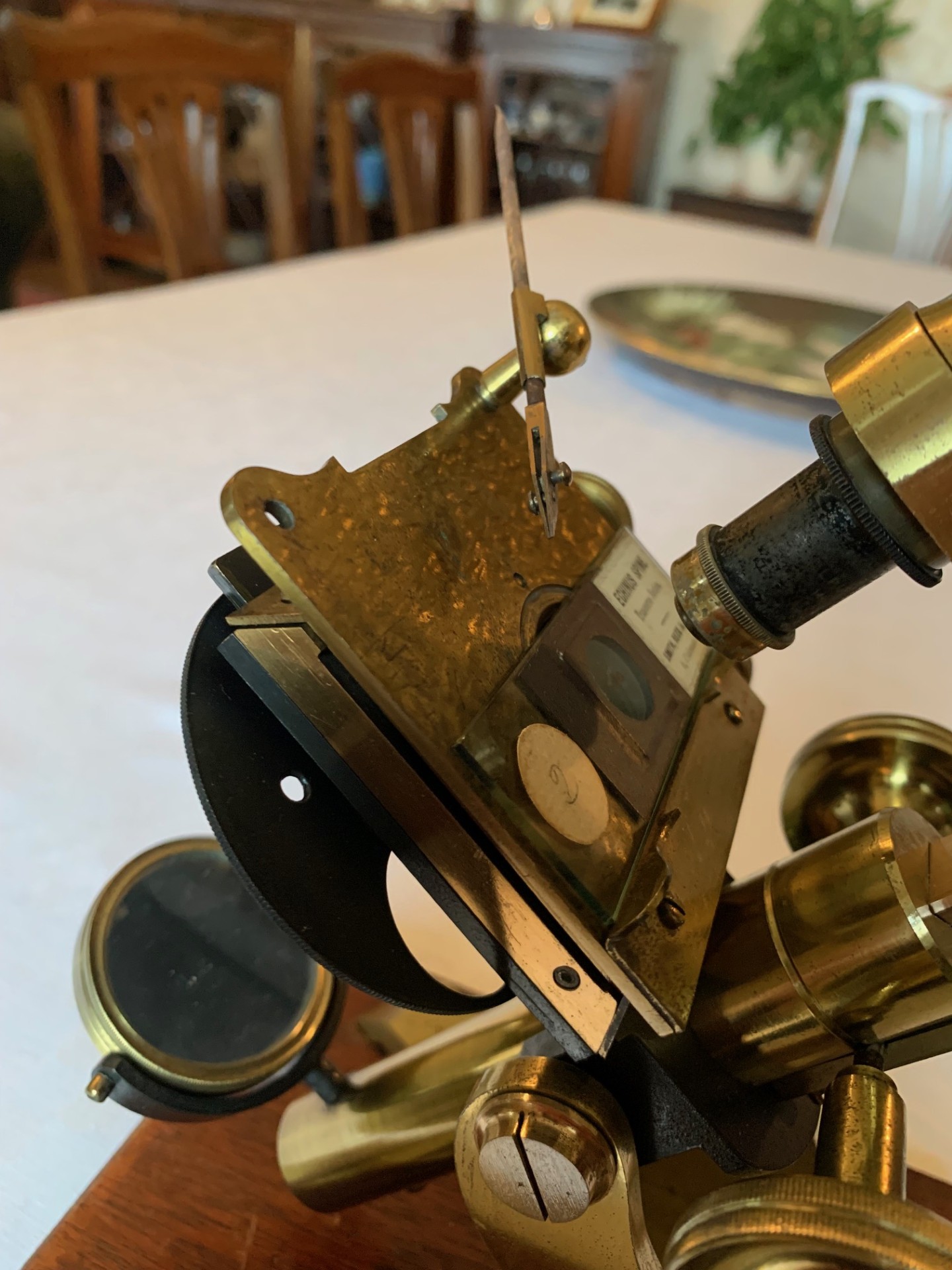The magnification available with its current set of optics is therefore 60x to 240x. I’ve tested the optics with various antique slides and the images produced are acceptable for the age of the optics when using suitable illumination. The 1/6th inch objective is a little cloudy internally.