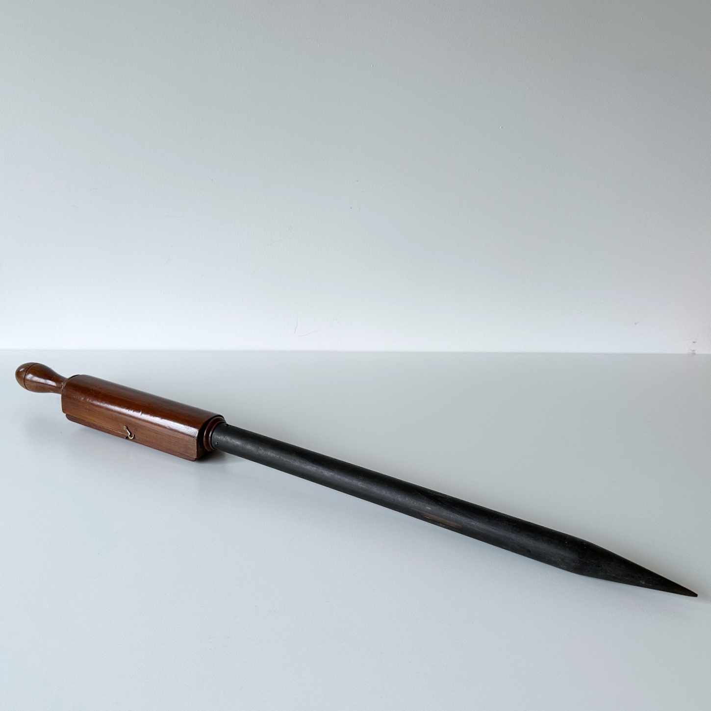 The thermometer is protected by a hinged mahogany door with hook and eye catch to the front of the scale and is topped with a turned mahogany handle for easy insertion and extraction from the soil. The instrument measures 77cm in length.