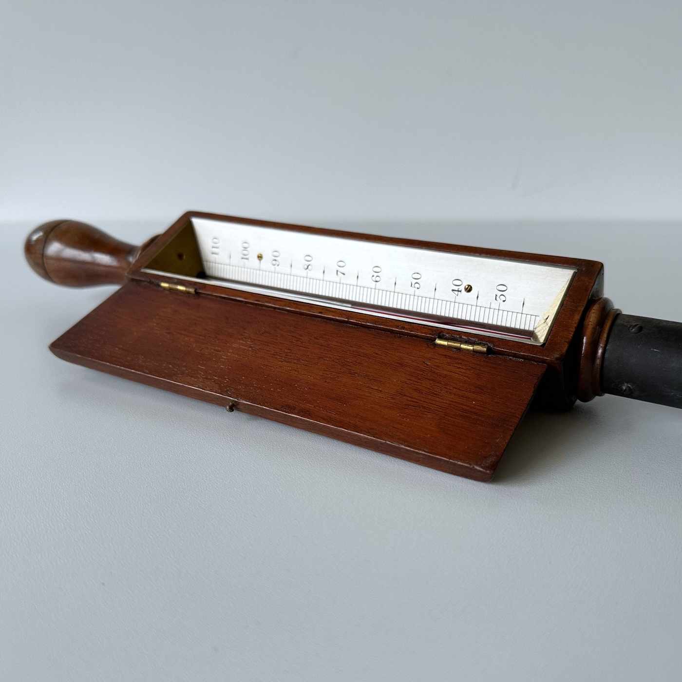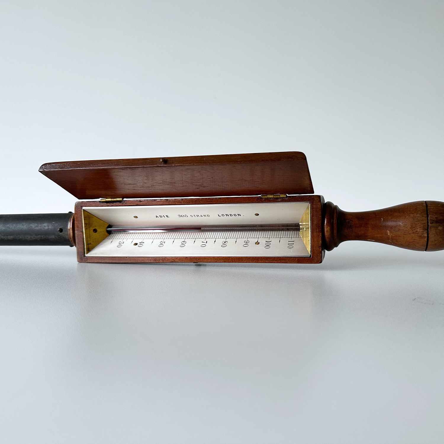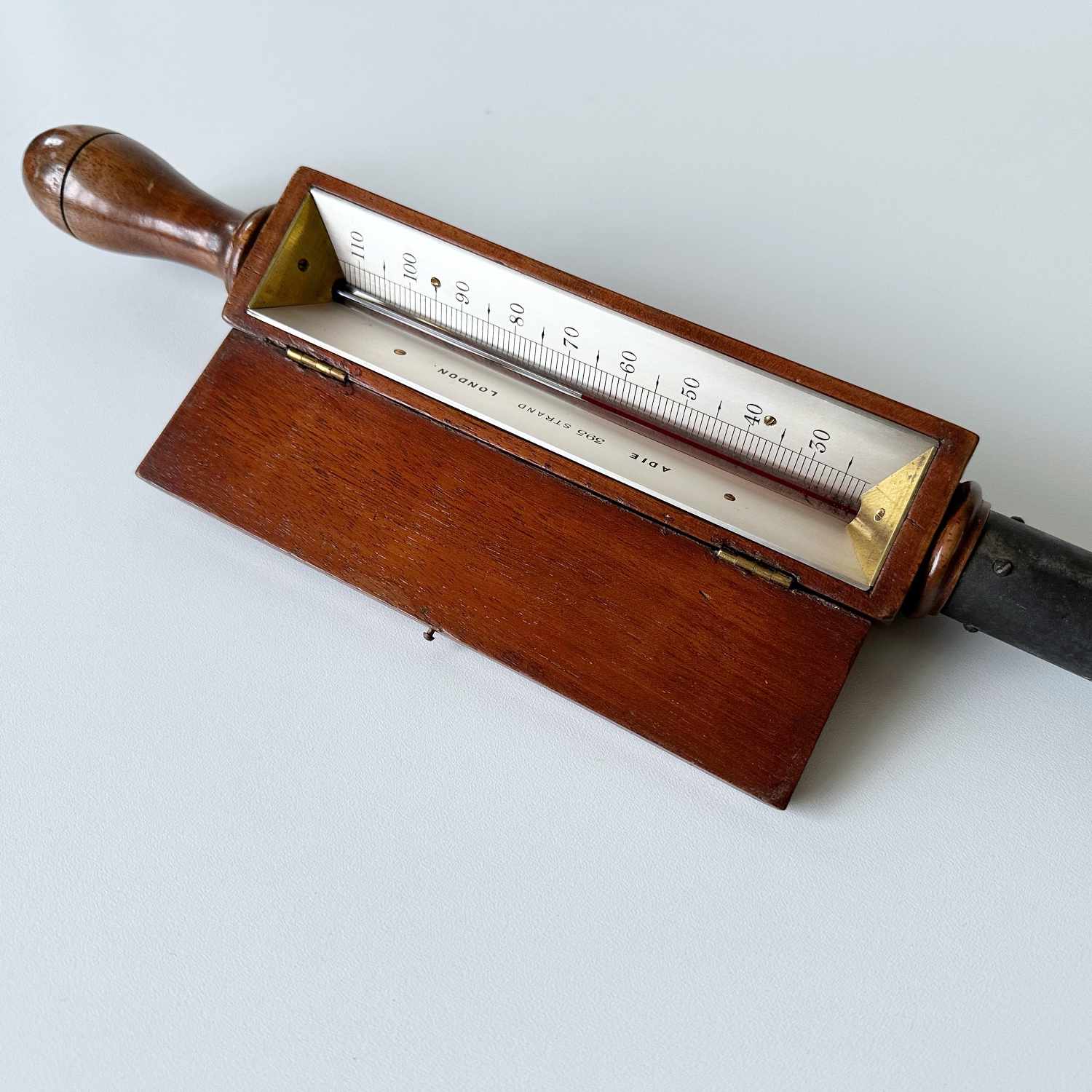 Comprised of a black painted brass tube with spiked end surmounted with a mahogany frame containing a two-piece inverted thermometer scale each side of the thermometer tube which runs through the length of the instrument. The scale is divided for 30 – 100 degrees Fahrenheit and is engraved to the maker, “Adie 395 Strand, London”