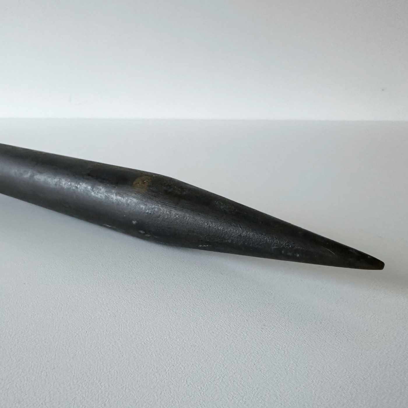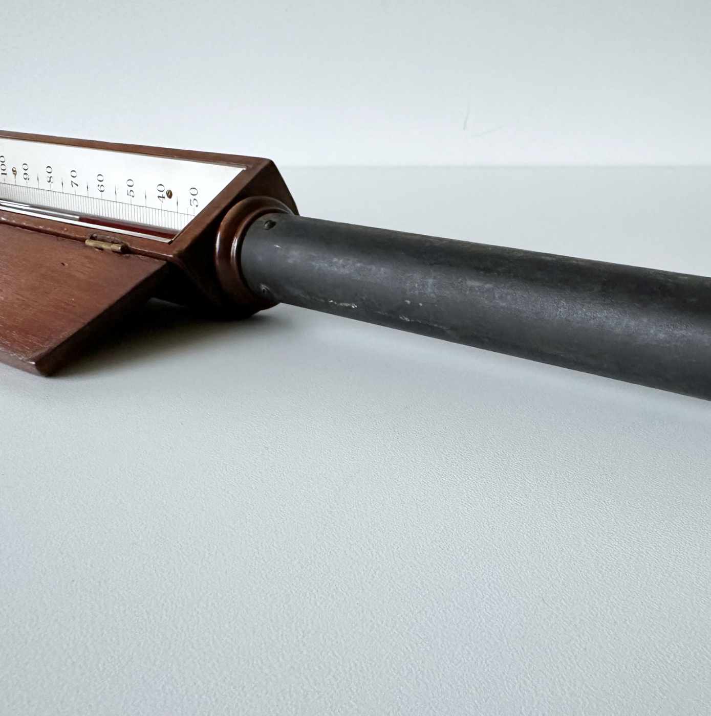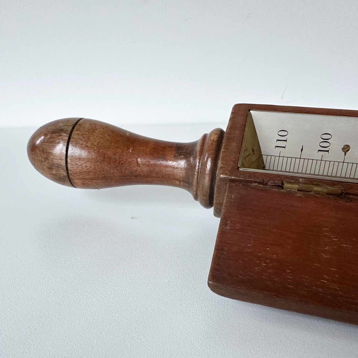 Comprised of a black painted brass tube with spiked end surmounted with a mahogany frame containing a two-piece inverted thermometer scale each side of the thermometer tube which runs through the length of the instrument. The scale is divided for 30 – 100 degrees Fahrenheit and is engraved to the maker, “Adie 395 Strand, London”