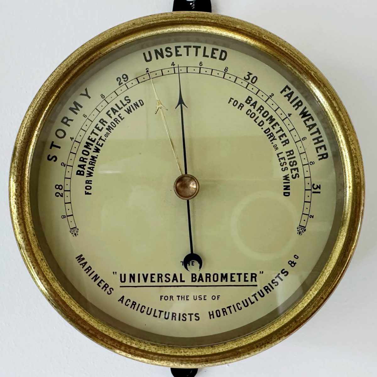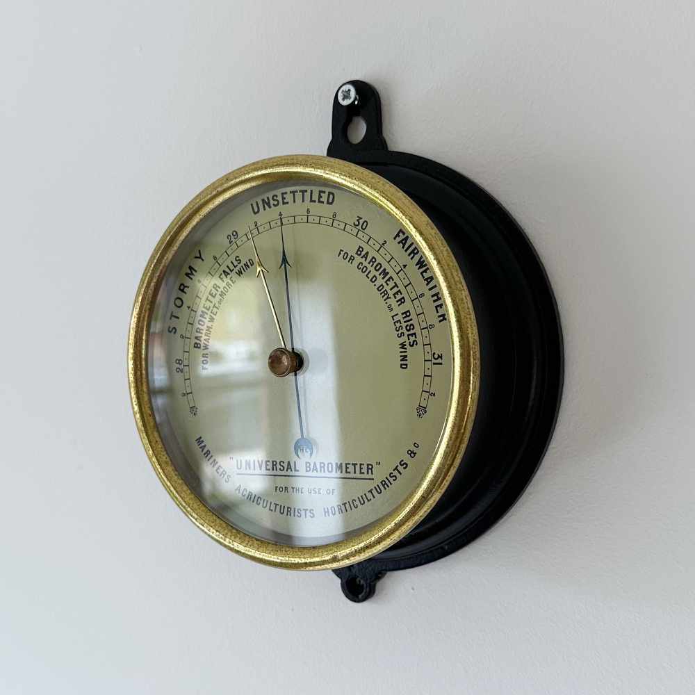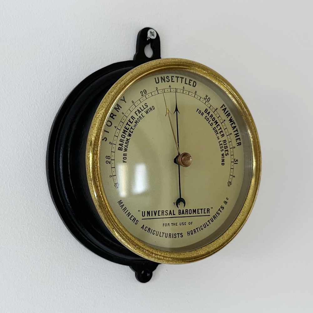 Comprised of a graduated painted iron case with brass bezel and 5” painted dial measuring 28 to 31 inches of barometric pressure. It has a somewhat unusual set of weather indications with the use of Stormy, Unsettled and Fair Weather to the outer circumference, Admiral Fitzroy type indications underneath the scale which is itself divided into twentieths of an inch.