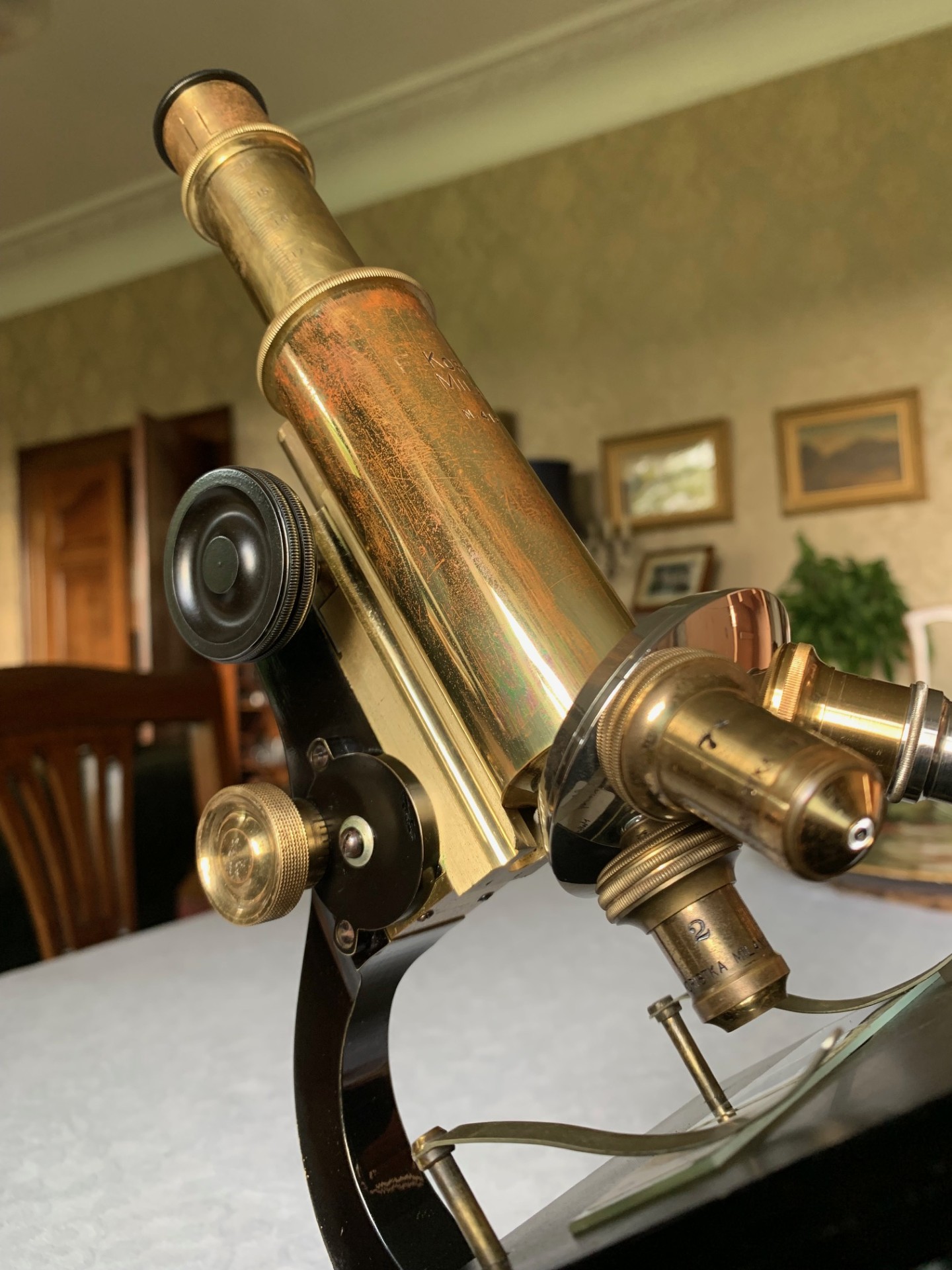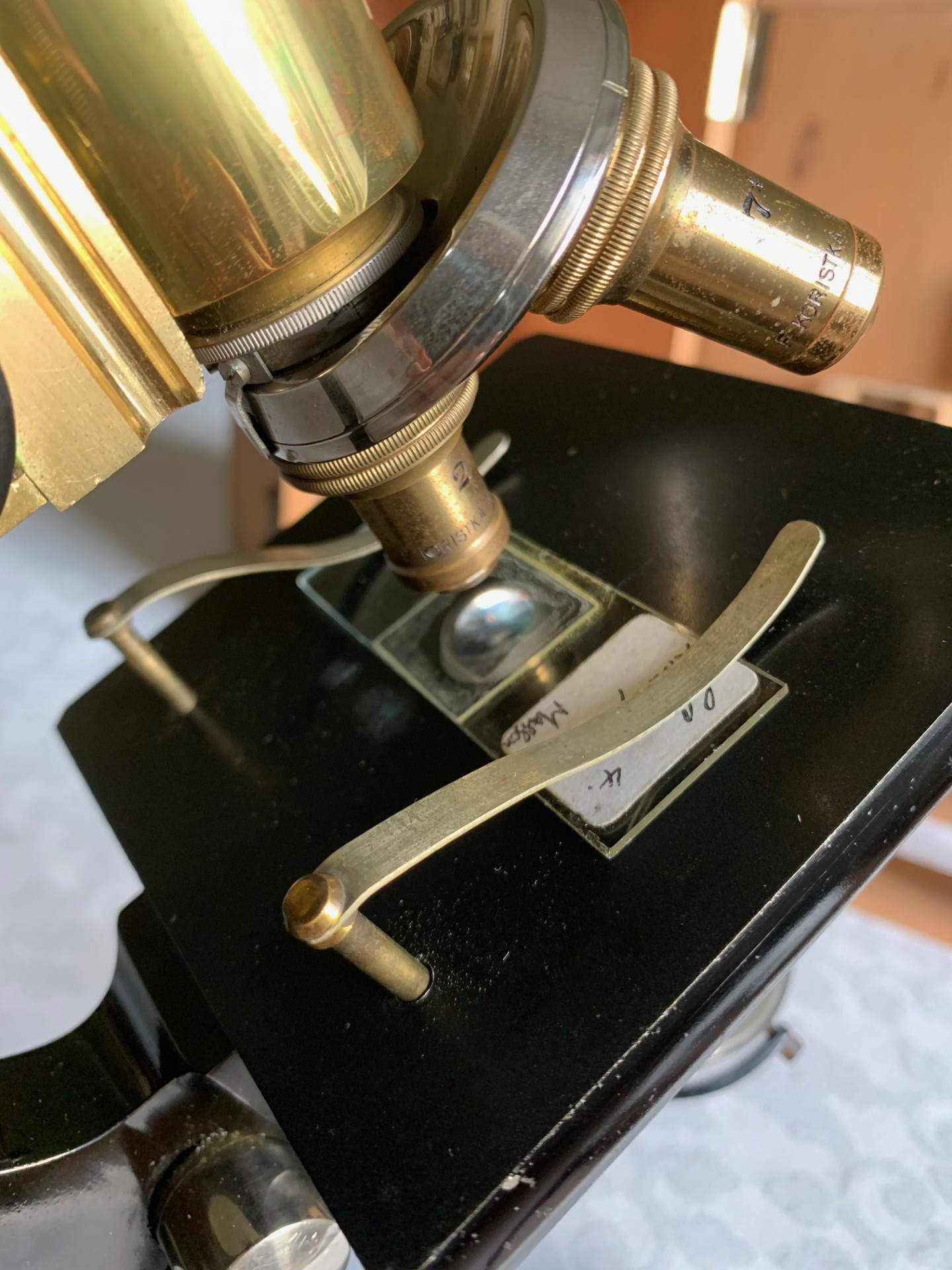 With the optics, this microscope comes fitted with a graduated brass eyepiece draw-tube that sits inside a brass main optical tube. There’s four quality vintage eyepieces that with adequate illumination produce good images: