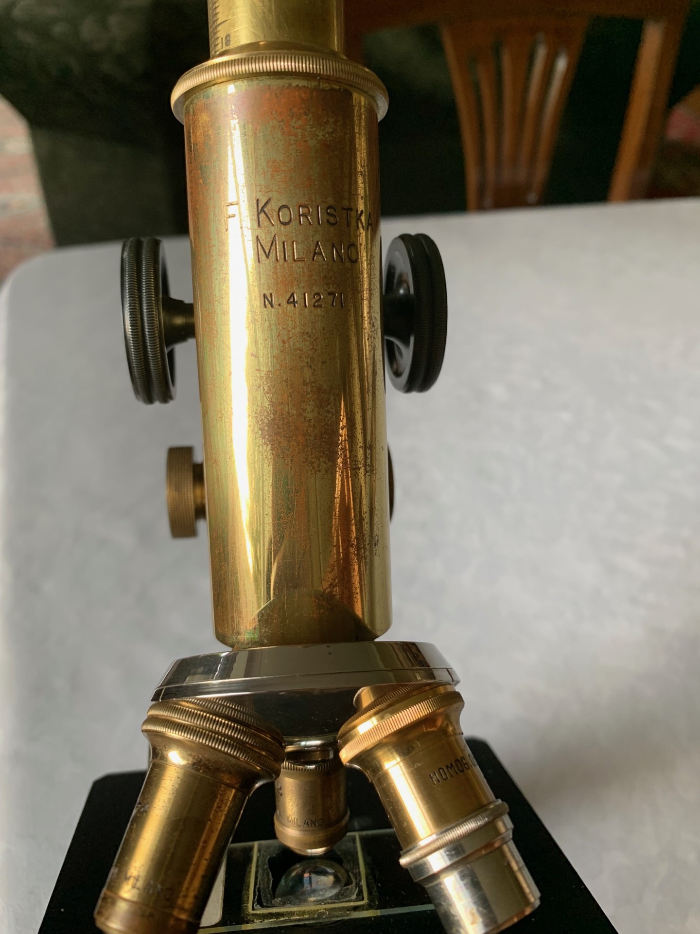 Generally good cosmetic condition example of an Italian-made brass monocular microscope by makers F. Koristka of Milan. Nice example with some age-related patination, working well, with a good set of period optics.