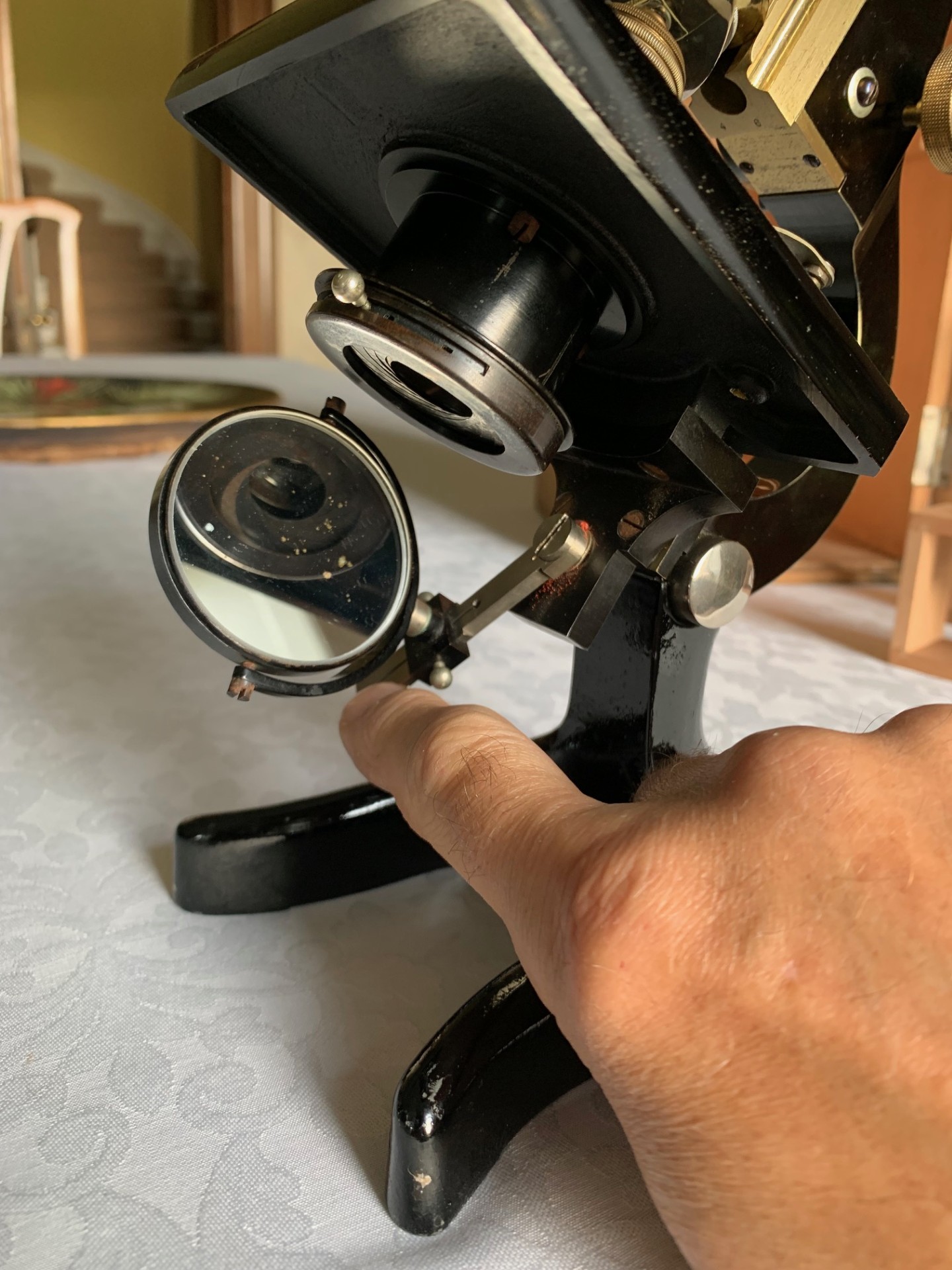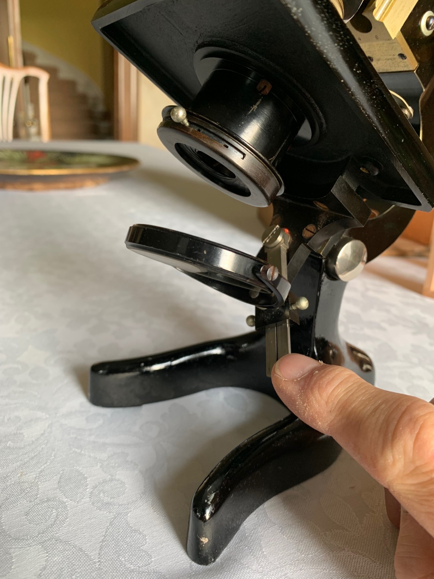 Turning to the sub-stage, we have an Abbe type condenser with iris in a friction-fit ring mount. Lighting is via a plano-concave mirror on a gimbal attached to a swinging arm as demonstrated, with period silvering that’s in excellent condition to both sides.