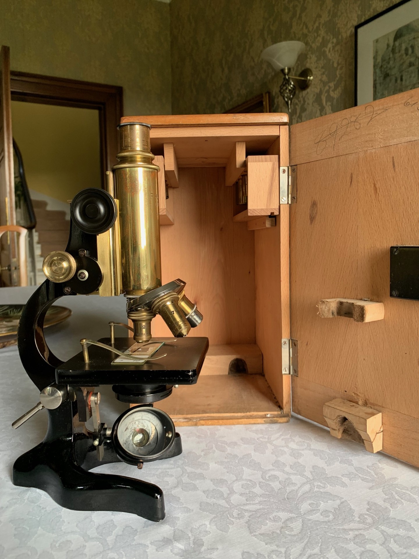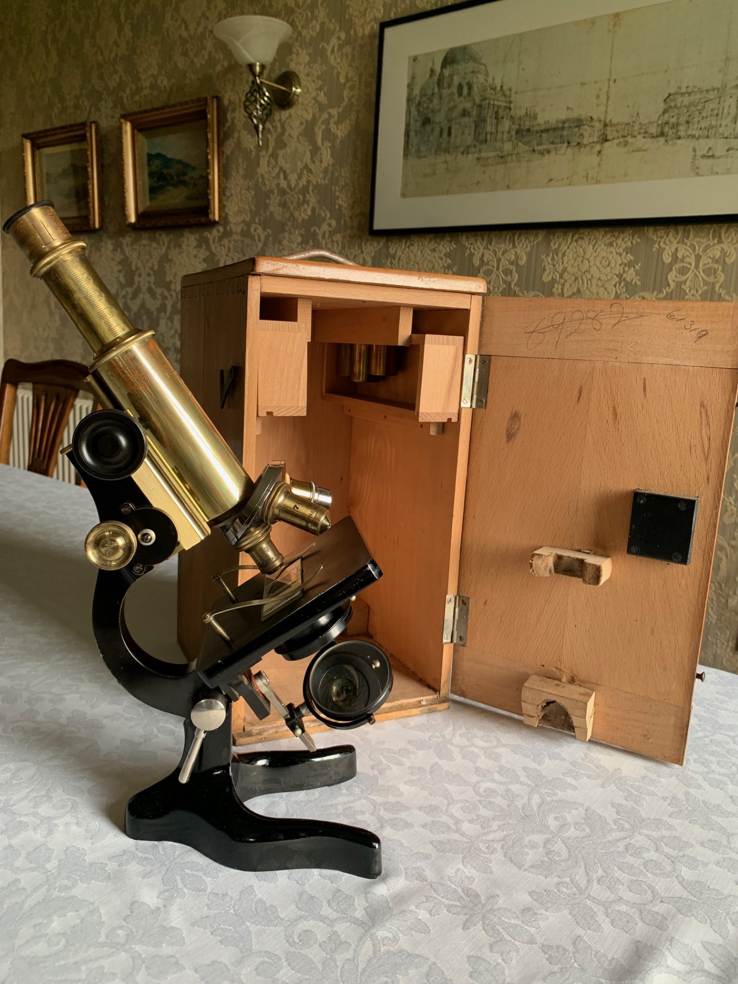 The instrument’s controls have been gently cleaned and very lightly lubricated and operate nice and smoothly. This instrument presents really well with brass-work that still catches the light and I hope that the listing photos do it justice. Overall, it’s in fine shape for its age with just the right patina for an example from this period. This instrument is essentially a collectable proposition and being of well-engineered Italian manufacture it’s quite unusual to find one of these in the UK. This example will also make a rather nice usable and display piece and will display rather fittingly in a library or home office setting, especially when set up with an appropriate antique slide.