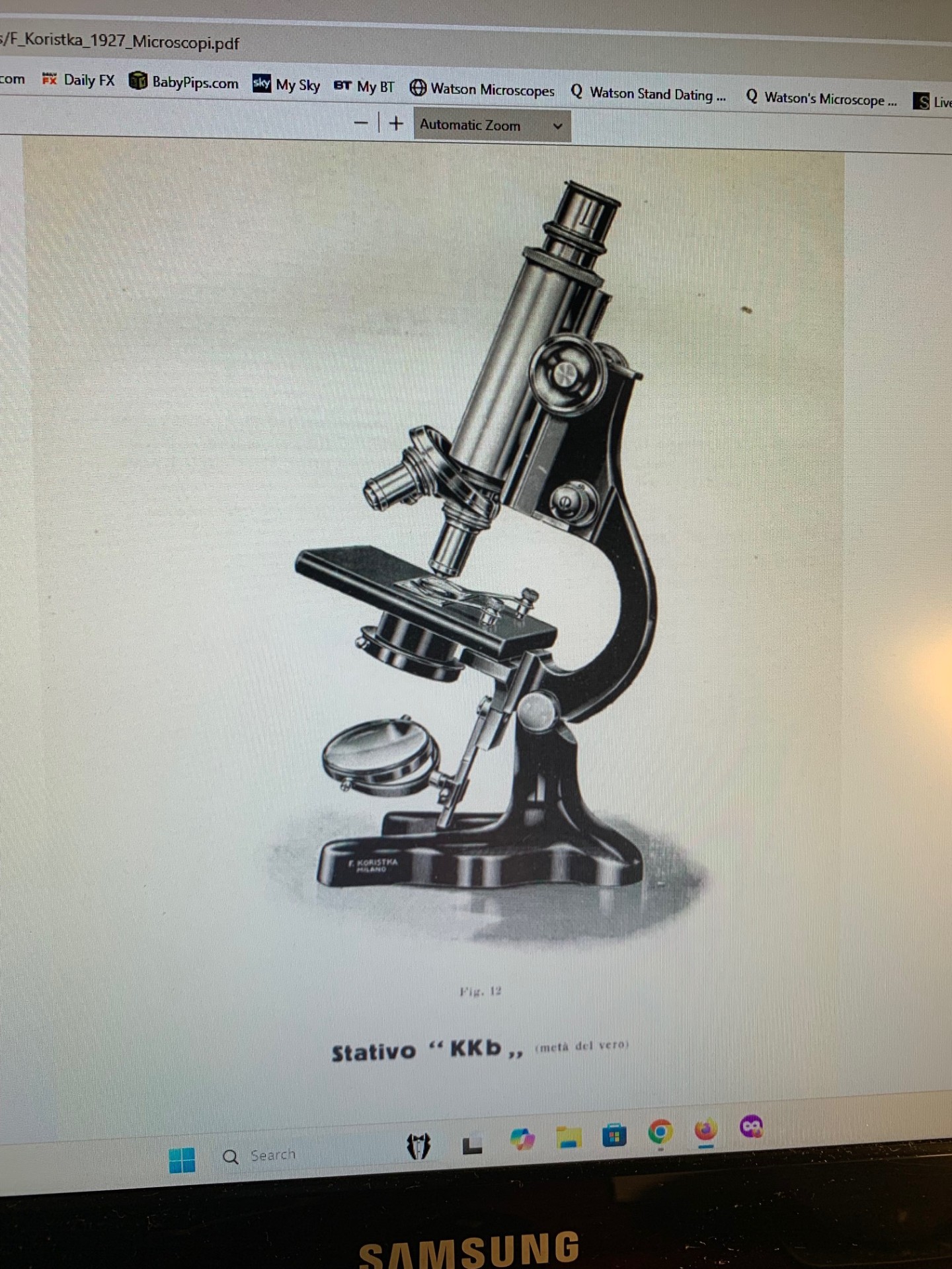 From the construction, materials and quality of workmanship, my opinion is that this instrument dates to the late 1920s, with serial number 41271. There’s an image of this exact model which is shown as “stand KKb” from Koristka’s 1927 catalogue at the very end of the listing photo stream, which supports the late 1920s dating evidence. It’s lacquered brass and black paint scheme are in decent period condition, with some signs of tarnishing to the brass-work, but the overall look it about right for the period. All in all this is a quality instrument and a good collectable example of its period and type and being of Italian manufacture, it’s quite rare to find one of these in the UK.