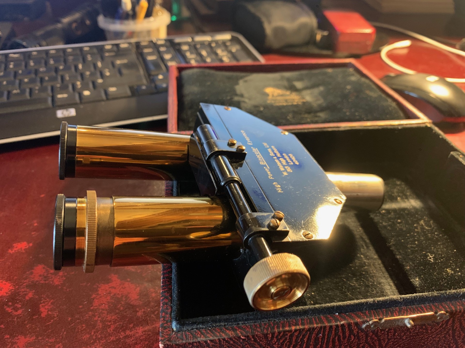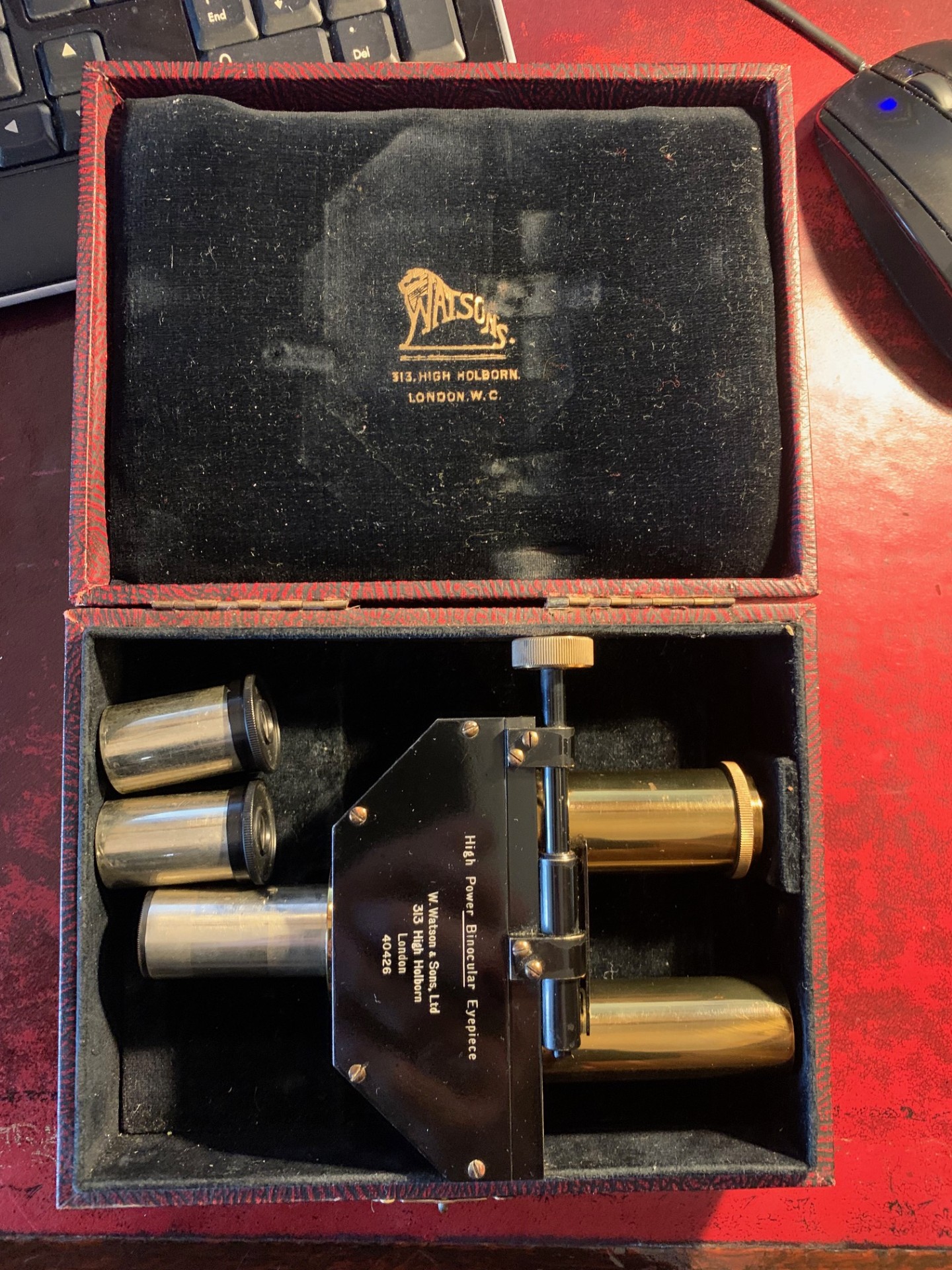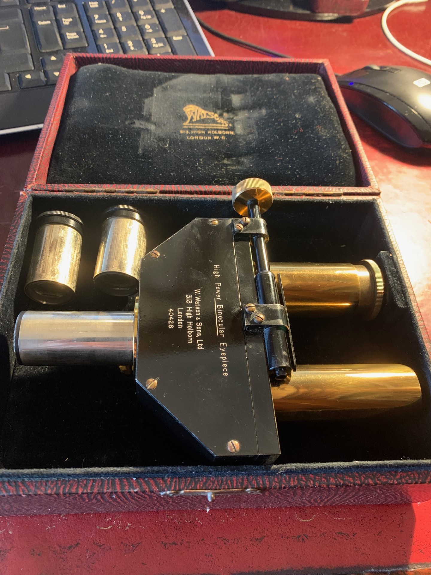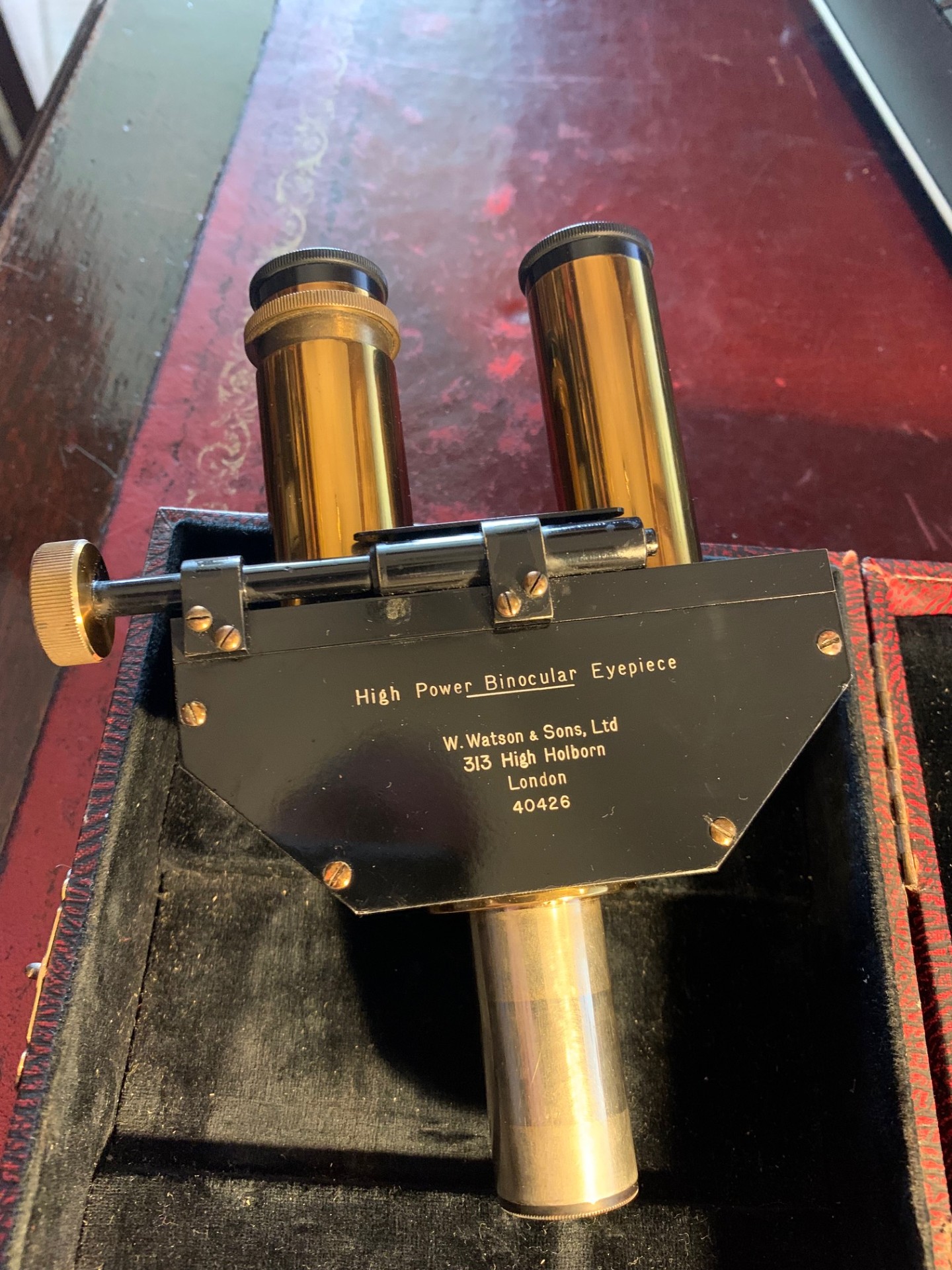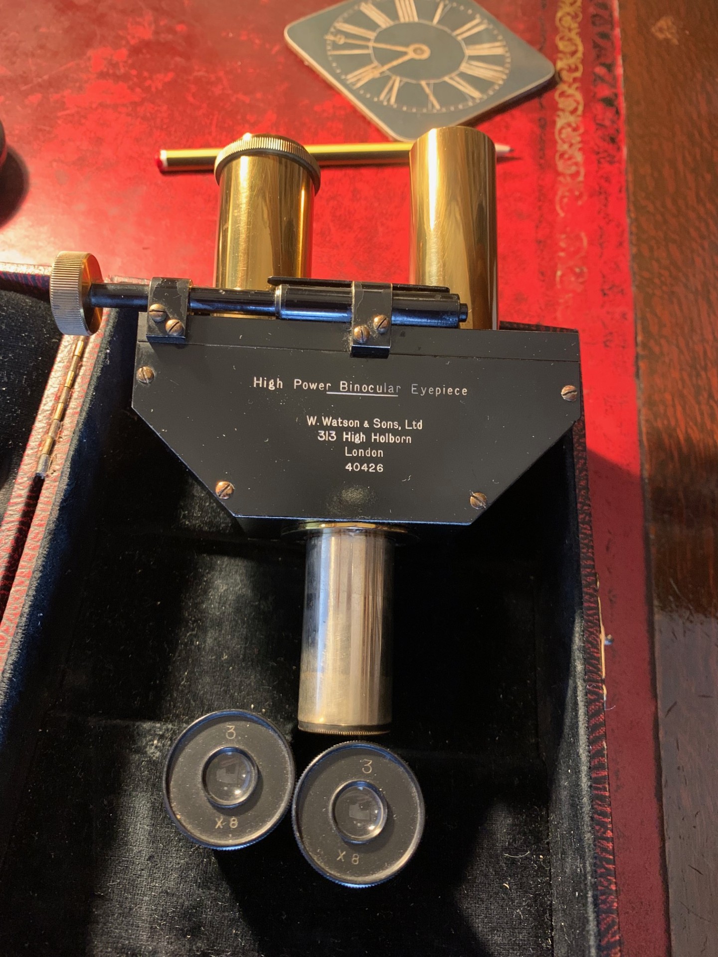 Offered for sale is an excellent condition Watson microscope binocular head in brass probably dating to around the 1930s. With pretty clean optics for the age of the item, good brass-work and generally very good black paintwork, with few signs of use. Fits a standard 23mm eyepiece tube and there’s a lock nut mechanism to tighten into place. Also comes with two Watson 8x magnification eyepieces as shown, these have the correct collars fitted.