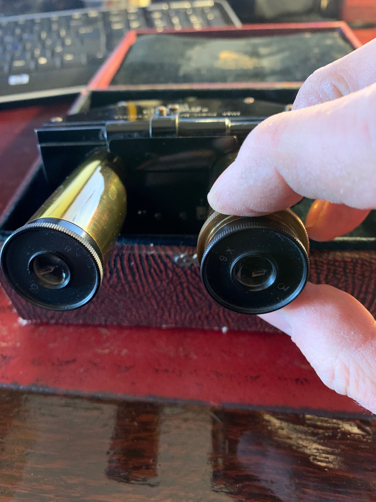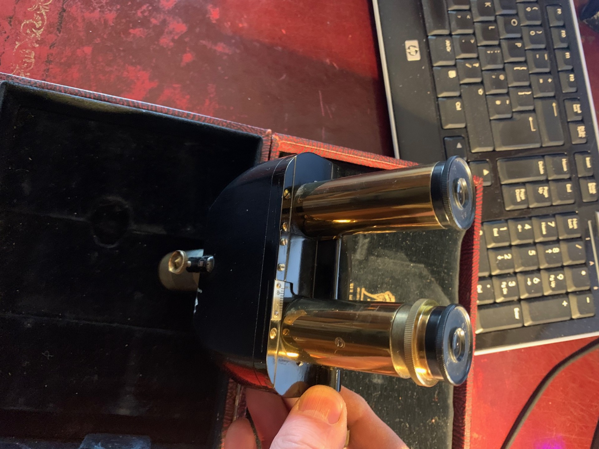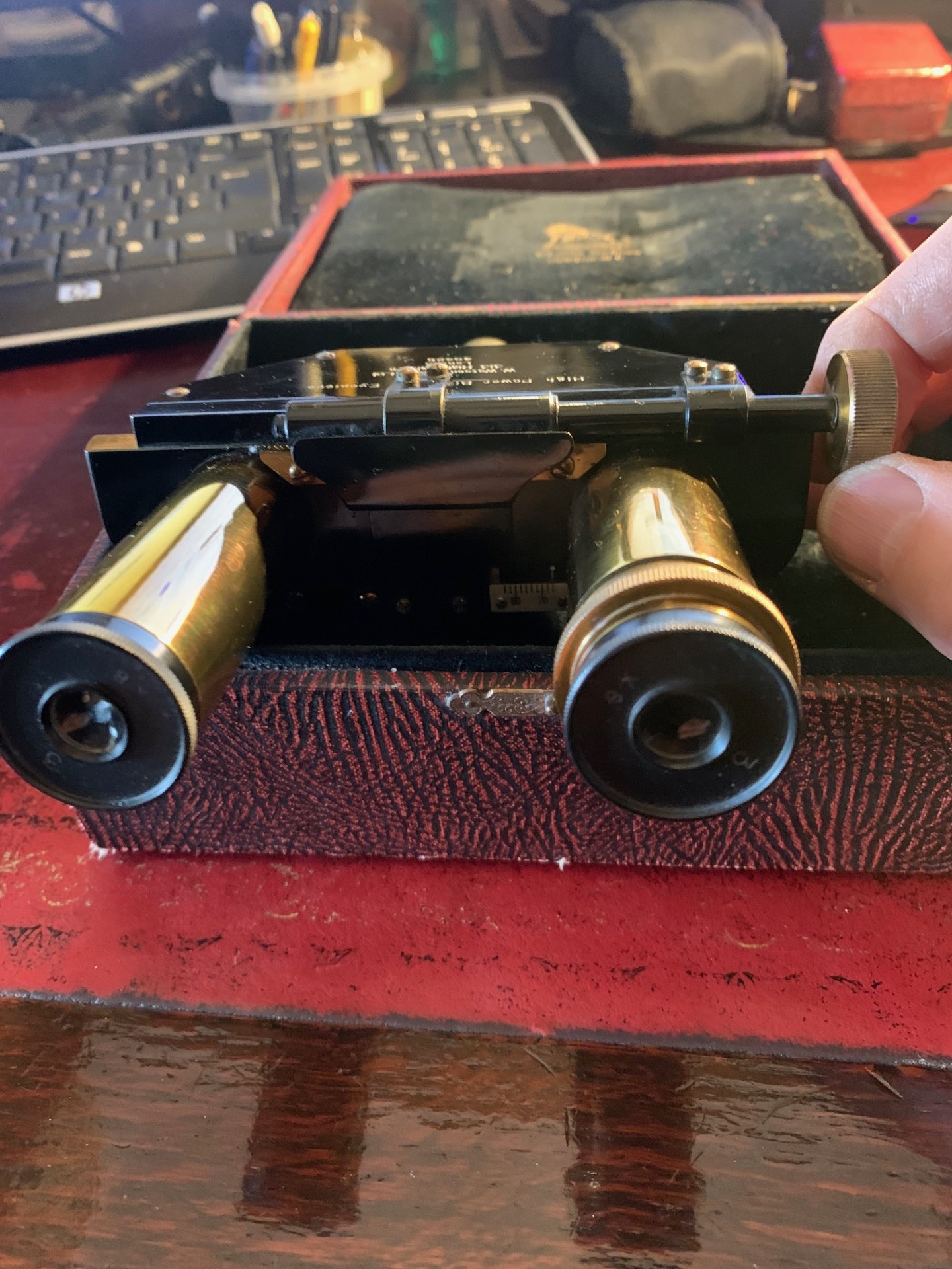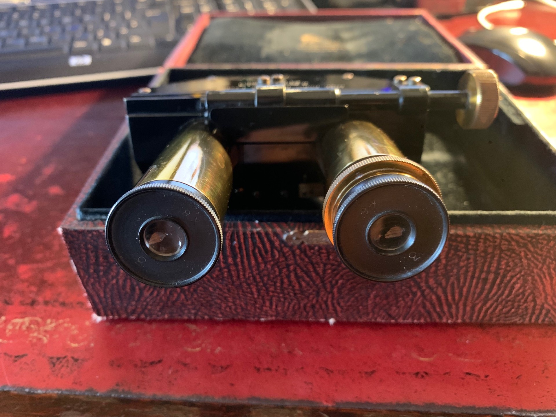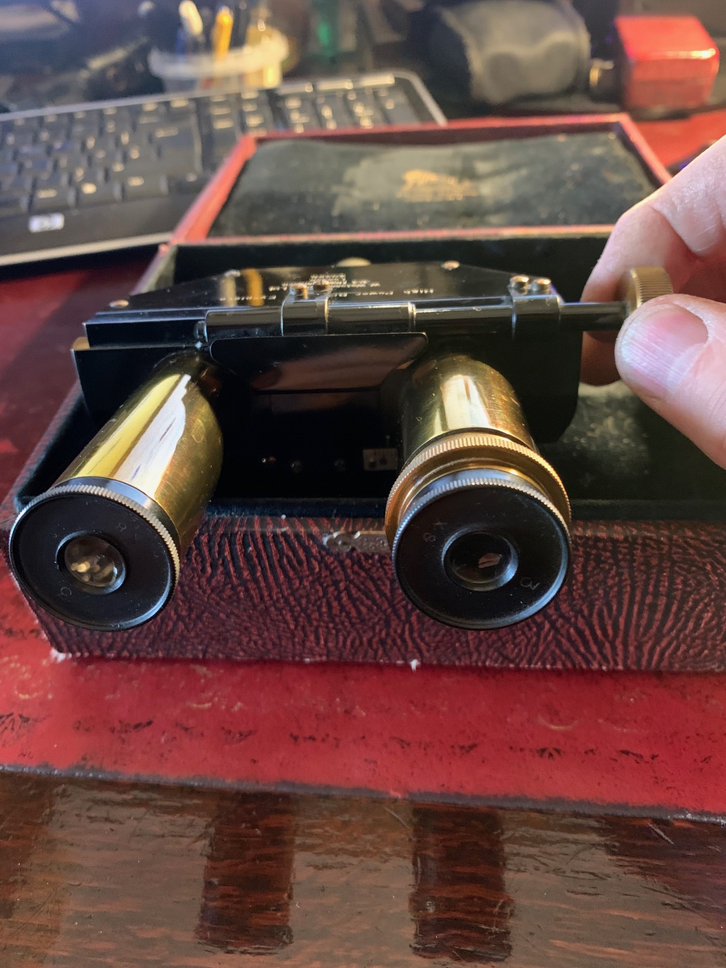 Offered for sale is an excellent condition Watson microscope binocular head in brass probably dating to around the 1930s. With pretty clean optics for the age of the item, good brass-work and generally very good black paintwork, with few signs of use. Fits a standard 23mm eyepiece tube and there’s a lock nut mechanism to tighten into place. Also comes with two Watson 8x magnification eyepieces as shown, these have the correct collars fitted.