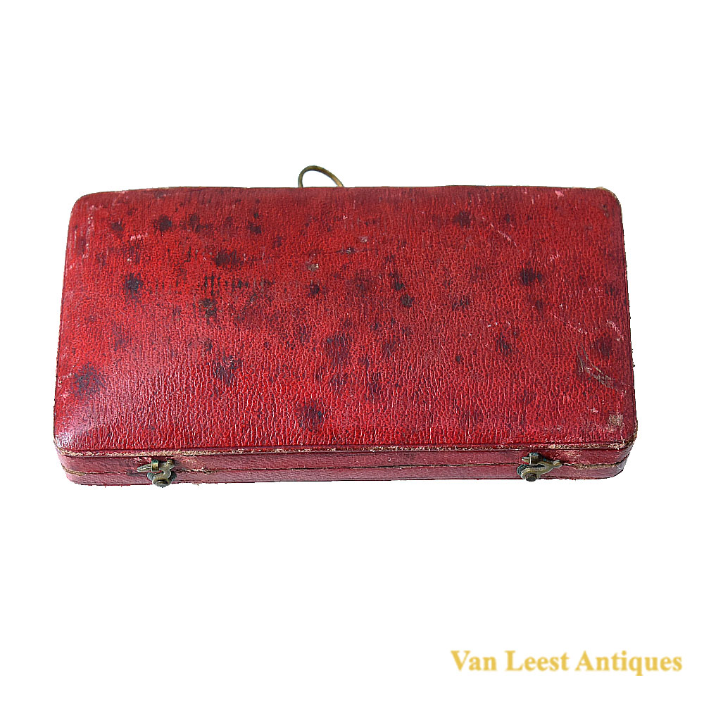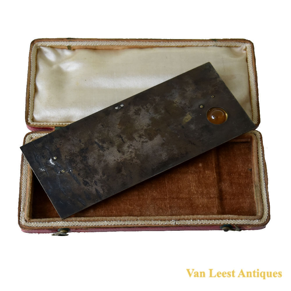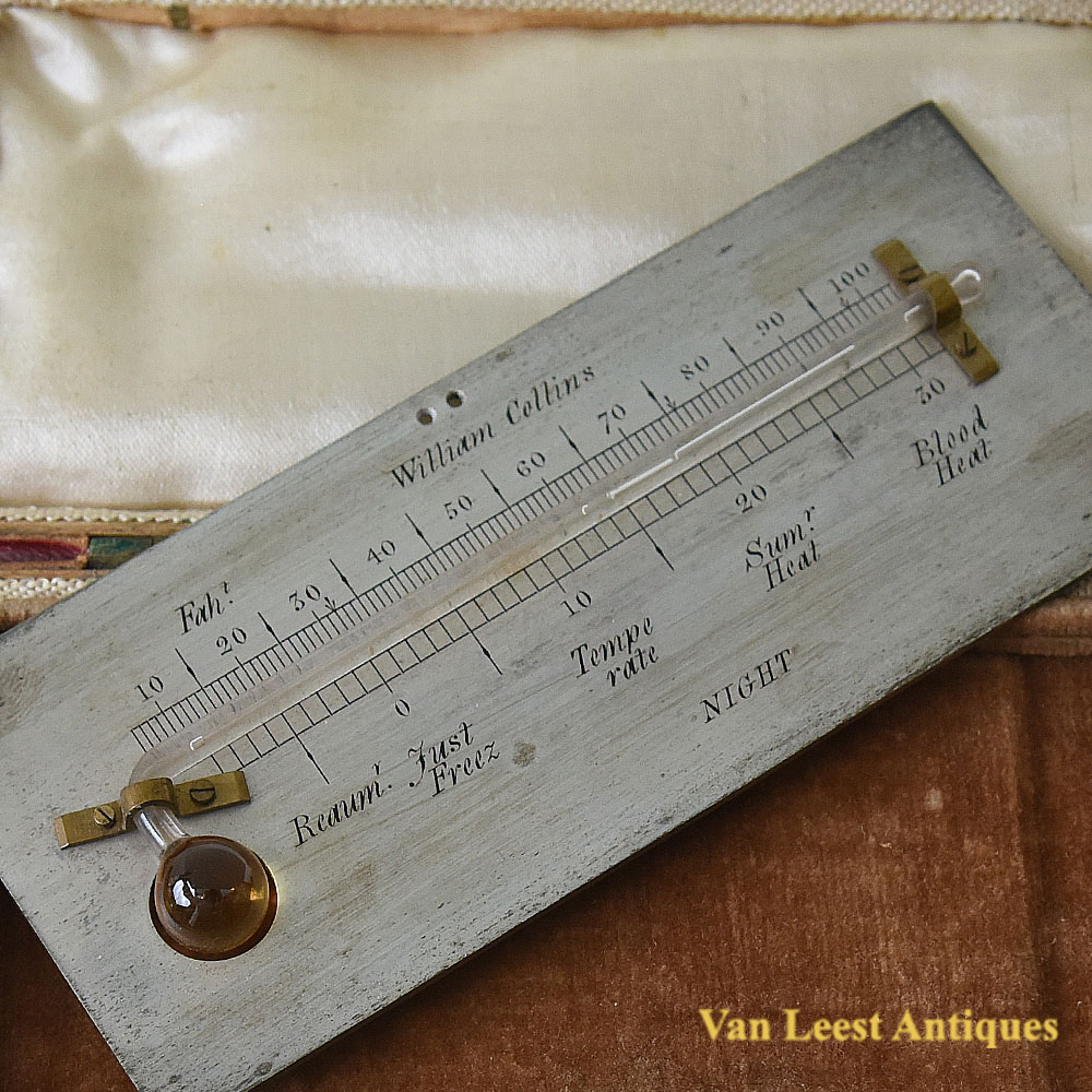 English, c.1840, engraved ‘William Collins’ thermometer glass mounted on silvered brass plate engraved in Ferenheight, scale further engraved ‘Reaumr, Just Freex, Temperate, Sum’r Heat, Blood Heat and NIGHT’, glass containing alcohol, case lined with cream silk and velvet covered in red Moroccan leather with brass suspension loop, catches and hinges, case measurements 11 x 5,5 x 2 cm.